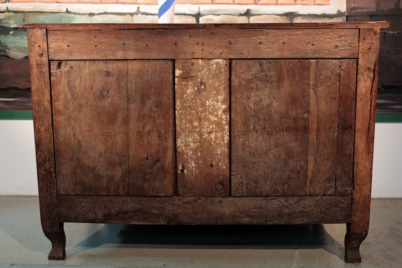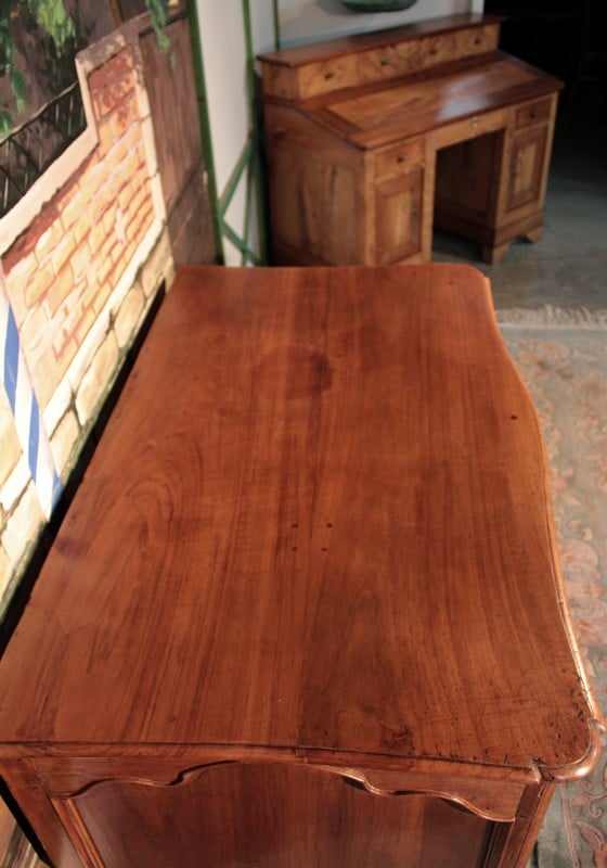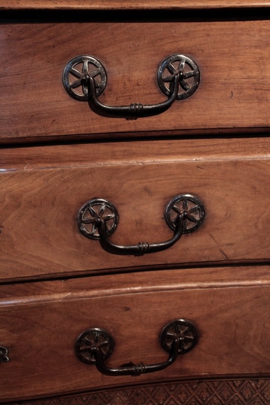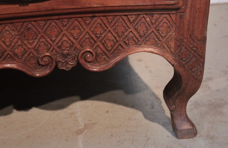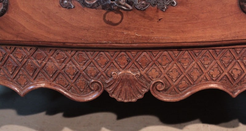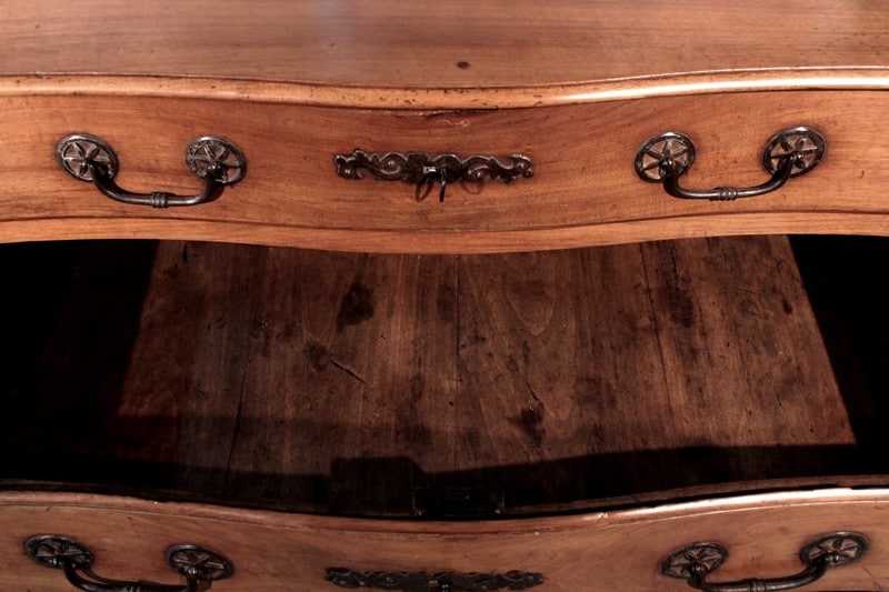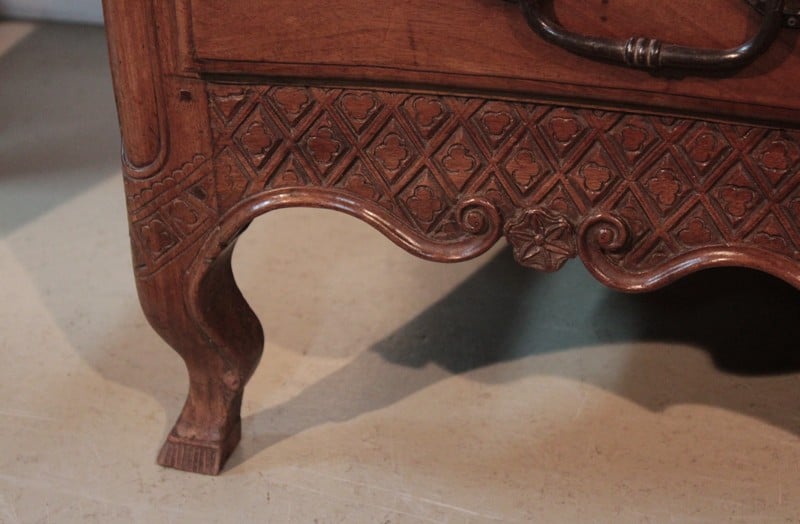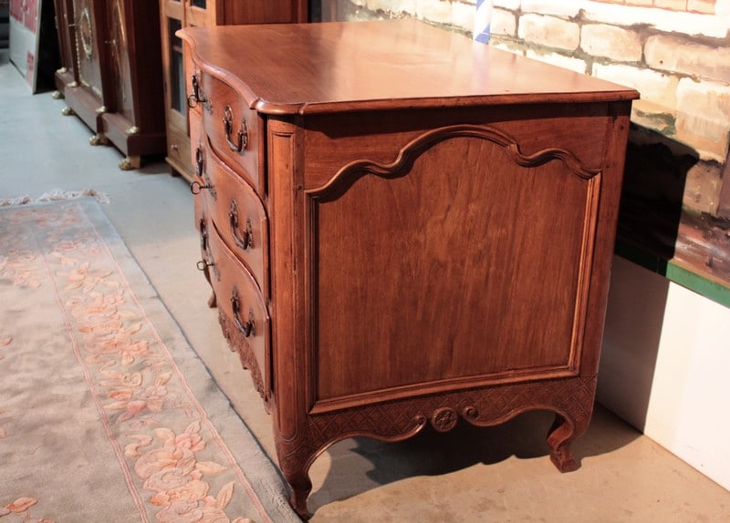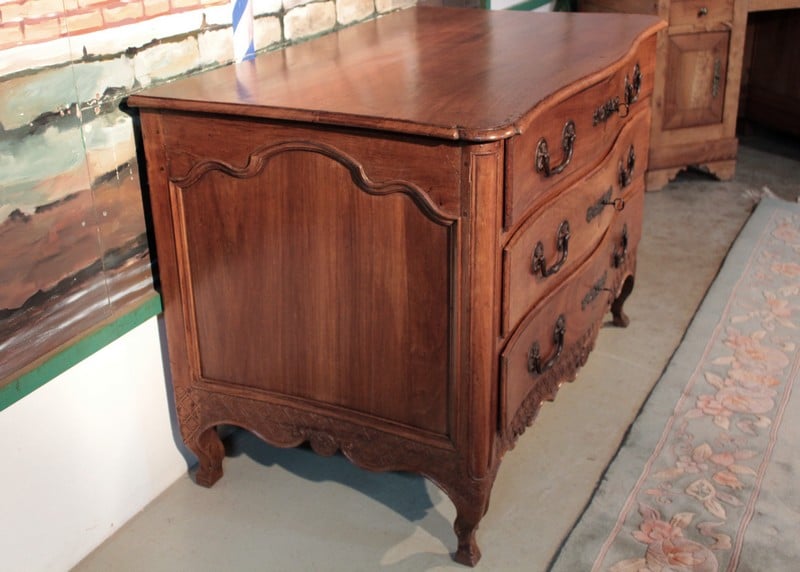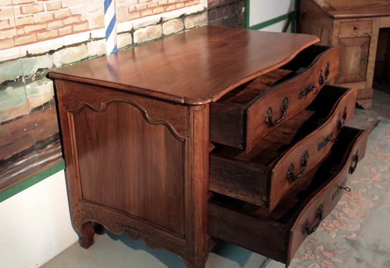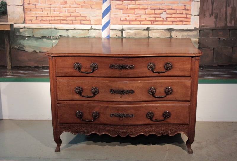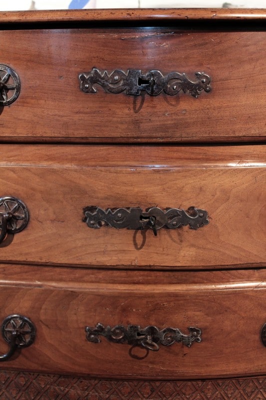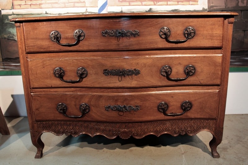 Très belle commode Louis XIV – Louis XV en Noyer dans le goût des meubles de port – Région de La Rochelle – ouvrant par 3 tiroirs. Façade en arbalète et côtés découpés à mouvement concave. Son plateau d’origine a subi quelques restaurations (arrière gauche). Sa traverse chantournée est décorée de petites sculptures de trèfles , de losanges et de fleurs. Les montant arrondis reposent sur des pieds en sabot de biche. Époque XVIIIe siècle.