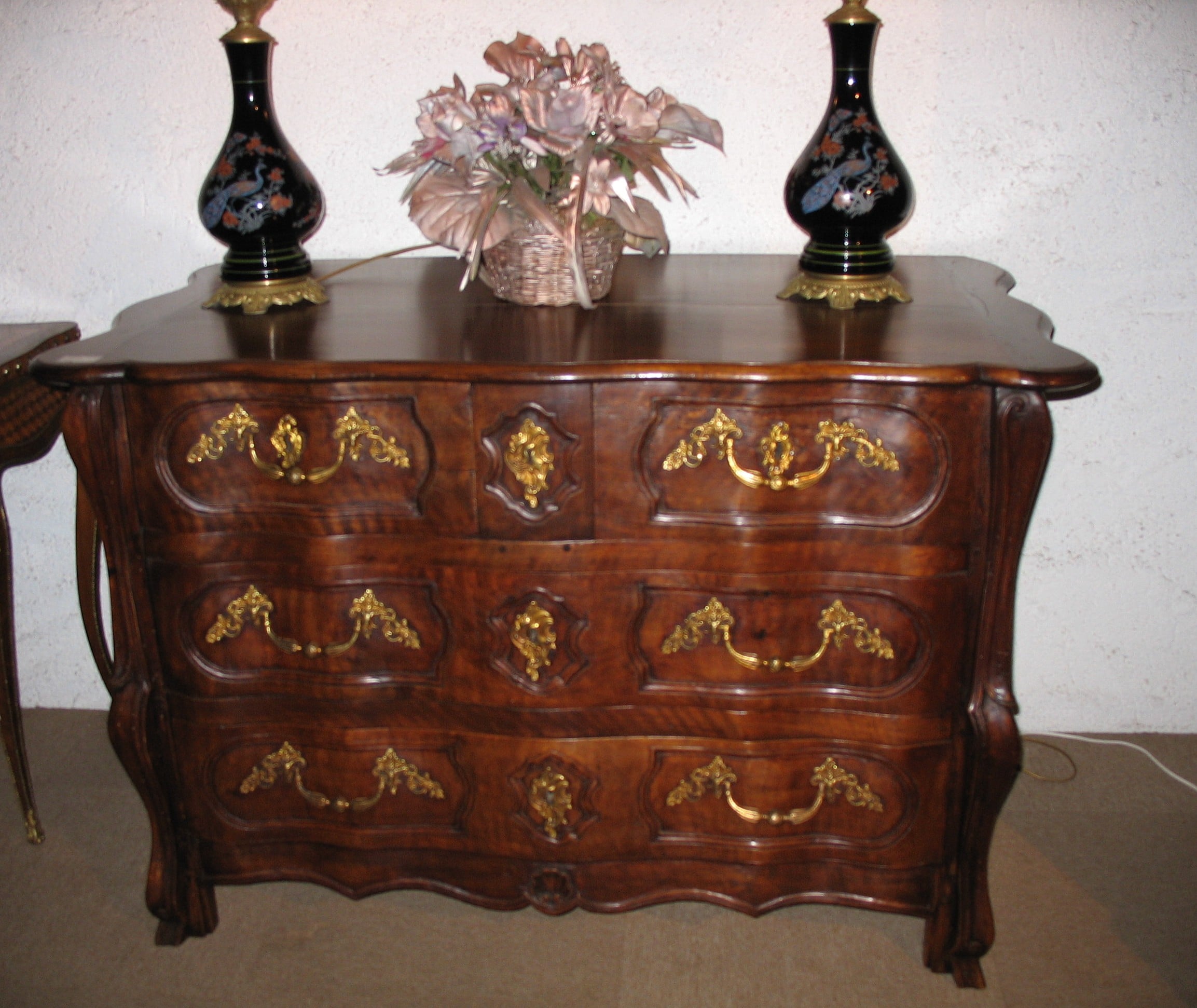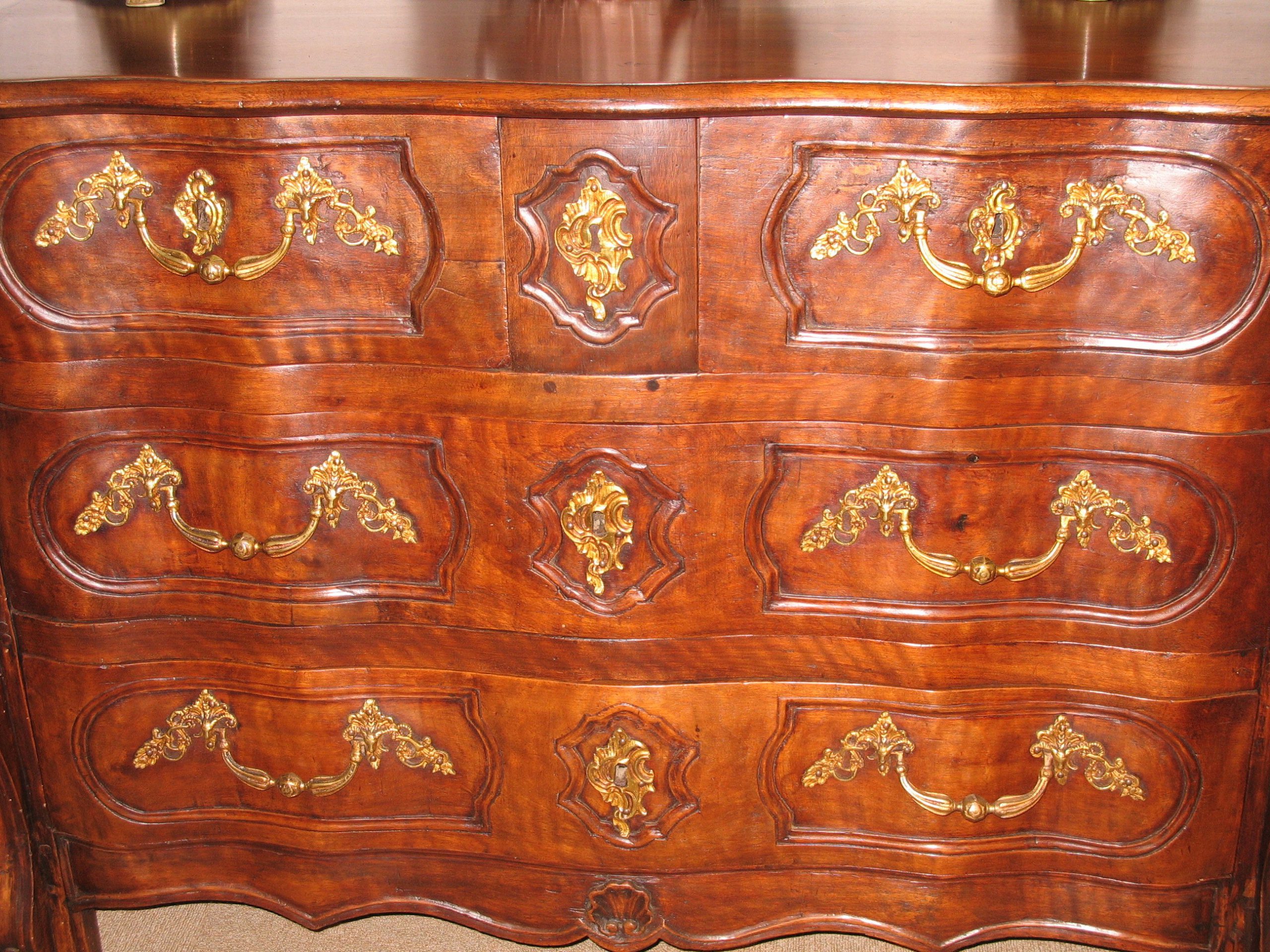 Riche commode Louis XIV/Louis XV en noyer et hêtre de la fin du XVIIIe siècle.