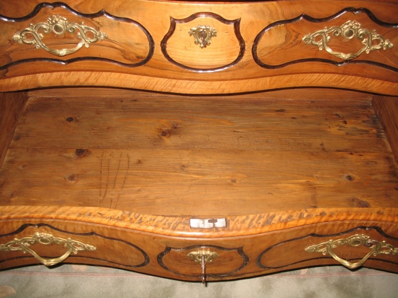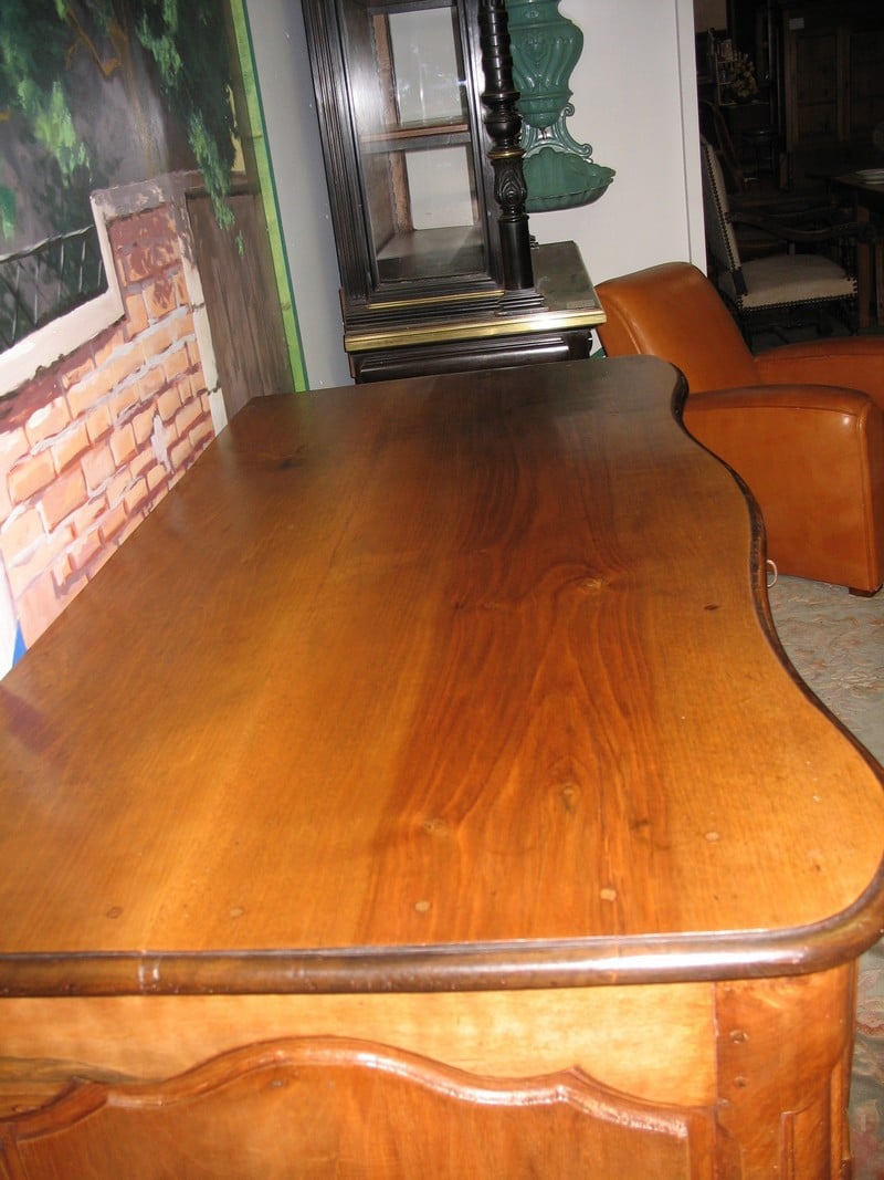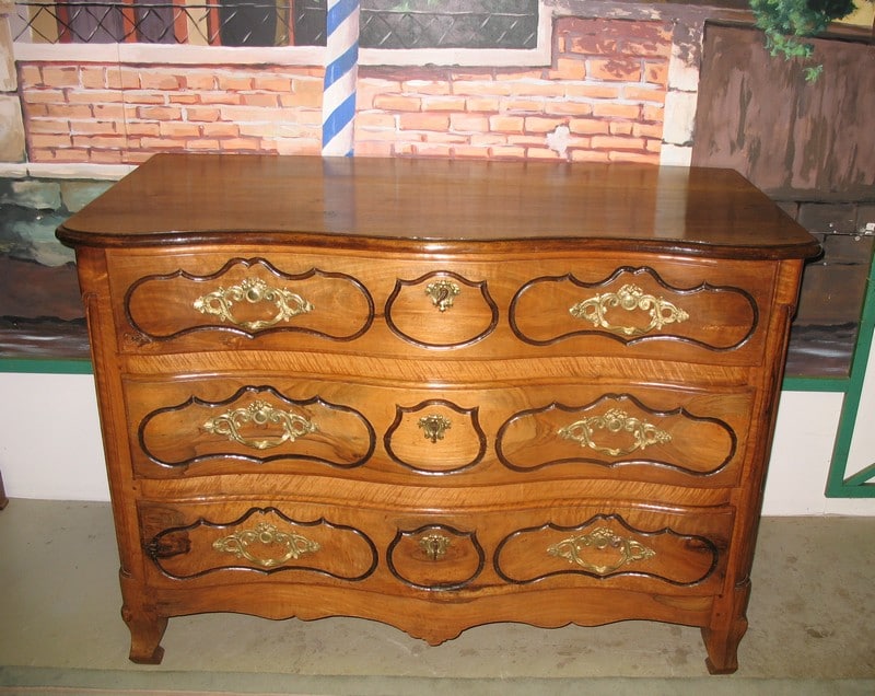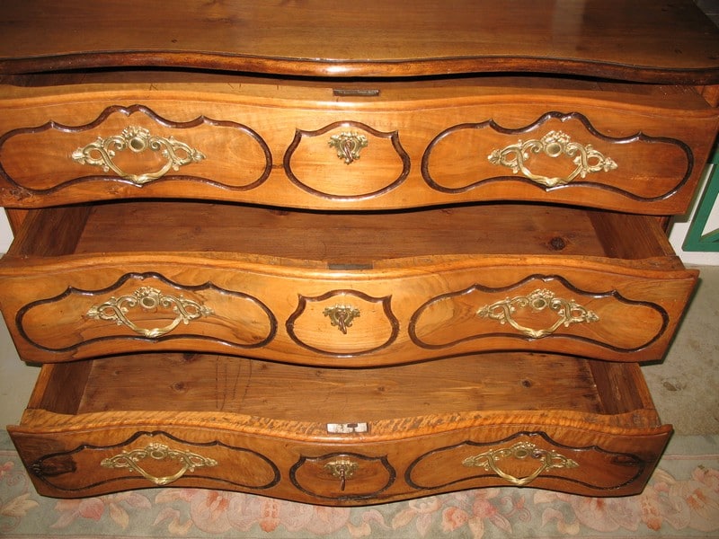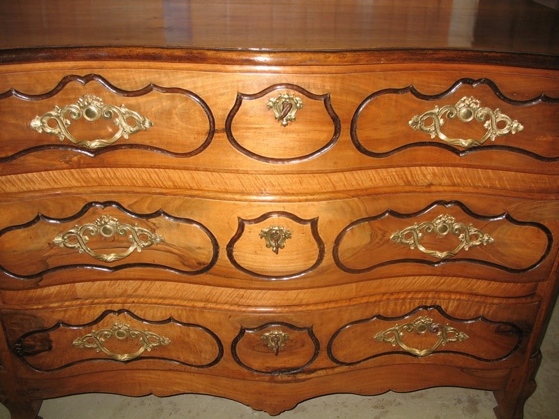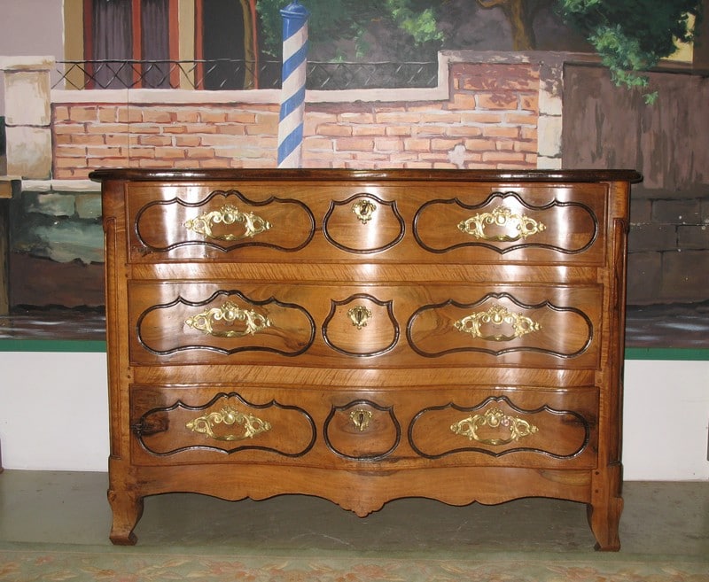 Magnifique Commode régionale Louis XV à arbalète en noyer massif ouvrant à 3 tiroirs. Ses poignées et entrées de serrures en bronze sont d’origine. Le dessus est constitué de 2 planches et les côtés sont à découpe Louis XIV. Fonds de tiroirs en sapin.