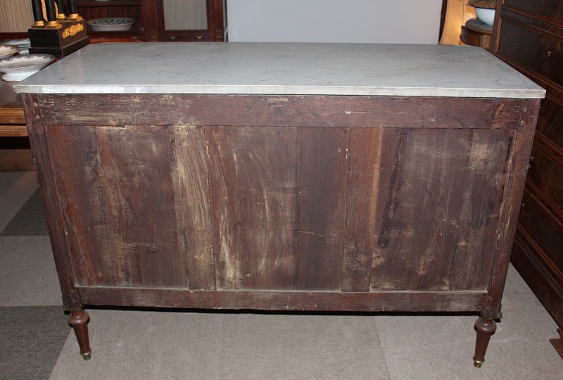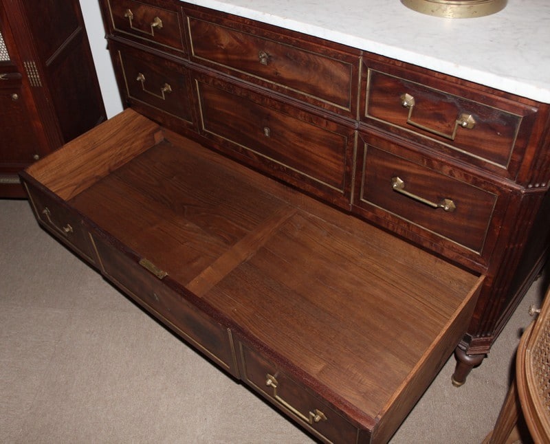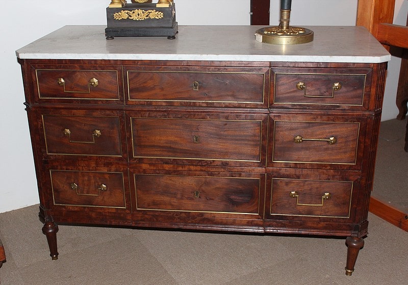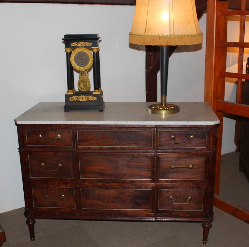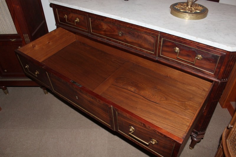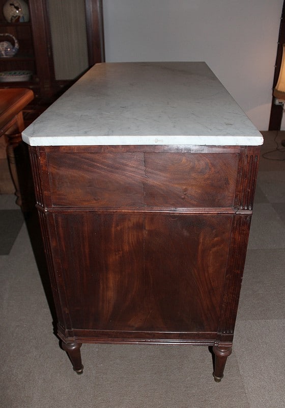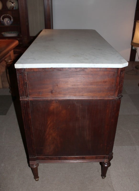Commode Louis XVI en acajou, avec dessus de marbre blanc.