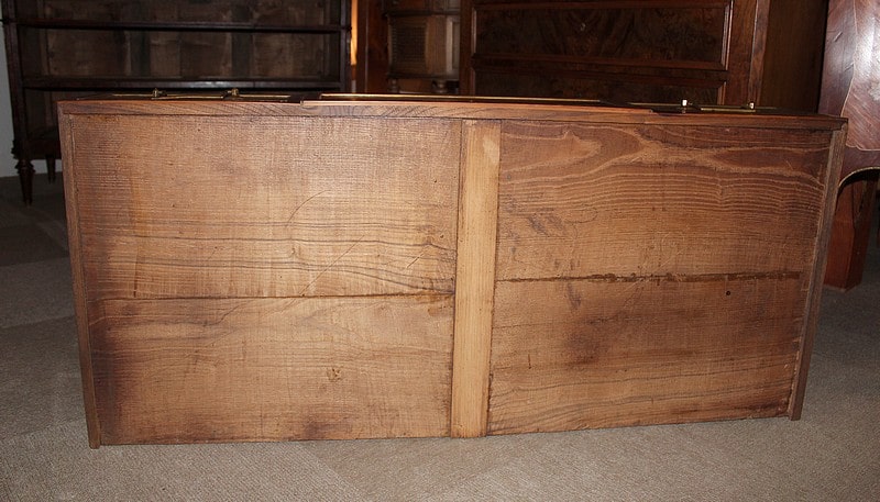 Elle ouvre à trois tiroirs, le premier divisé en 3 compartiments. Ils sont séparés par des ‘cache-poussière’, et les intérieurs (fonds et côtés) sont en chêne.