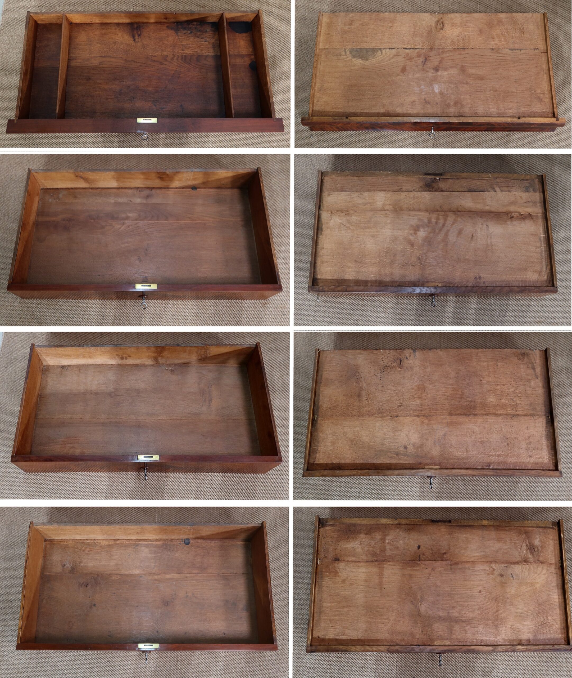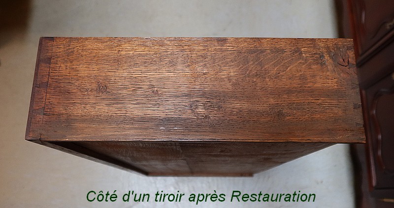 Pour finir, l’intérieur de cette commode psyché, restaurée par notre atelier dans les règles de l’art, possède des tiroirs dont les côtés et les fonds sont en chêne.