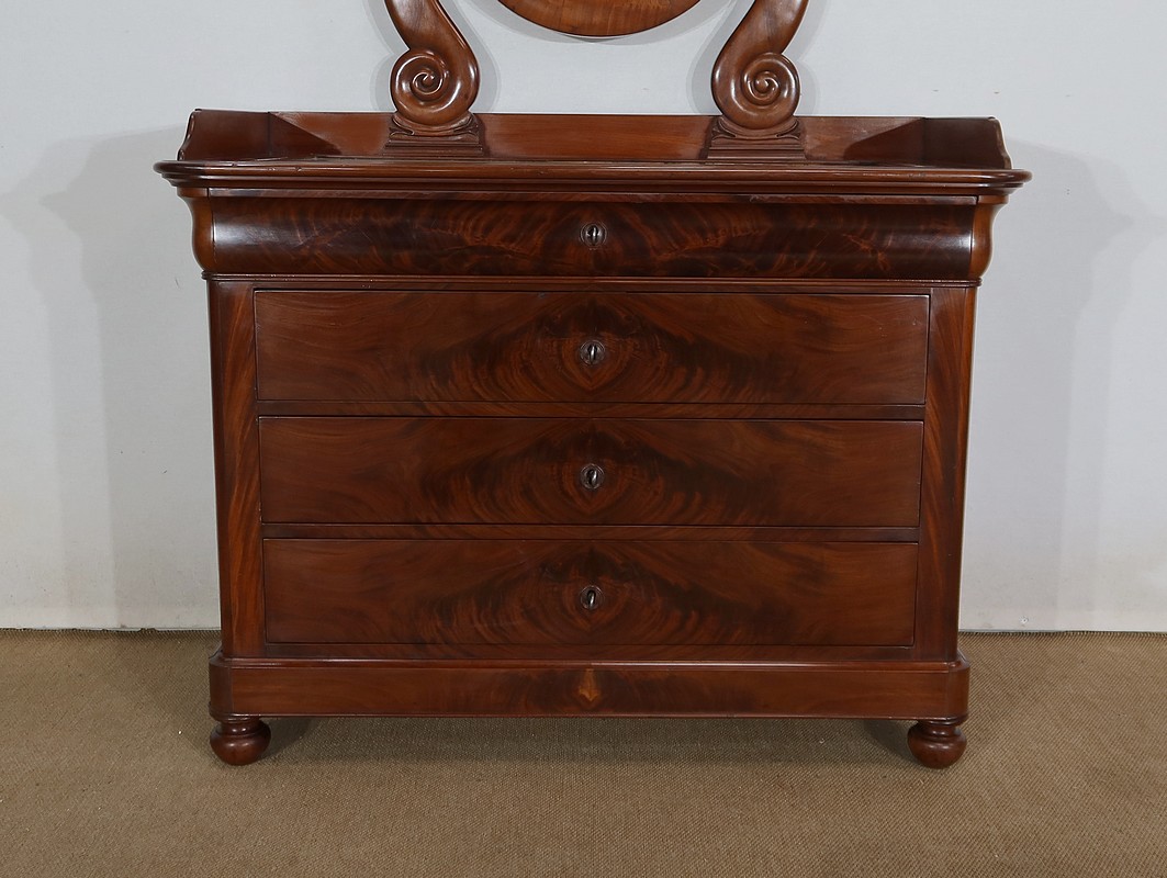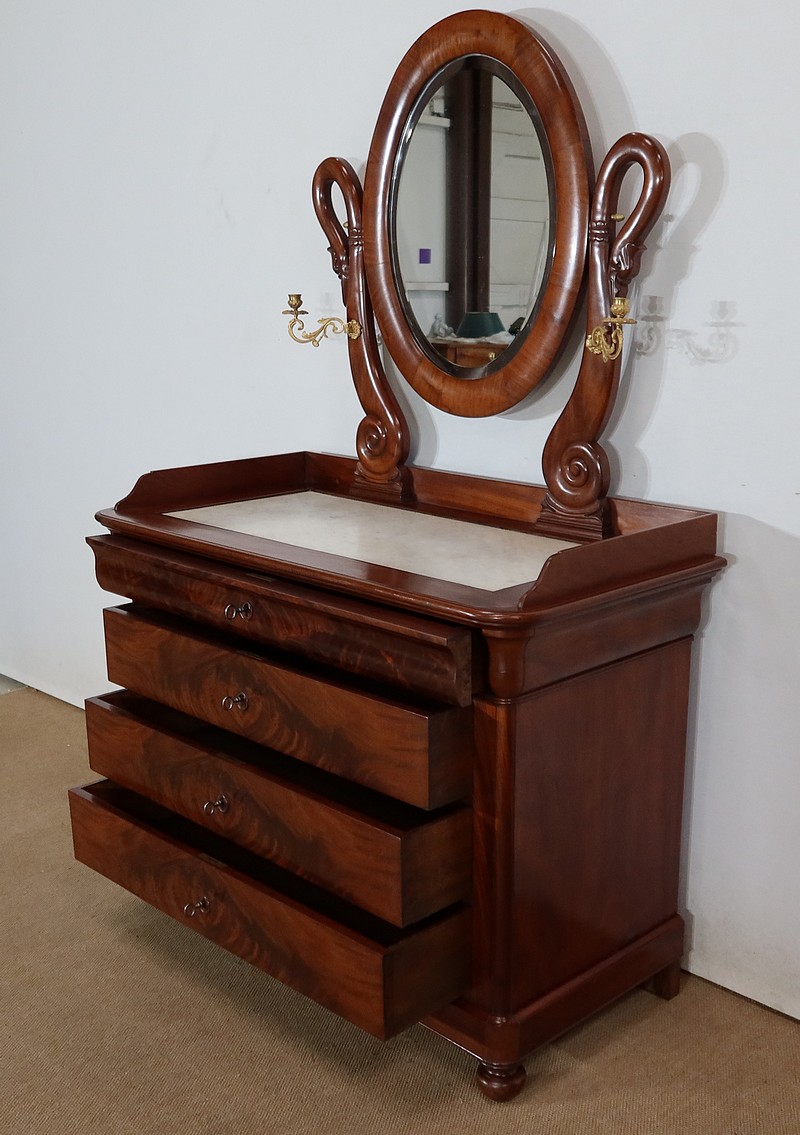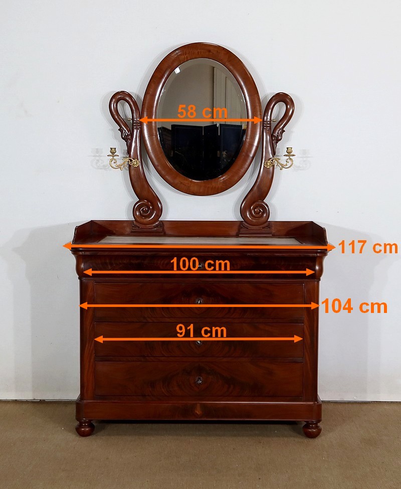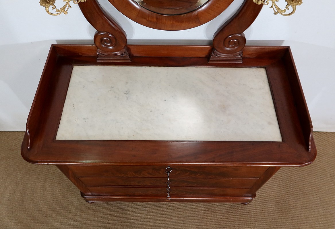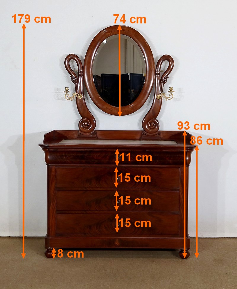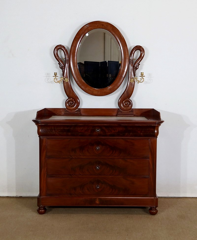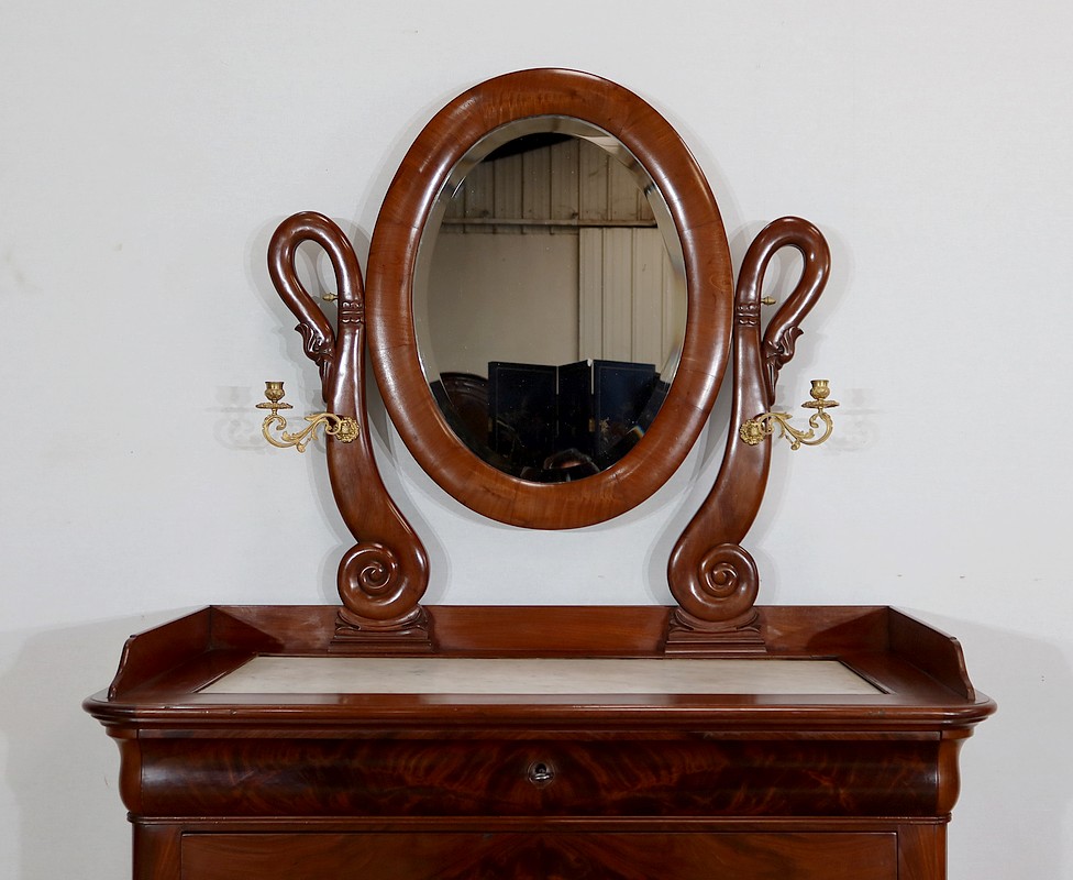 Belle commode en placage d’acajou de Cuba surmontée d’une importante psyché.