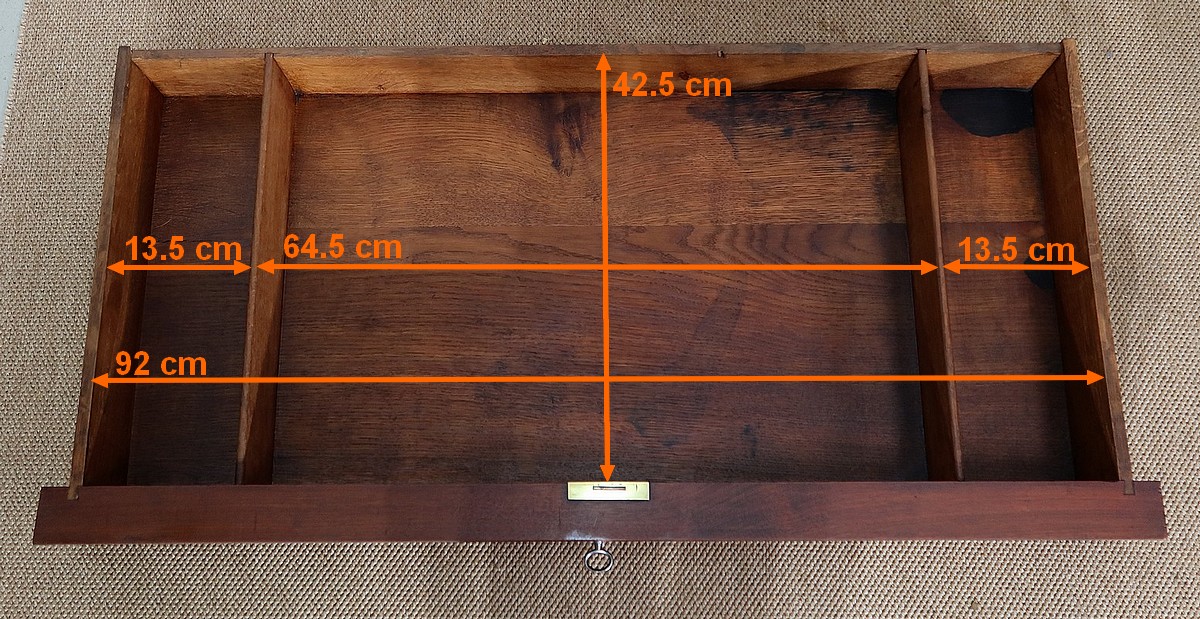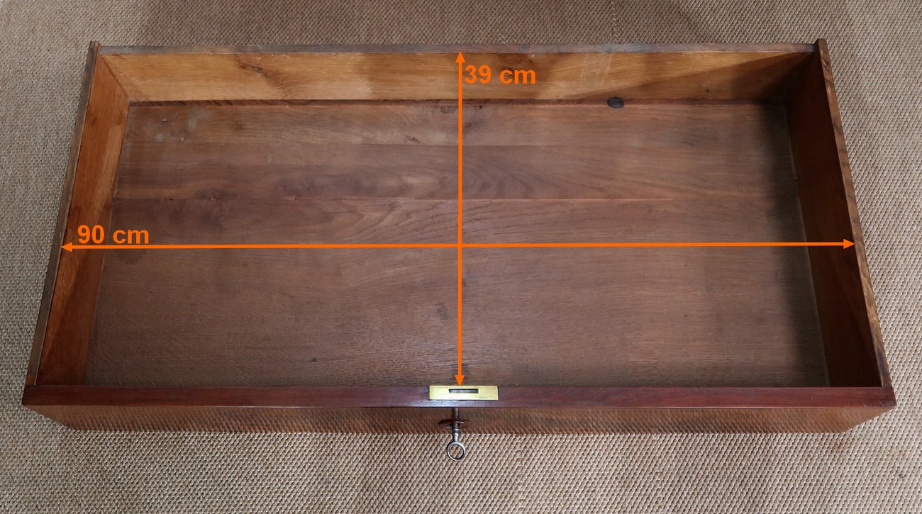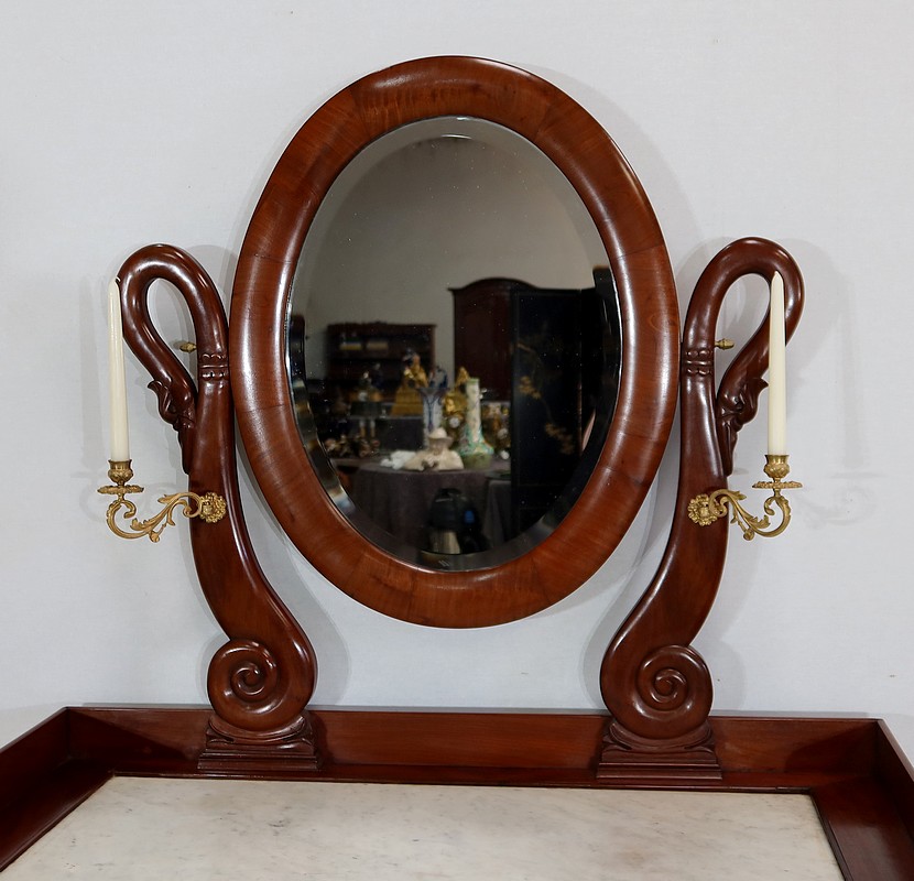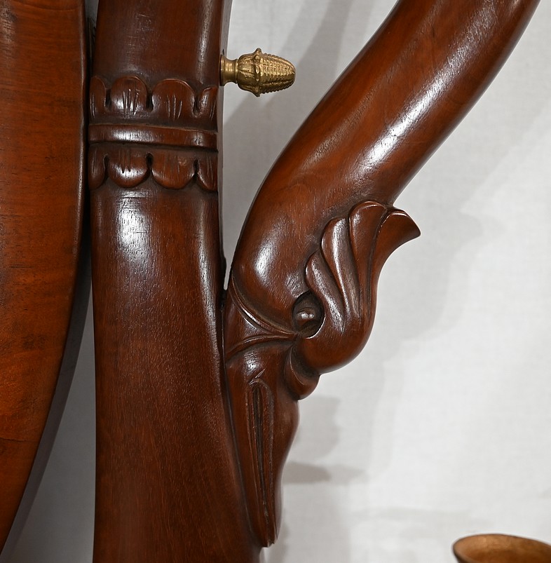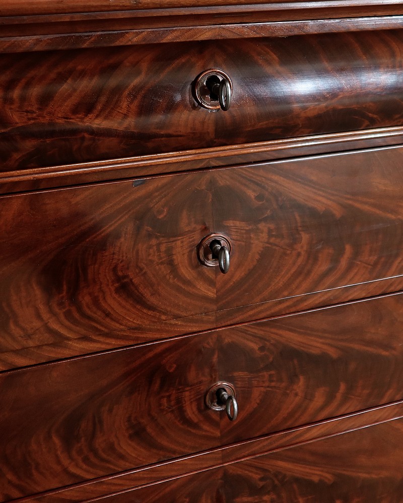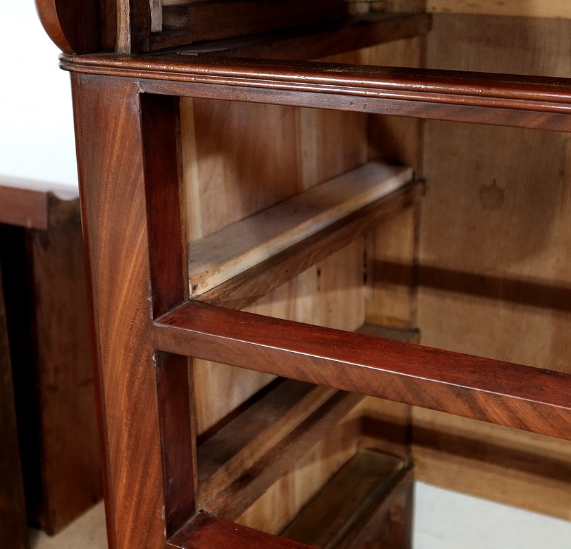 Ce meuble, alliant le raffinement d’une coiffeuse et la capacité de rangement d’une commode élégante d’époque Restauration, est composé en ceinture d’un tiroir à mouvement, puis de trois grands tiroirs identiques. Chaque façade possède un placage de ronce d’acajou assemblé en livre ouvert, mettant en valeur le veinage et les teintes profondes de cette essence de bois rare. Sur chaque tiroir, nous retrouvons une entrée en bois sculpté et une serrure d’origine accompagnée de sa clé ajustée.