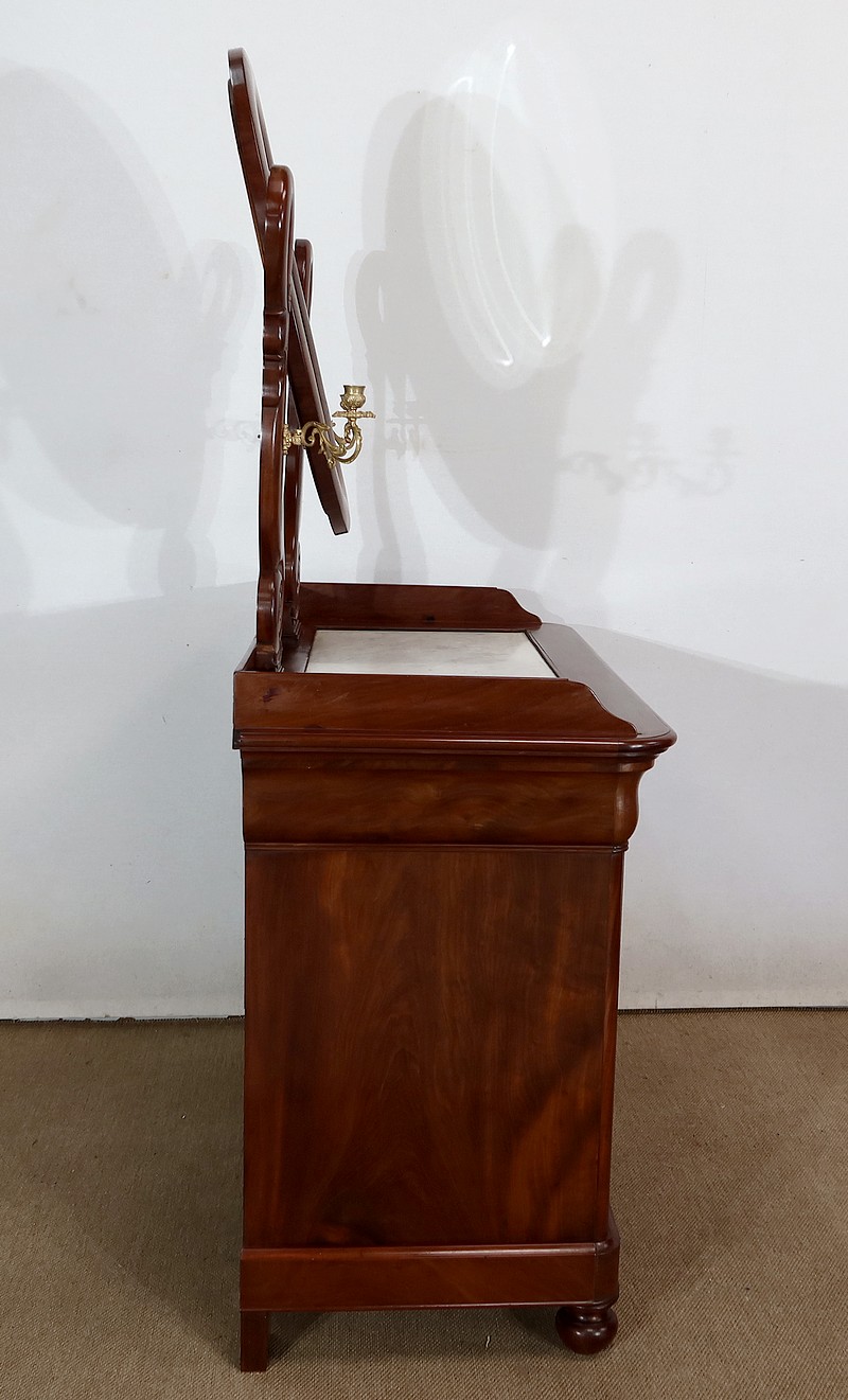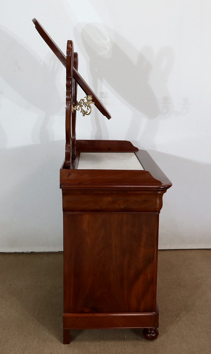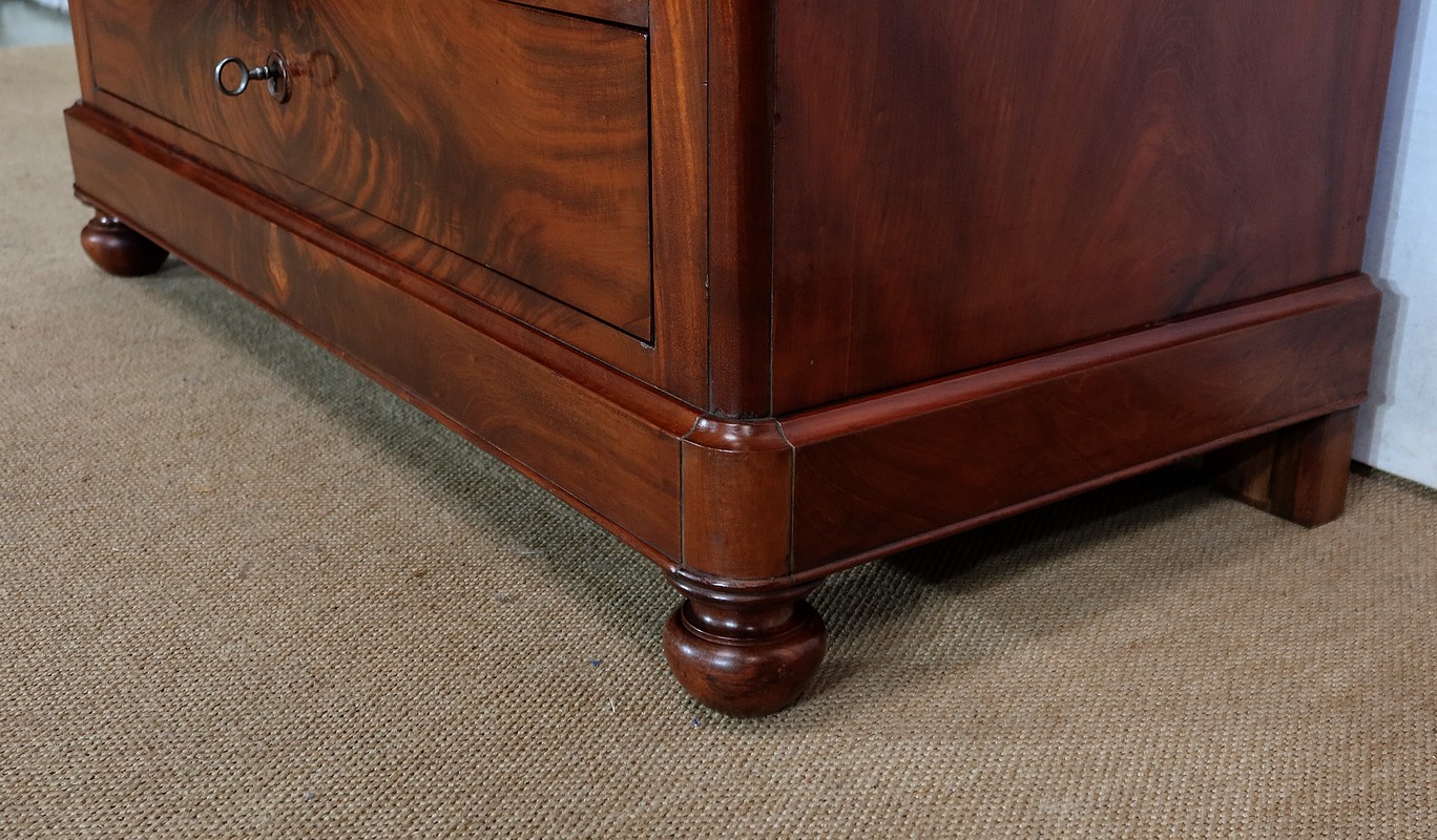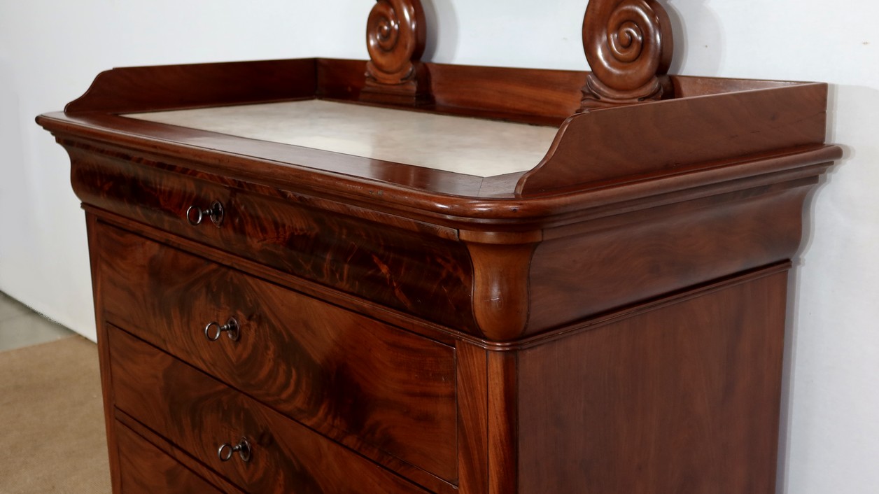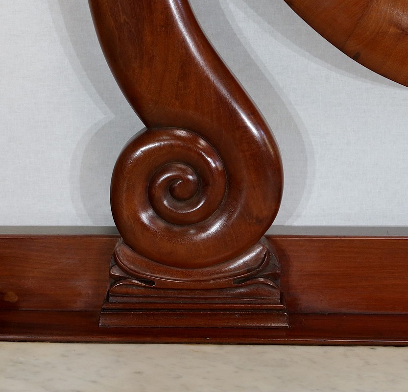 Ce meuble, alliant le raffinement d’une coiffeuse et la capacité de rangement d’une commode élégante d’époque Restauration, est composé en ceinture d’un tiroir à mouvement, puis de trois grands tiroirs identiques. Chaque façade possède un placage de ronce d’acajou assemblé en livre ouvert, mettant en valeur le veinage et les teintes profondes de cette essence de bois rare. Sur chaque tiroir, nous retrouvons une entrée en bois sculpté et une serrure d’origine accompagnée de sa clé ajustée.