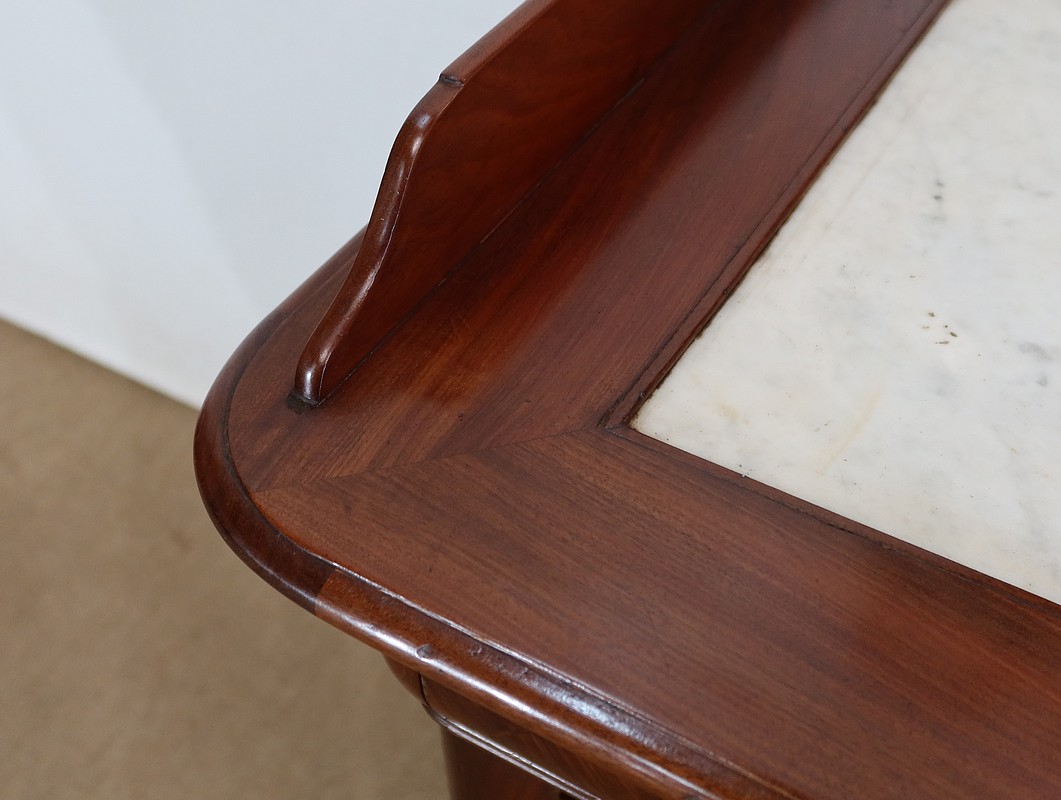 Le dessus de cette commode comporte un encadrement en acajou massif à coupe d’onglet. Le pourtour est accompagné d’une moulure en demi-rond allongé. Au centre et en réserve, nous retrouvons un marbre blanc veiné de gris. Enfin, de chaque côté et à l’arrière, repose sur le dessus une bande bois se terminant par une moulure.