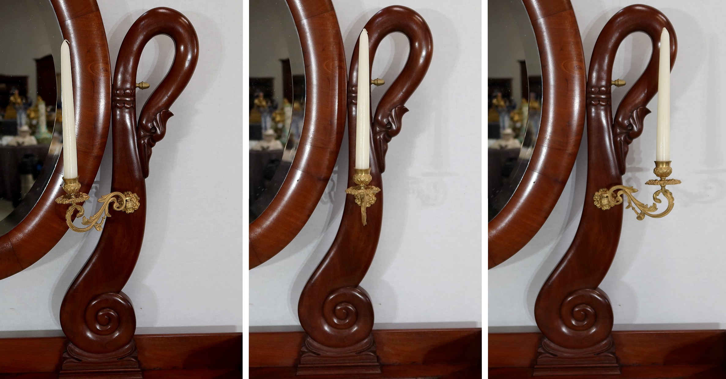 De chaque côté, deux éléments découpés en forme, dont le bas est constitué d’une large volute en partie basse s’affinant et se profilant vers le haut en col de cygne. Chacun possédant une applique à bougie en bronze.