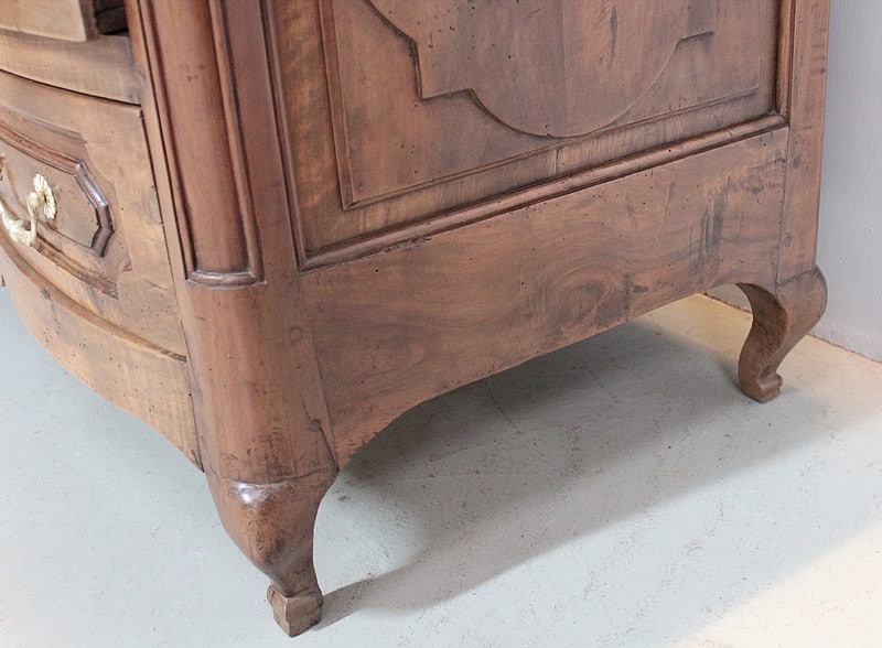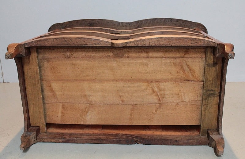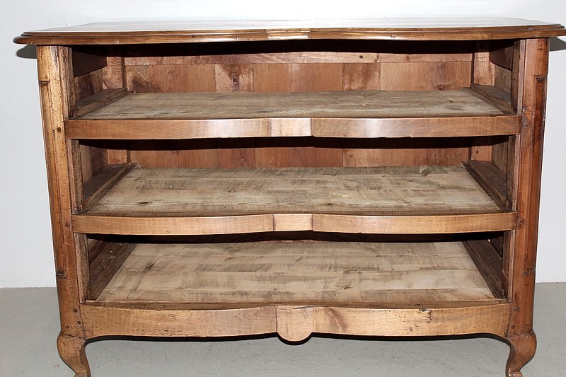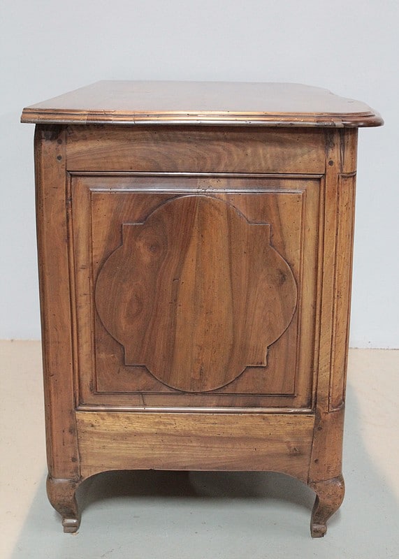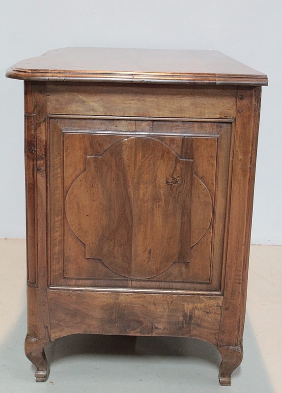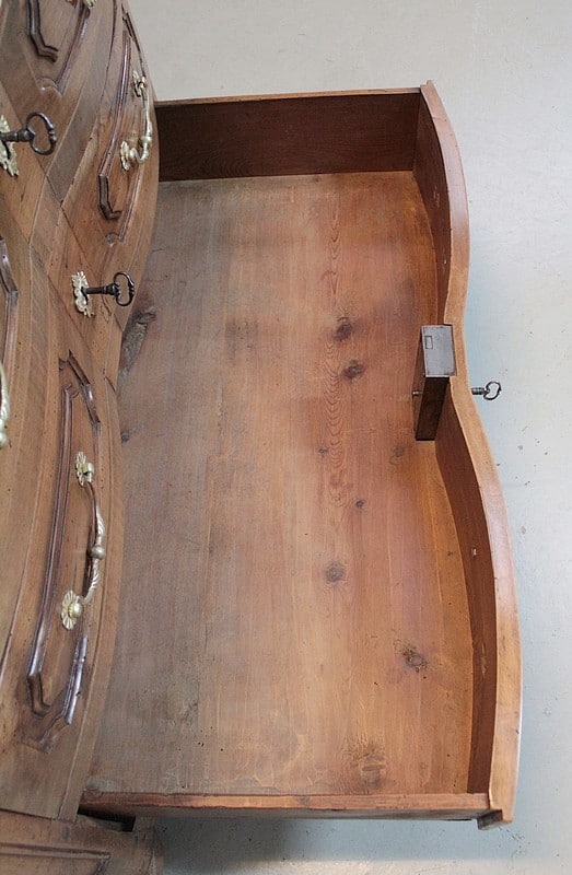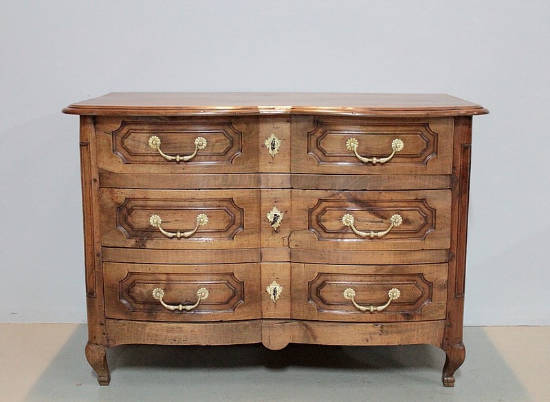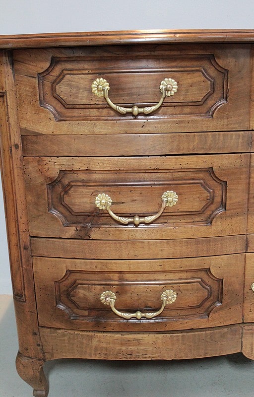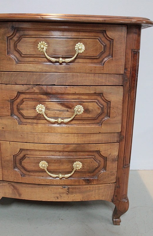 Commode Régence galbée en noyer massif, intérieurs sapin, ouvrant à trois tiroirs garnis de poignées de tirage et d’entrées de serrures en bronze d’origine.