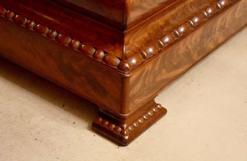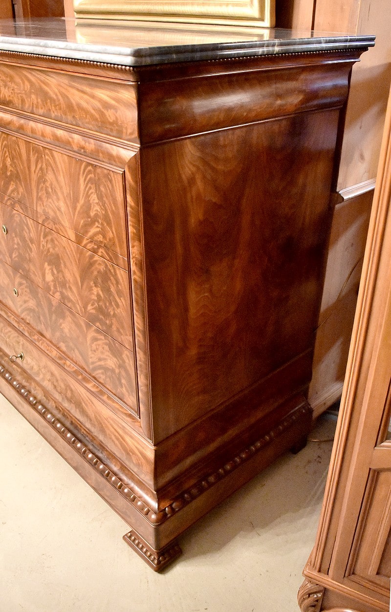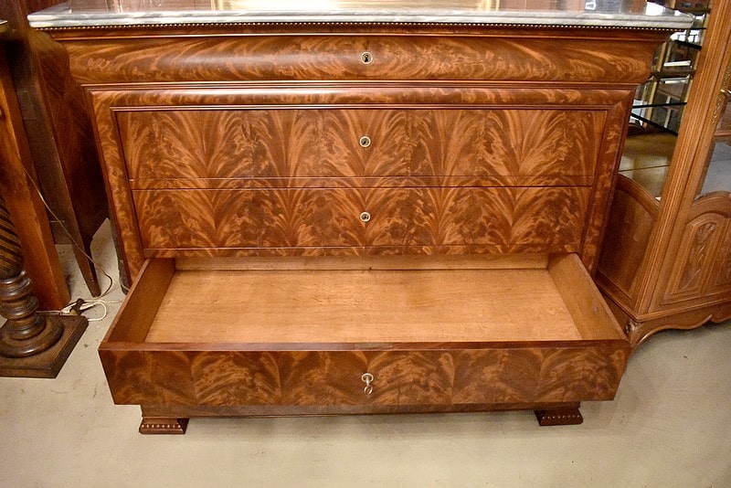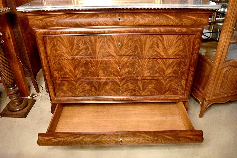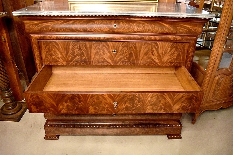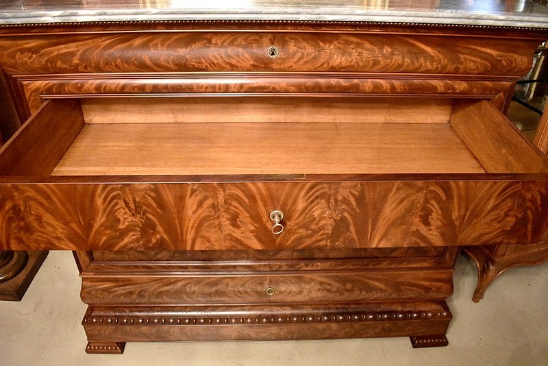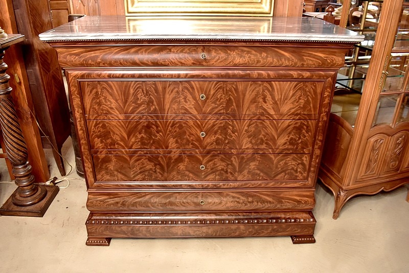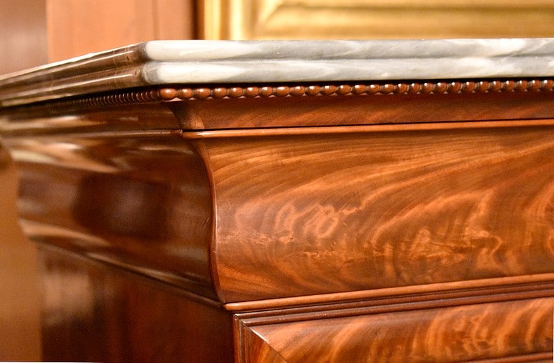 Commode Parisienne Restauration de propriété en placage de ronce d’Acajou flammé.