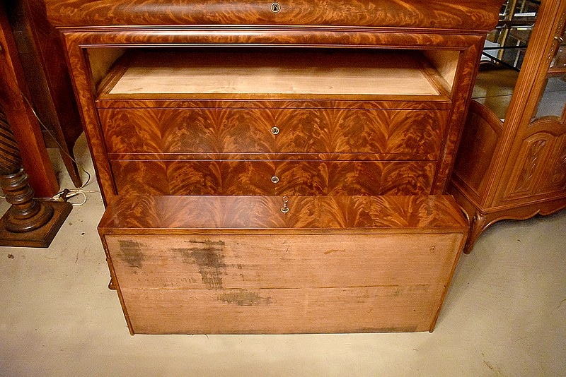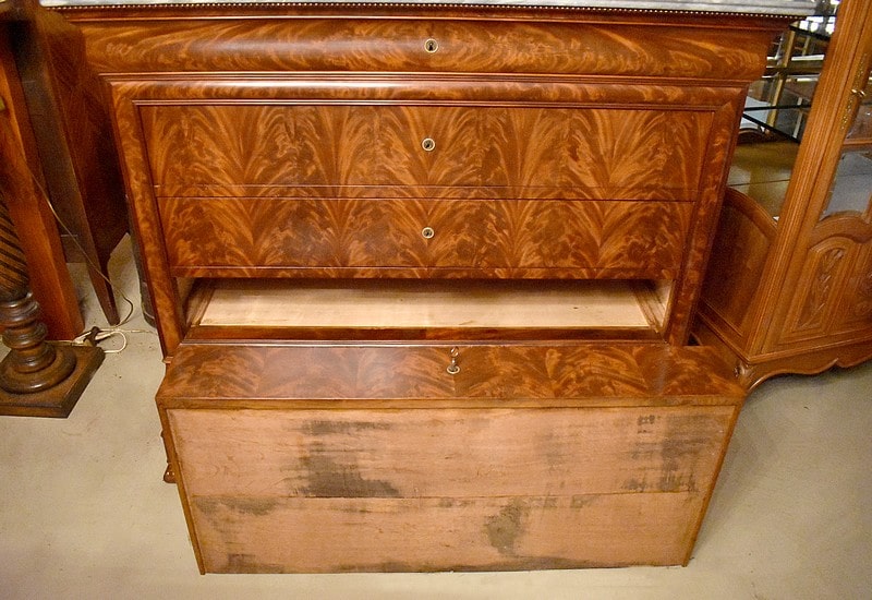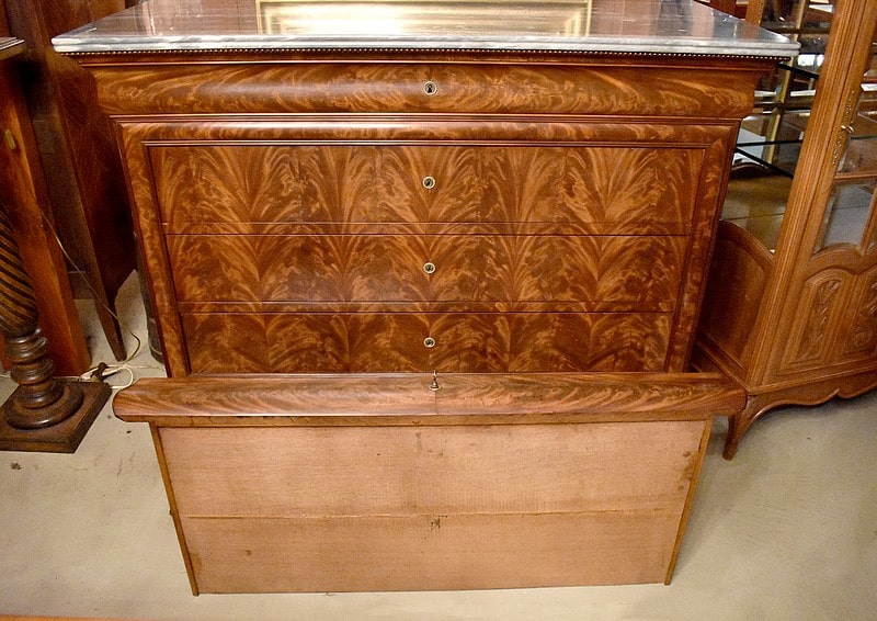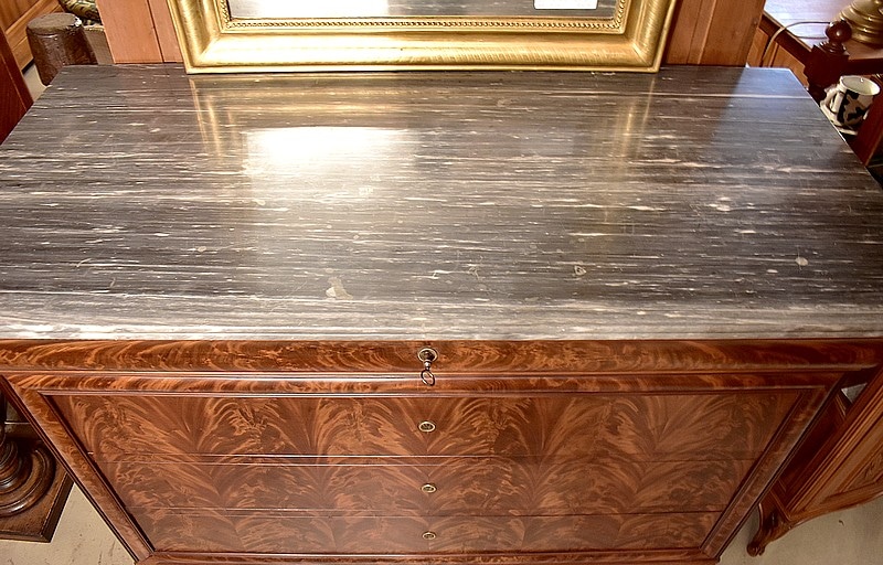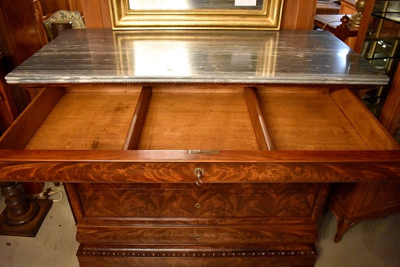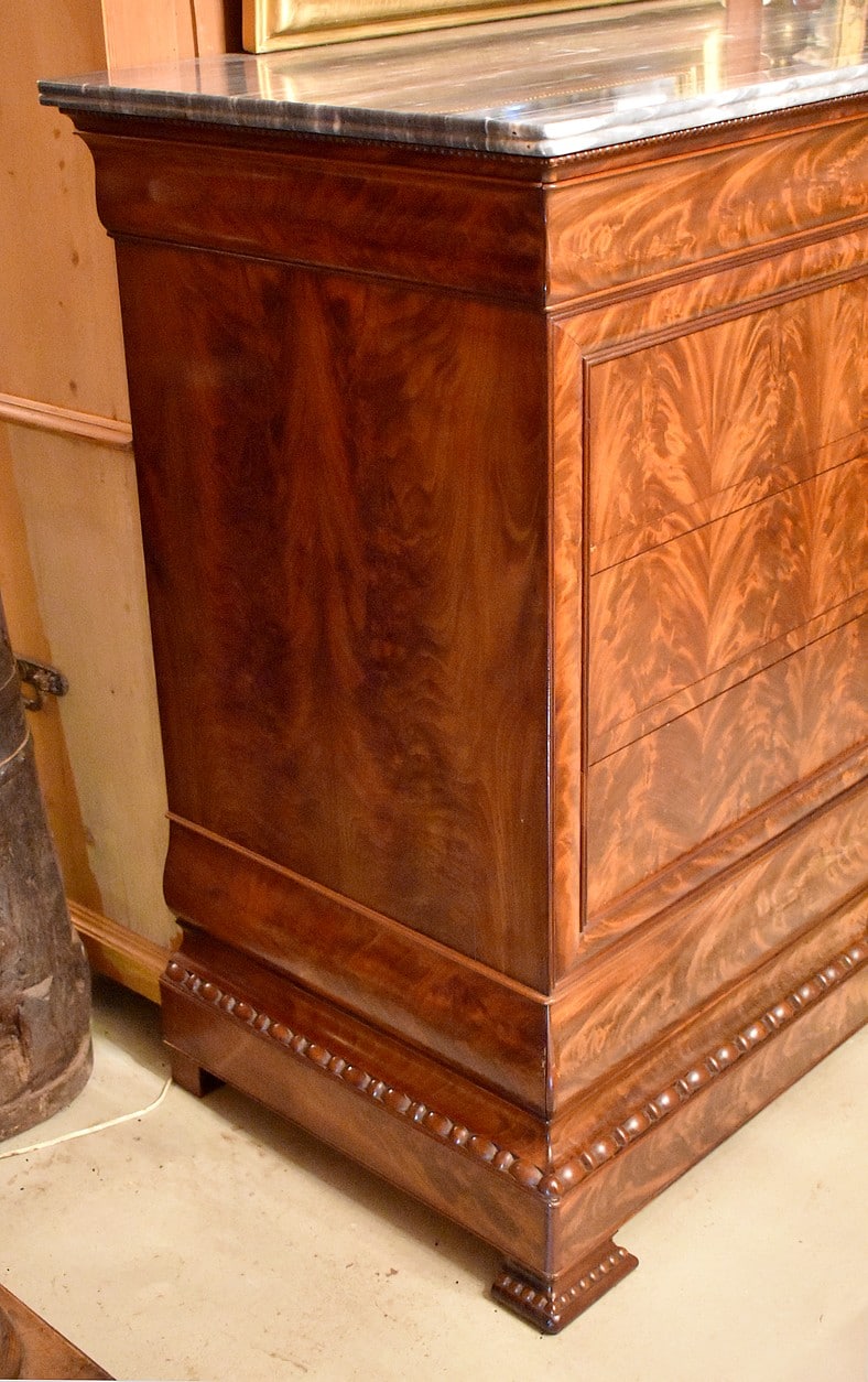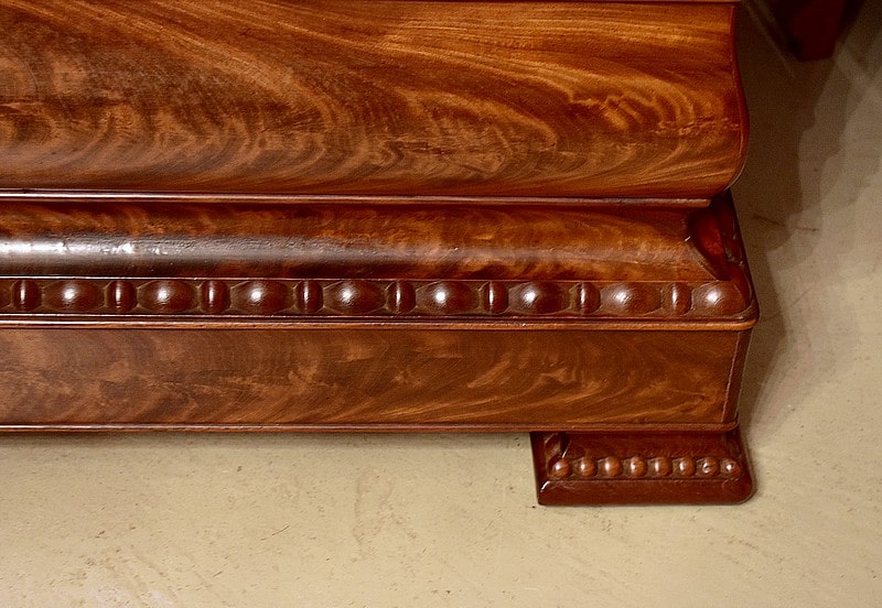 Commode Parisienne Restauration de propriété en placage de ronce d’Acajou flammé.