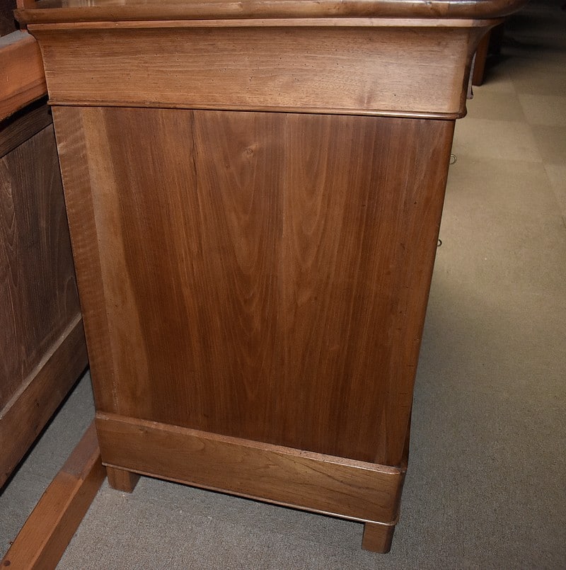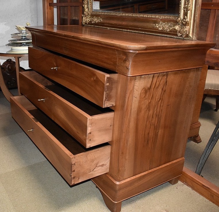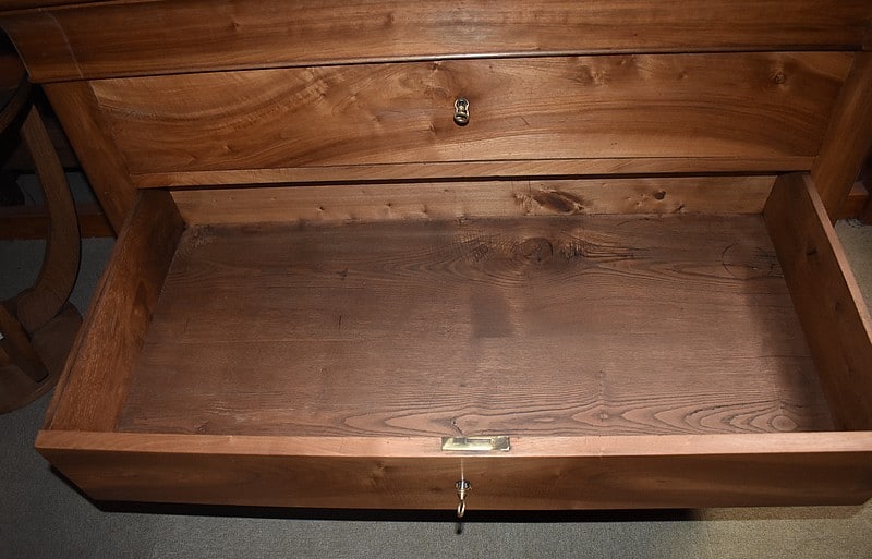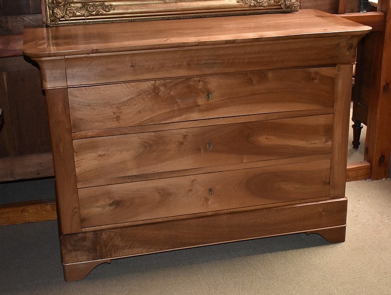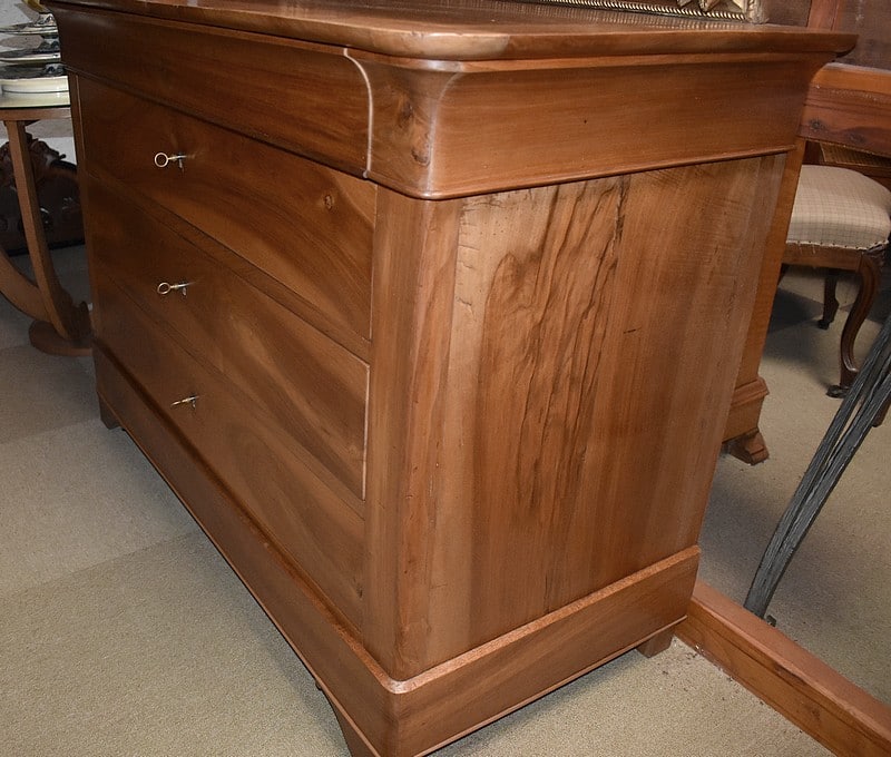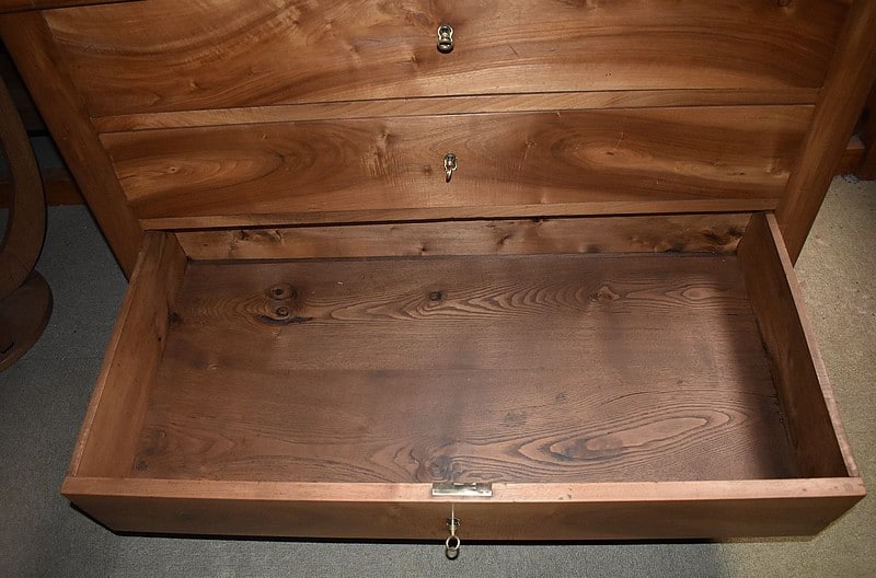 Commode Restauration en noyer blond massif ouvrant à 4 tiroirs – 1 en retrait sous le dessus, et les 3 suivants fermant à clé.