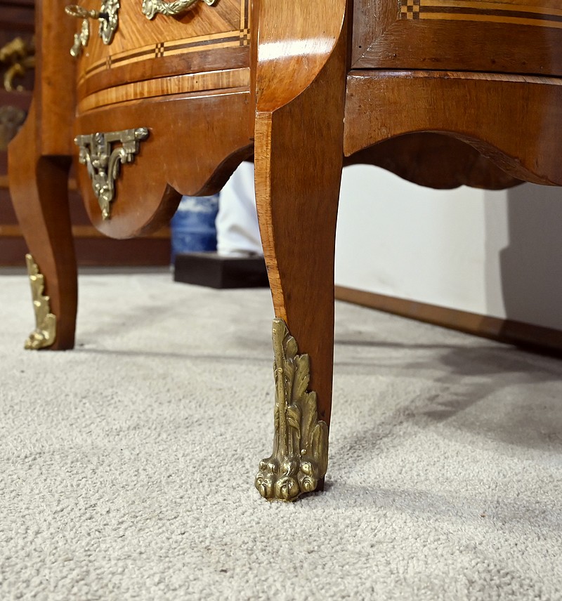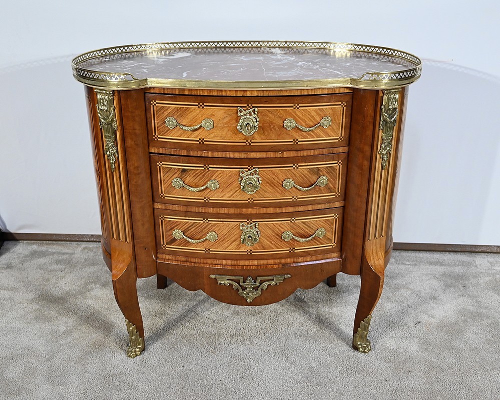 Charmante commode de milieu de fabrication parisienne, composée en façade de 3 tiroirs identiques légèrement bombés. Chacune de leur façade, présente en son centre un placage de bois de rose positionné en ailes de papillon. Autour, un double filet de bois clair et d’amarante, alterné de carrés géométriques, est encadré de bandes d’acajou à coupe d’onglet. Au centre, nous retrouvons une entrée de clé en bronze sommée d’un nœud louis XVI d’où s’échappe une couronne de feuillage. La serrure d’origine est en état de fonctionnement et sa clé est postérieure. L’intérieur des tiroirs est en chêne.