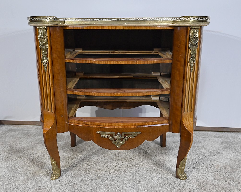 De chaque côté de ce meuble de milieu, un élément de bois en ¼ de rond en acajou est accolé au pied. Celui-ci est composé d’incrustations de larges filets en bois clair et en amarante, décoré en partie haute d’une grande chute en bronze et se continuant par un pied légèrement galbé avec un sabot en bronze formant des pattes de lion.