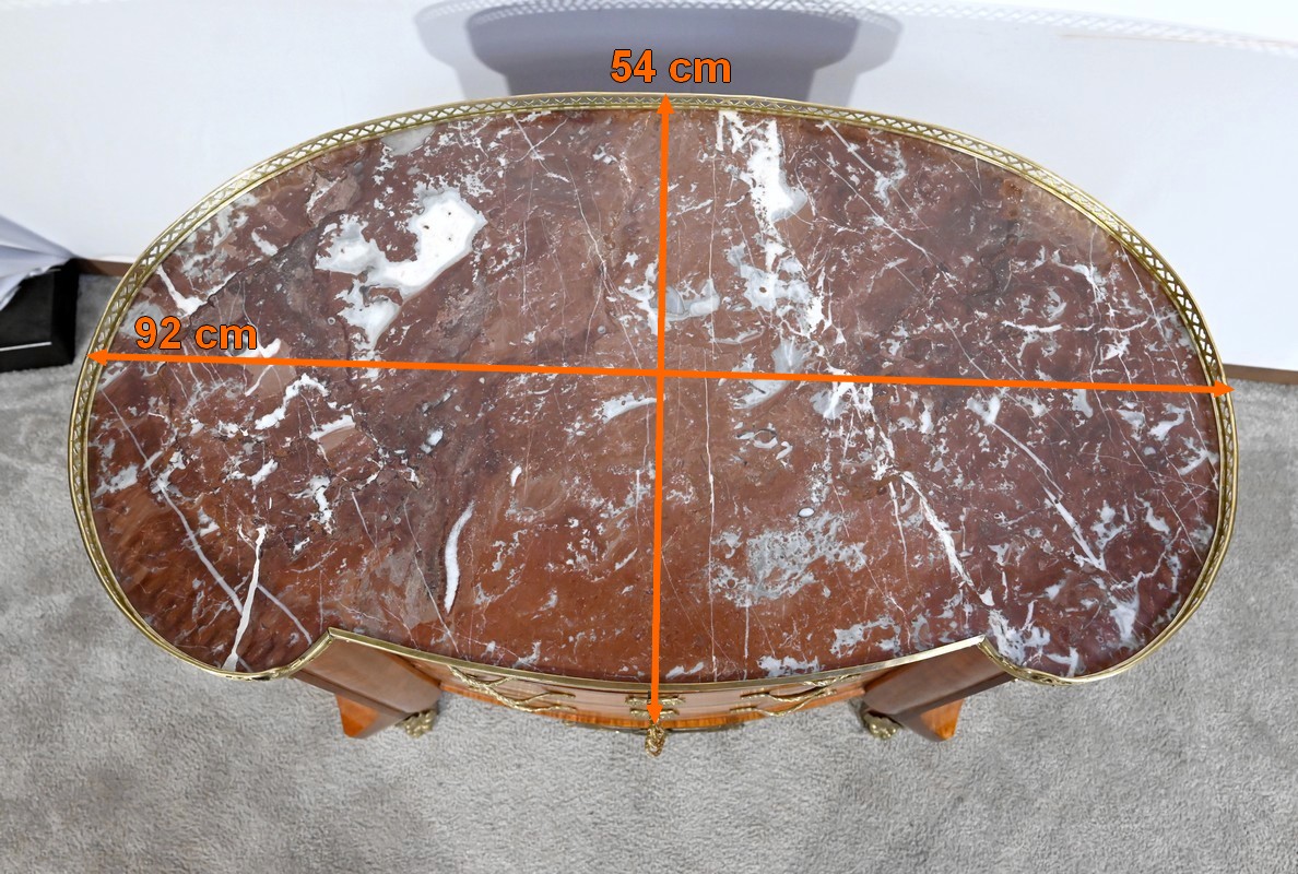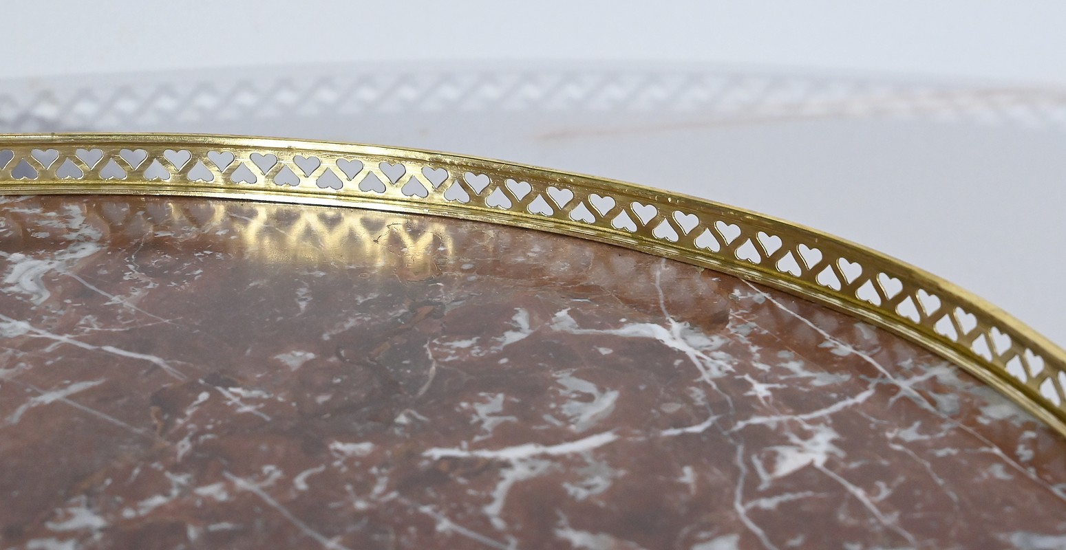 Cette commode est sommée d’un marbre griotte des Pyrénées accompagné d’une galerie en laiton ajourée avec entrée en façade.