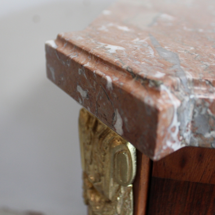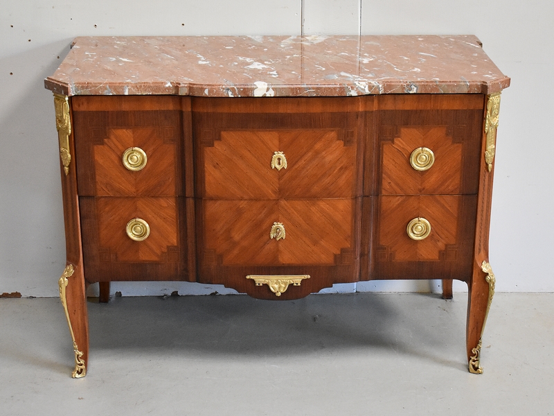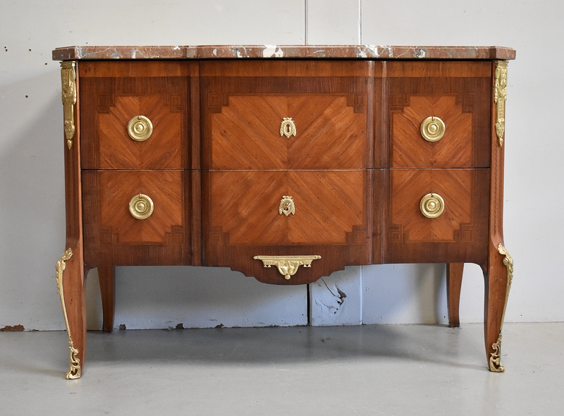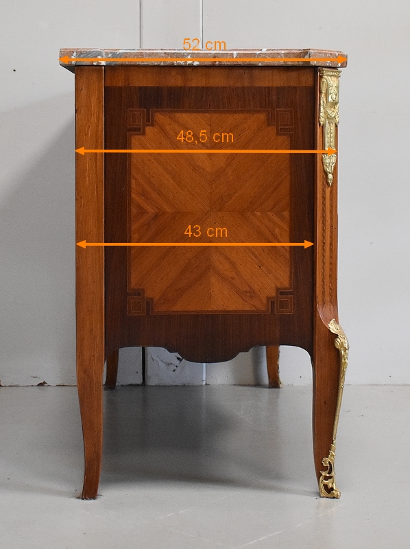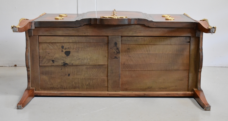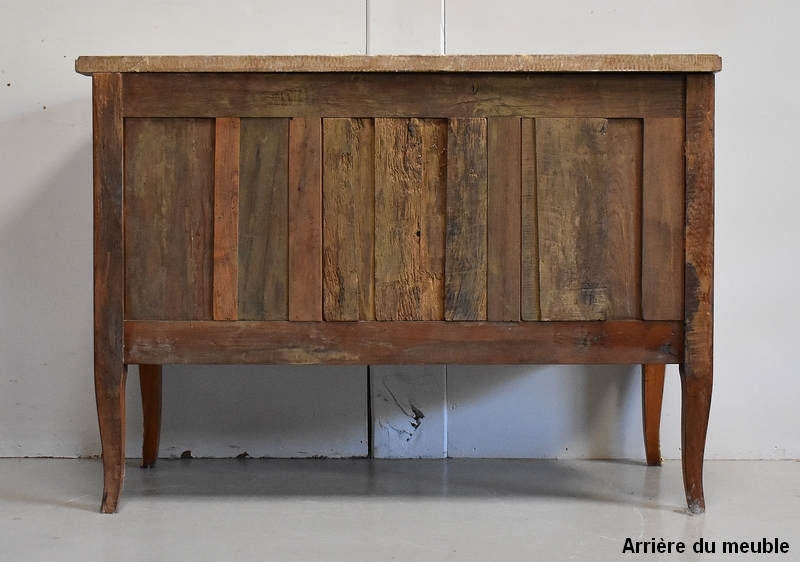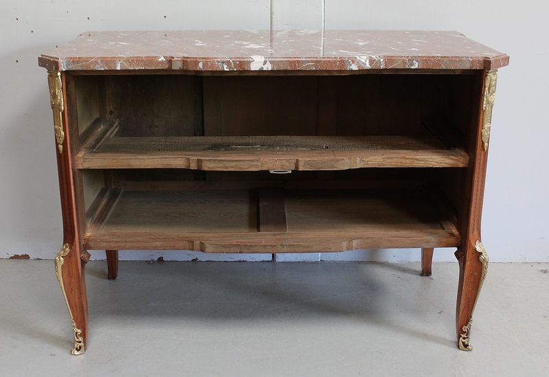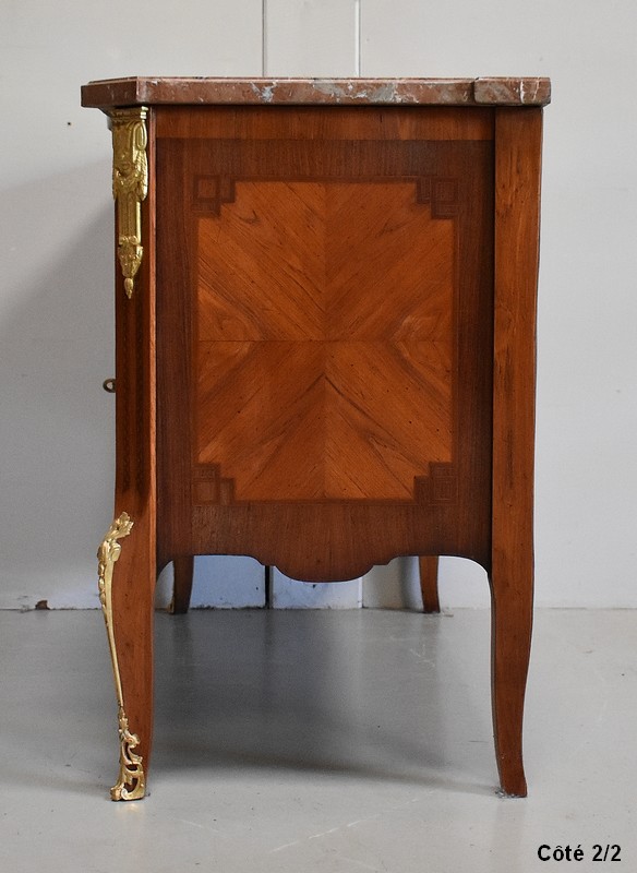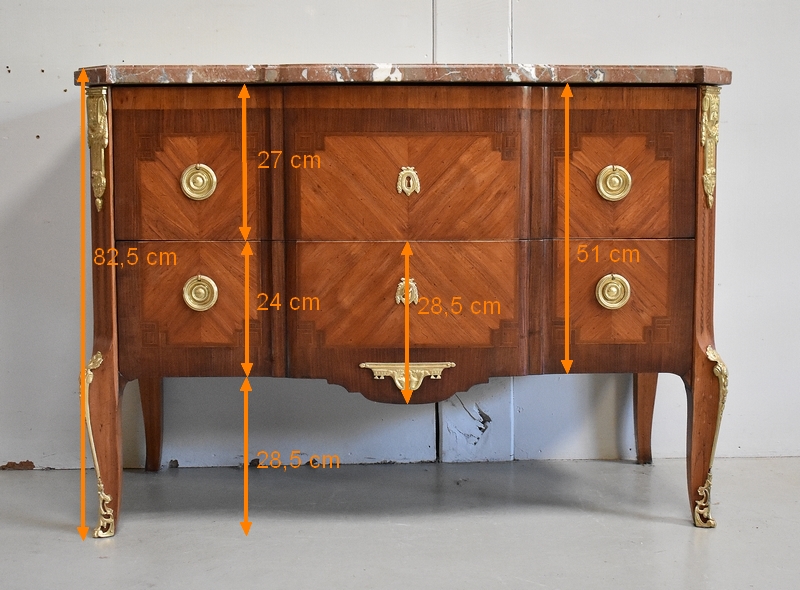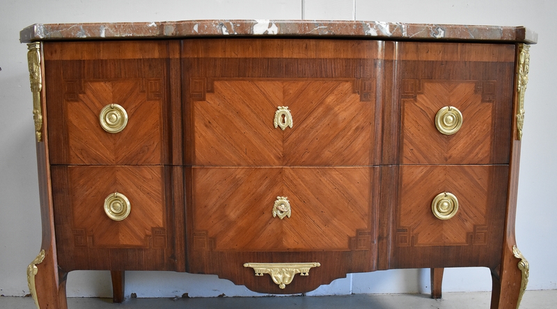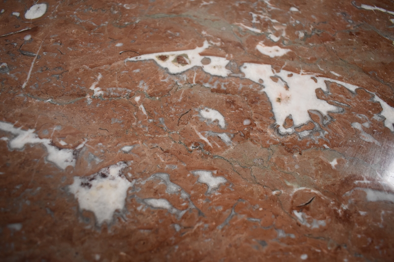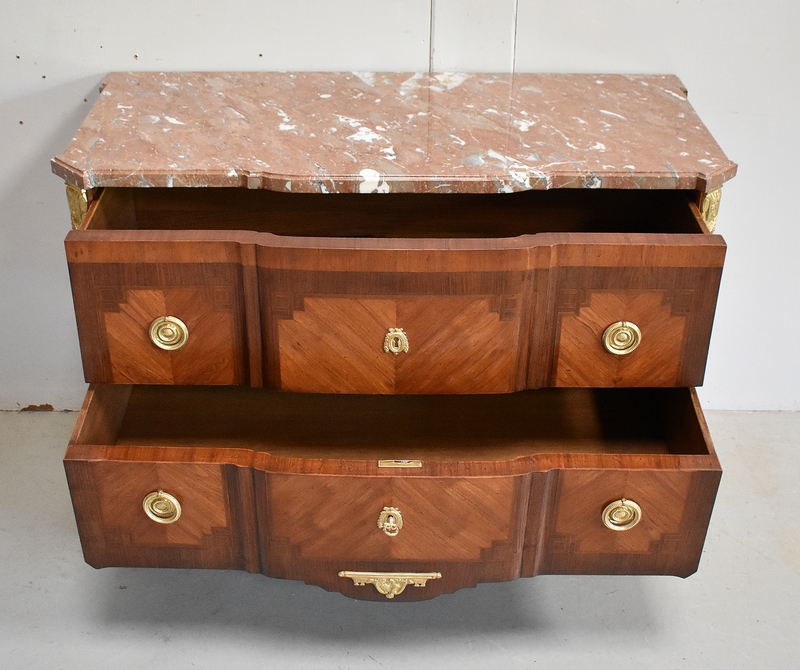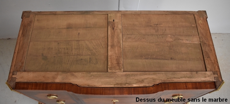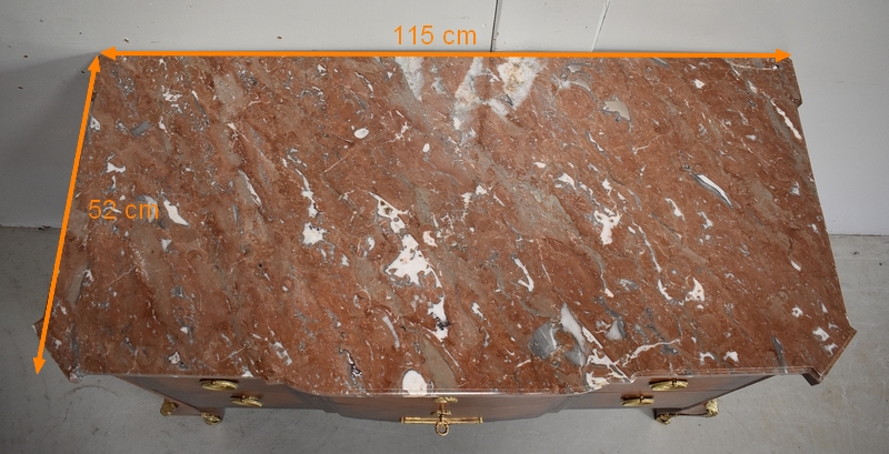 Son Dessus est un Somptueux Marbre épais de 3cm, dans le ton Terre de Sienne à veinage Blanc. Il présente un Décrochement épousant le Mouvement de la Commode, avec Ressaut et Gorge sur son Pourtour.