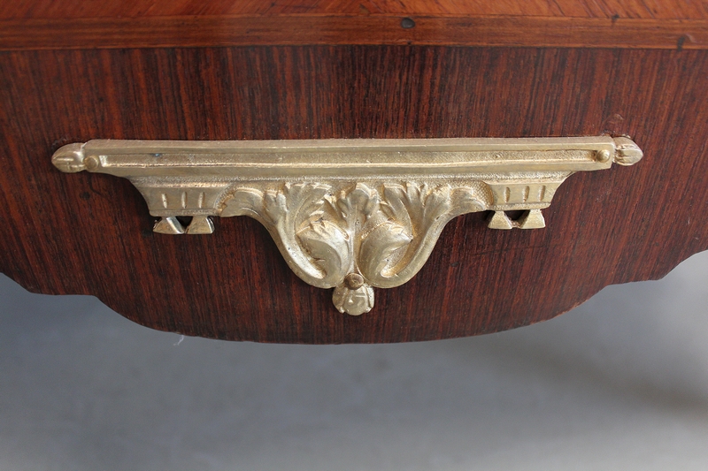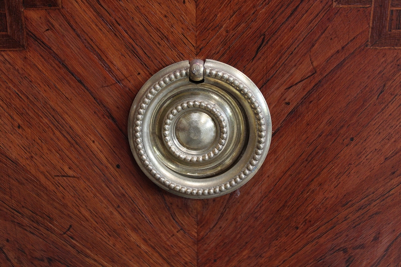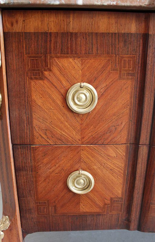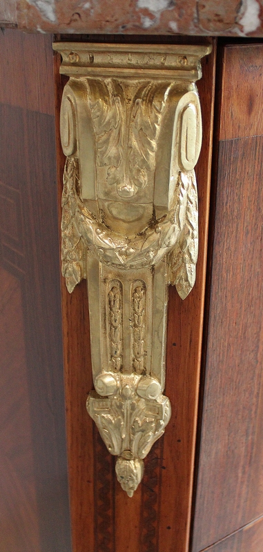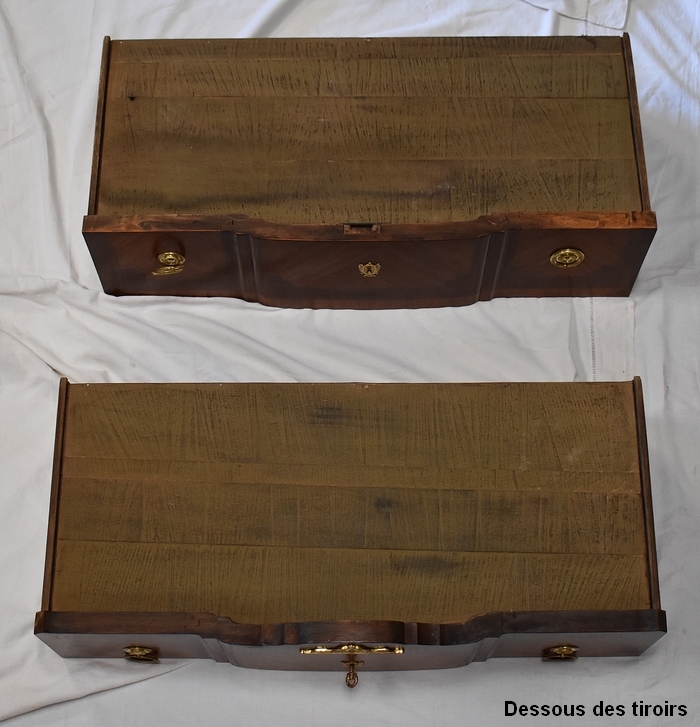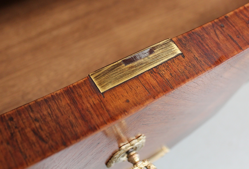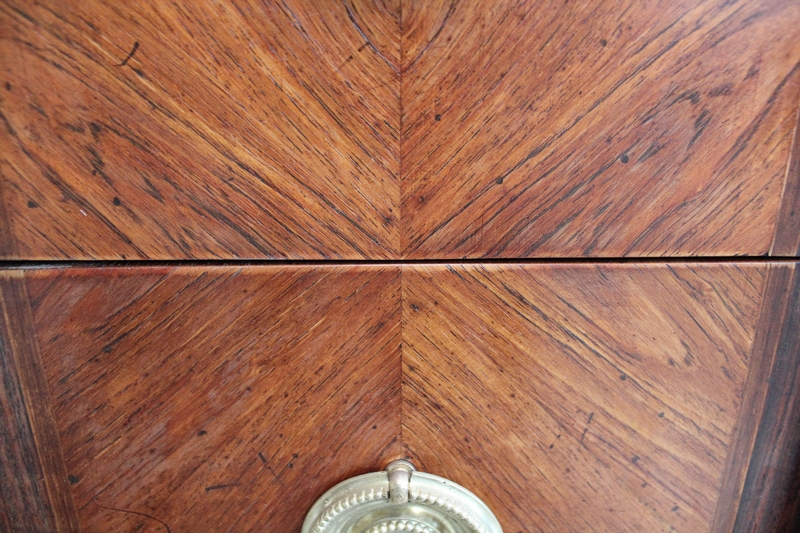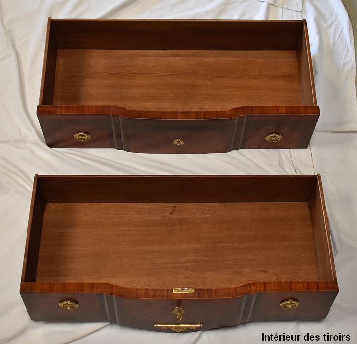La partie centrale de la Façade de la Commode en saillie est bâtie de deux grands Tiroirs à Traverse cachée d’une profondeur identique, dont l’intérieur est en Chêne. Ces deux Tiroirs sont munis d’Entrée de Serrure en Bronze, la première étant factice, seule celle inférieure munie de sa Clef verrouille les deux ouvertures. Ils sont pourvus de chaque côté, de Poignées de Tirage en Bronze. Ces Tiroirs, composés de Bois de Rose et de Bois de Violette disposés en Ailes de Papillon, présentent des Filets d’encadrement à la grecque. Les Côtés de ce Meuble ne sont pas non plus à négliger car le bois est agencé de la même façon qu’en Façade.