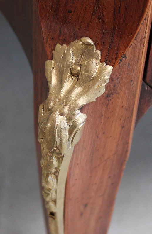 Cette Commode est soutenue par quatre Pieds dont ceux de devant à Pan coupé se terminent en Pied Biche. On trouve une Chute en Bronze en partie haute ainsi que sur la bosse du Pied, et un Sabot en partie basse. Le Pan coupé est garni de deux filets enrubannés de Bois clair et d’Amarante.
