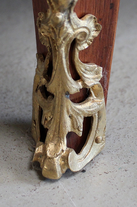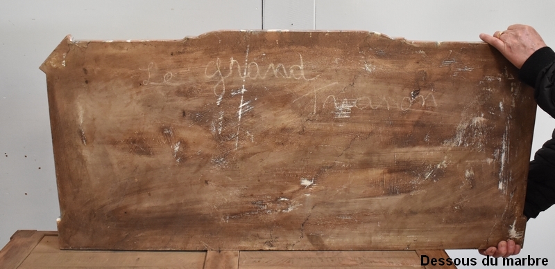 On notera l’inscription « Le Grand Trianon » présente sous le marbre ainsi qu’un Cachet sur le bois sous le marbre représentant une Fleur de Lys dorée.