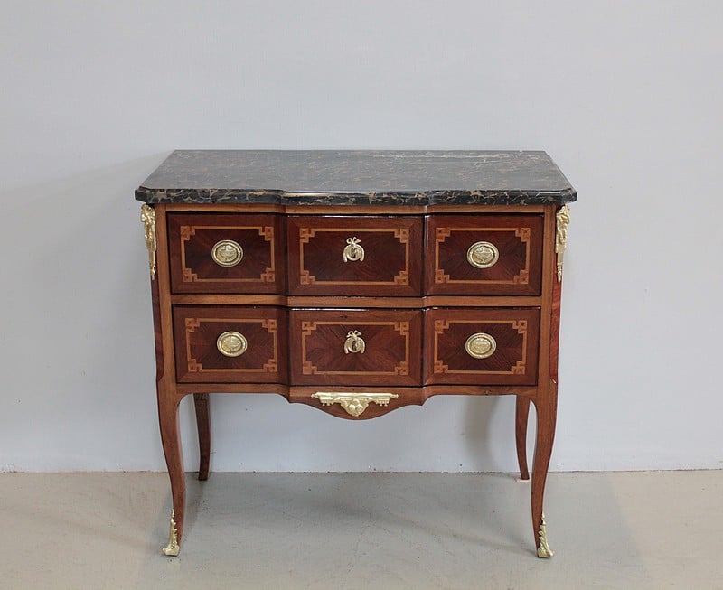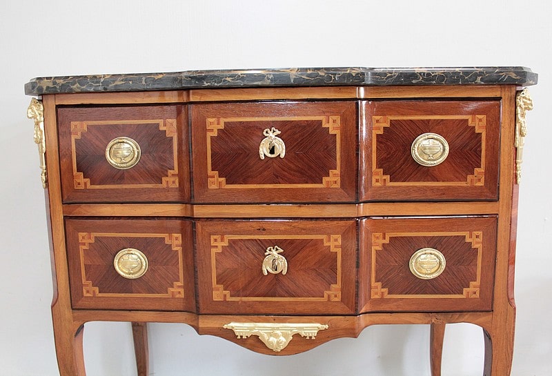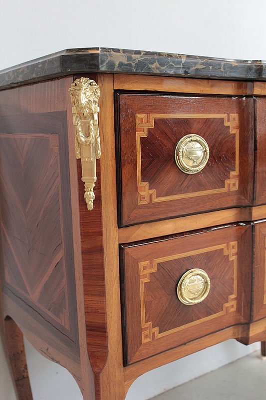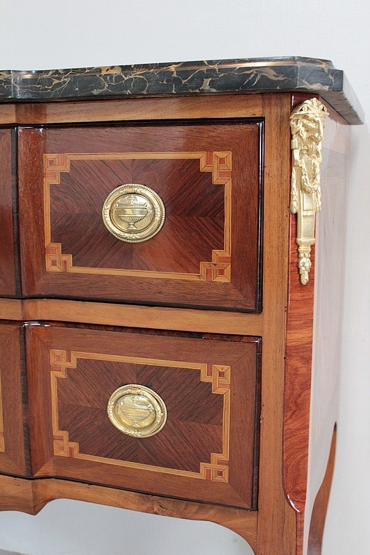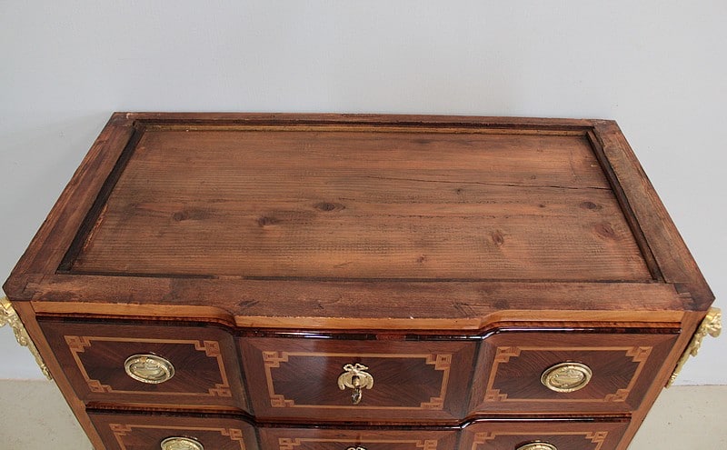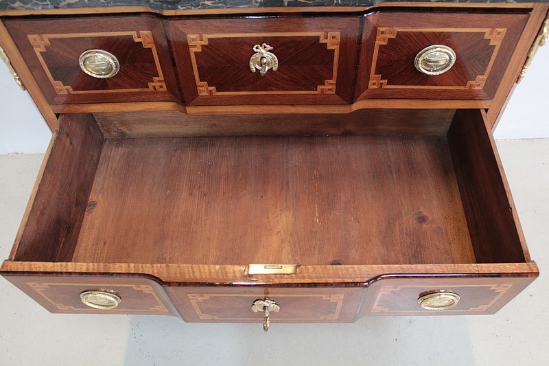 Commode à ressaut, sauteuse, Transition Louis XV-Louis XVI en placage d’acajou, d’amarante et noyer (pour les côtés) avec filets de bois de rose et de bois teintés. Les intérieurs et le fond sont en sapin.