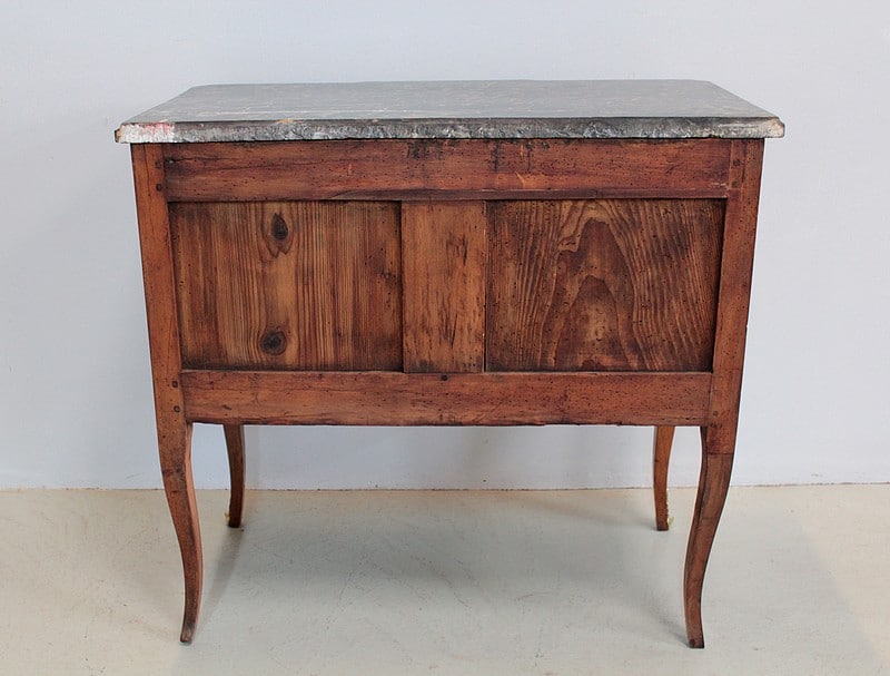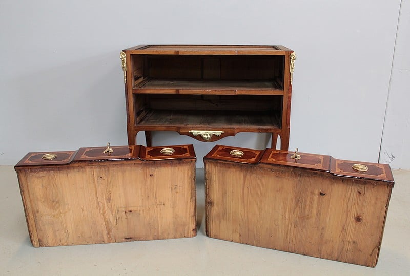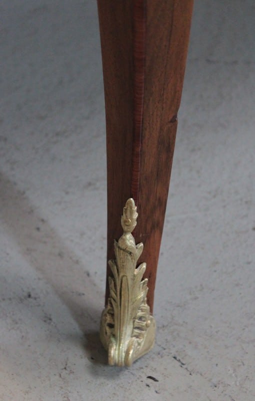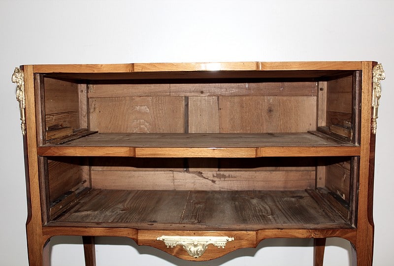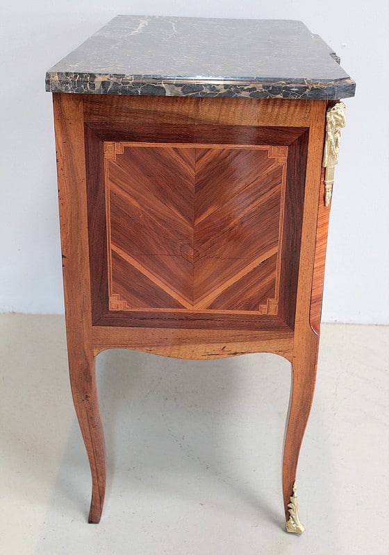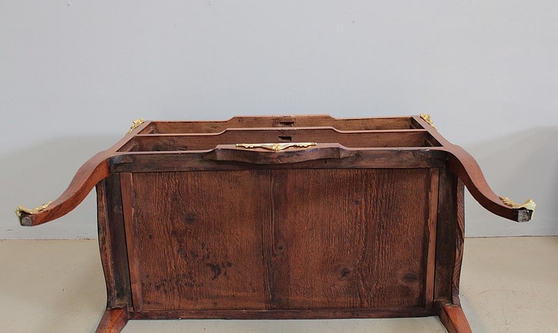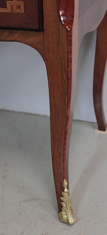 Elle ouvre par 2 tiroirs garnis d’entrées de serrures et d’anneaux de tirage en bronze de style Louis XVI et repose sur 4 pieds cambrés, ceux de l’avant terminés par des sabots de bronze.