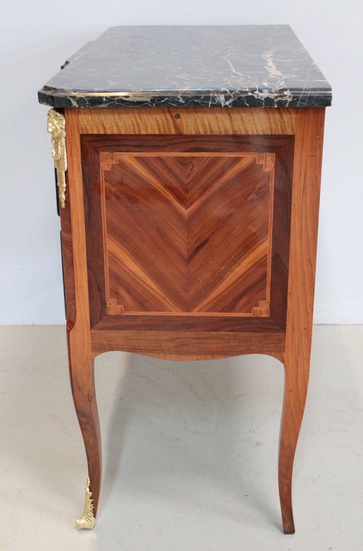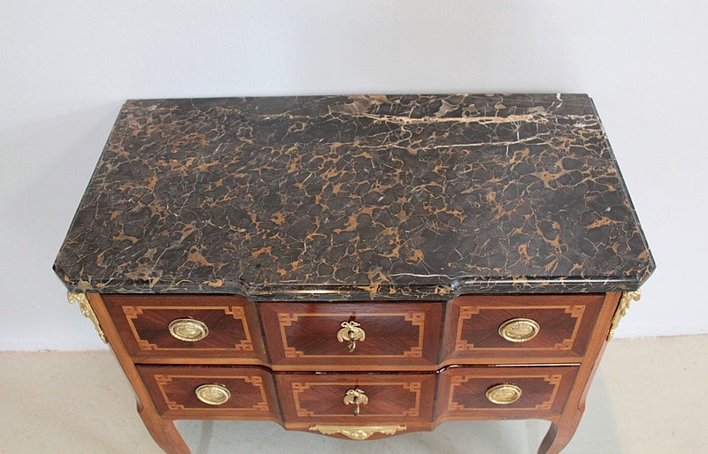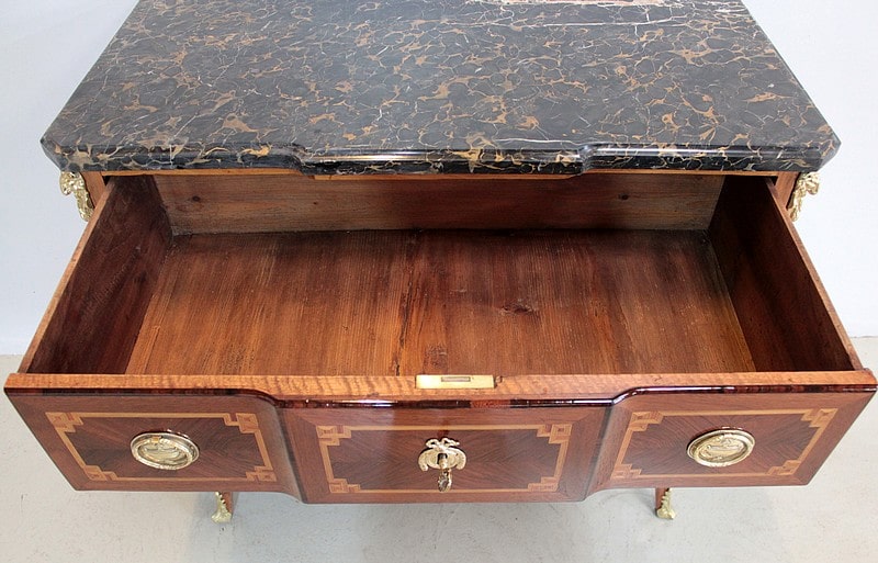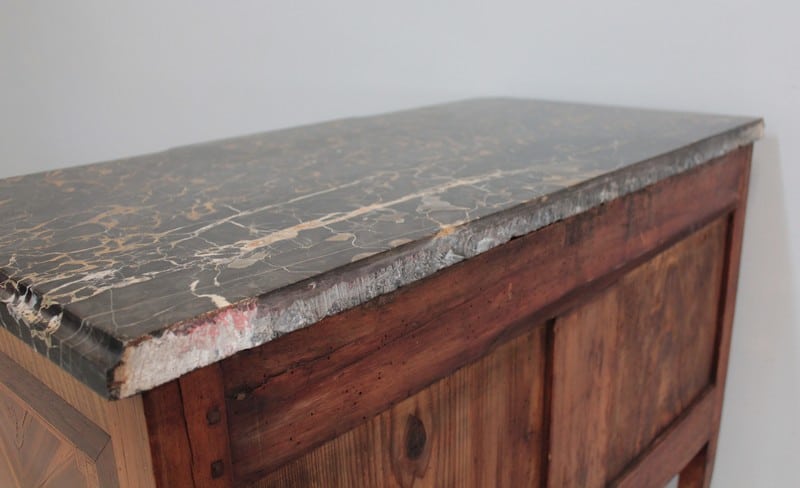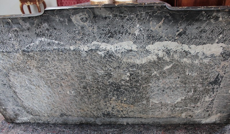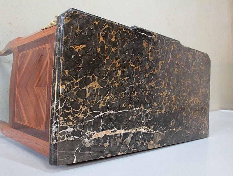 Son dessus est en marbre Portor – noir aux veinules ocre, ce marbre rare est exploité en Italie (sur le côte de Gênes) depuis l’antiquité, et réservé aux meubles les plus somptueux –