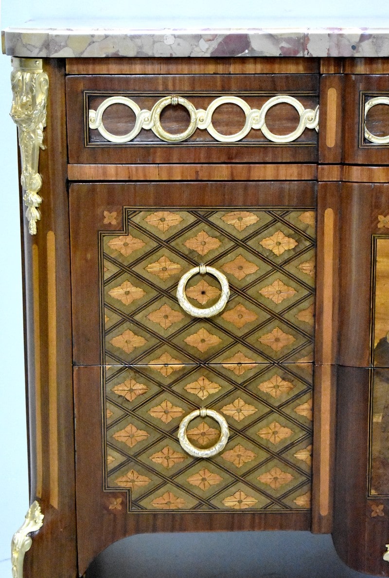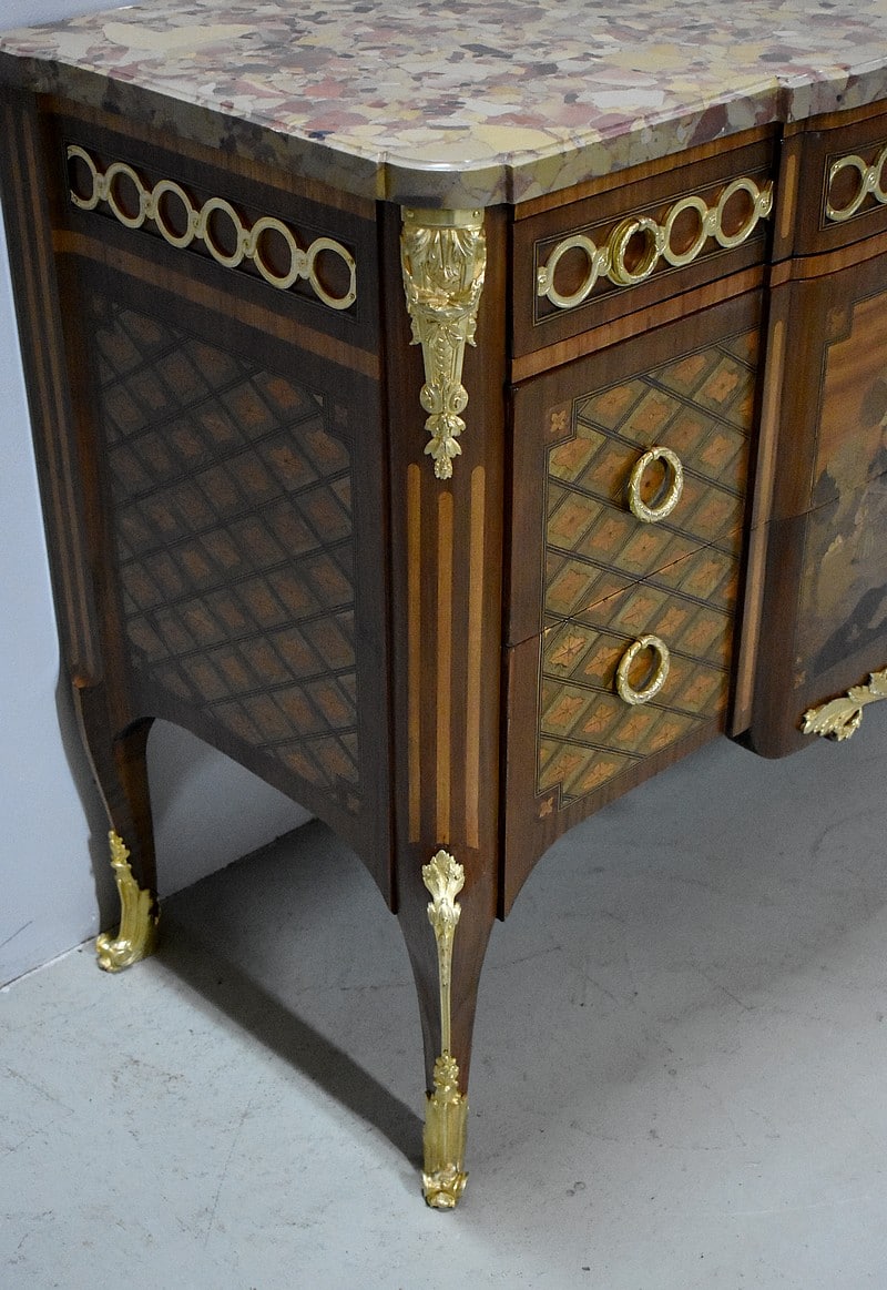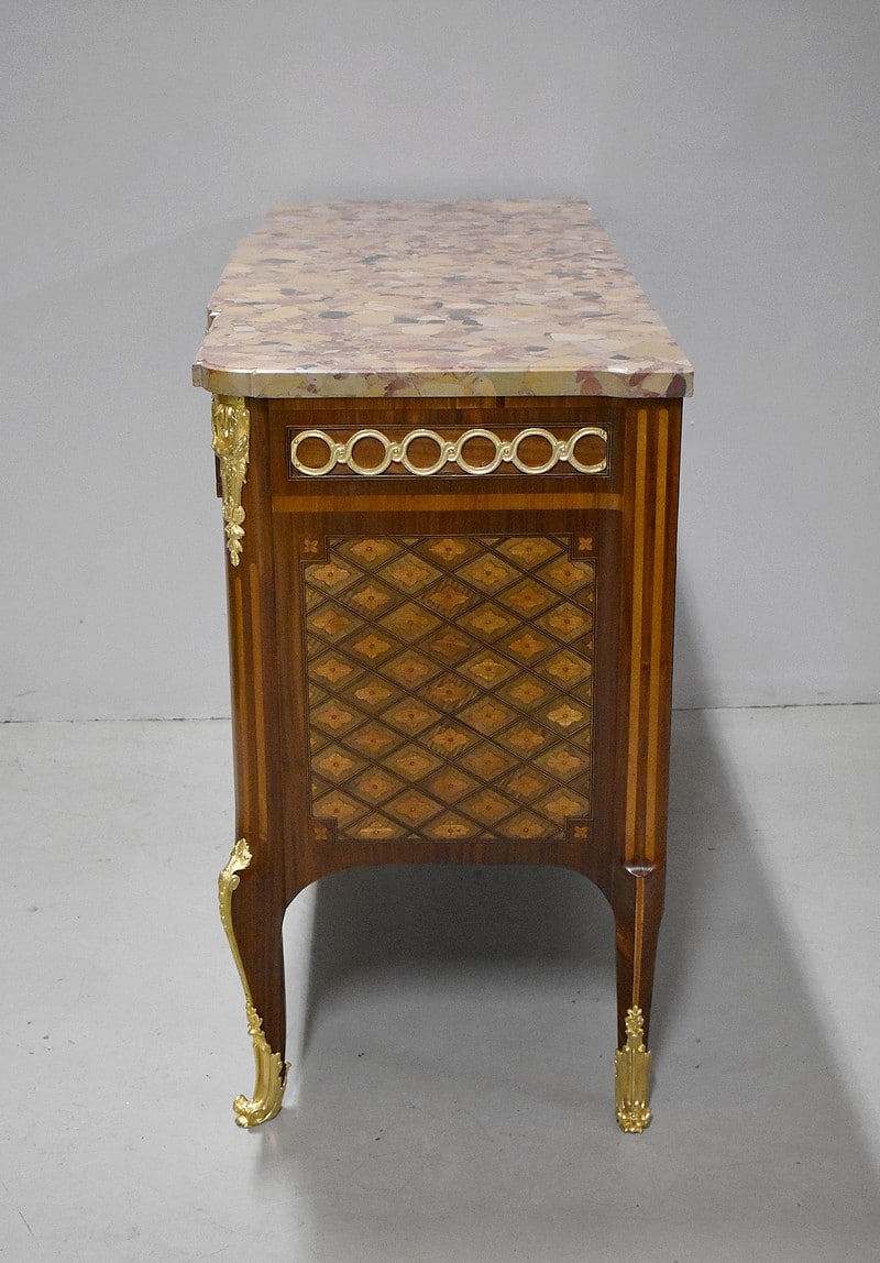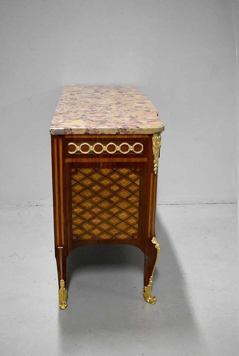 Belle commode sauteuse de style Transition Louis XV – Louis XVI, marquetée sur ses 3 faces visibles. La marquèterie est faite d’Acajou blond, de Bois de rose, de Thuyas, d’Érable et de bois teintés ainsi que de filets de Palissandre et de Citronnier pour les croisillons.