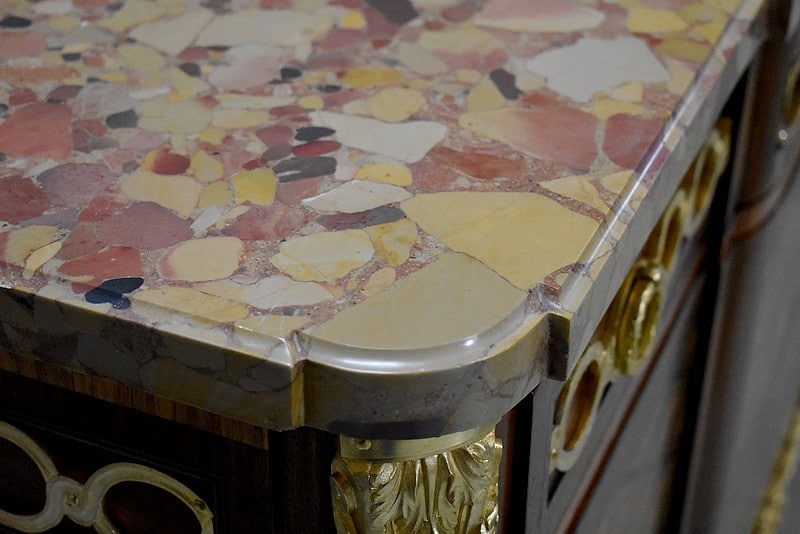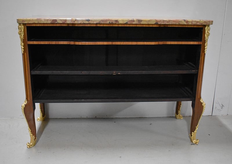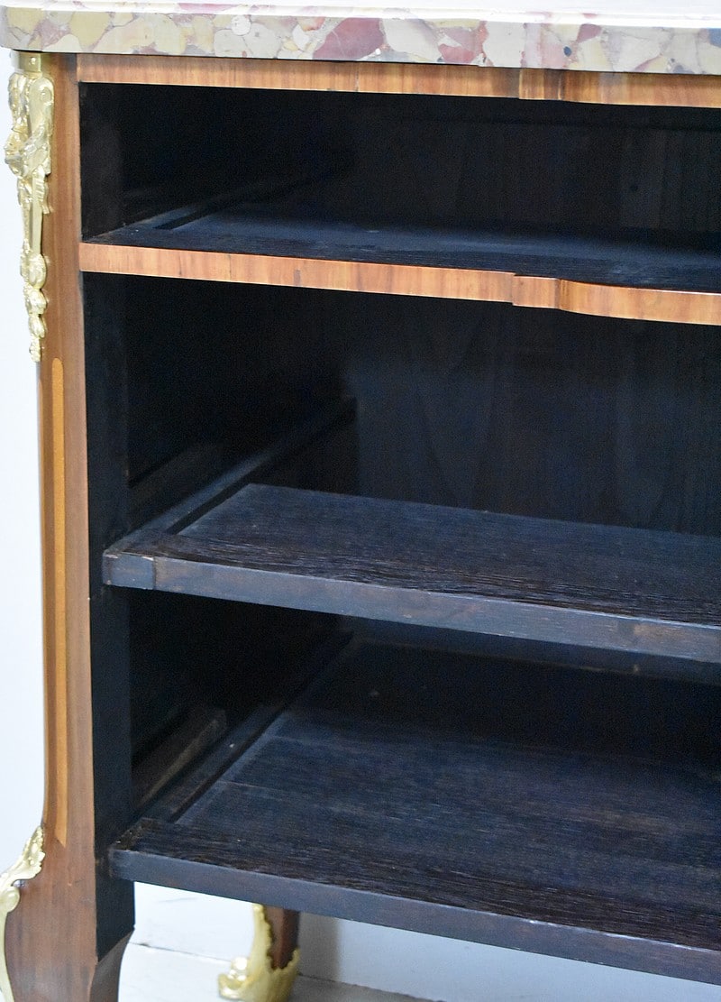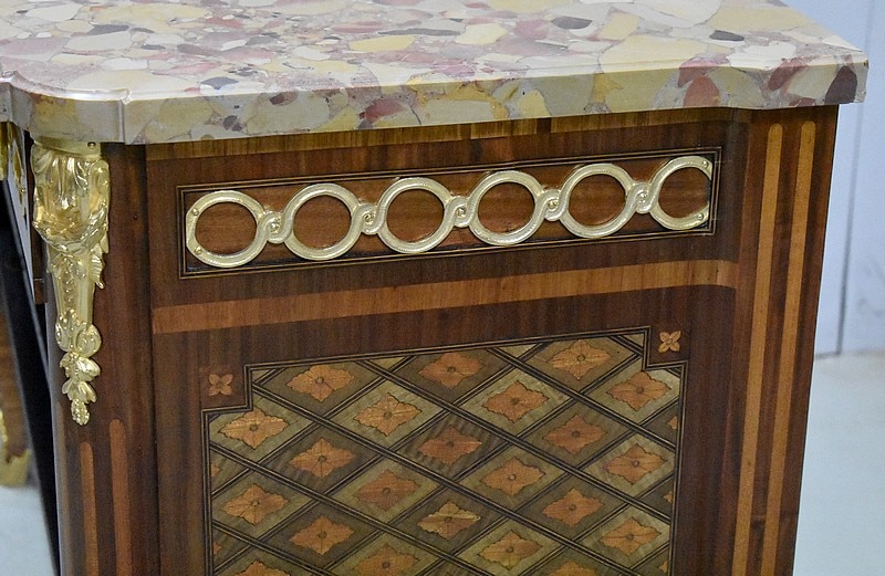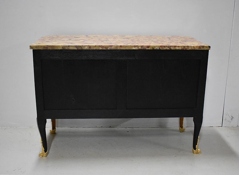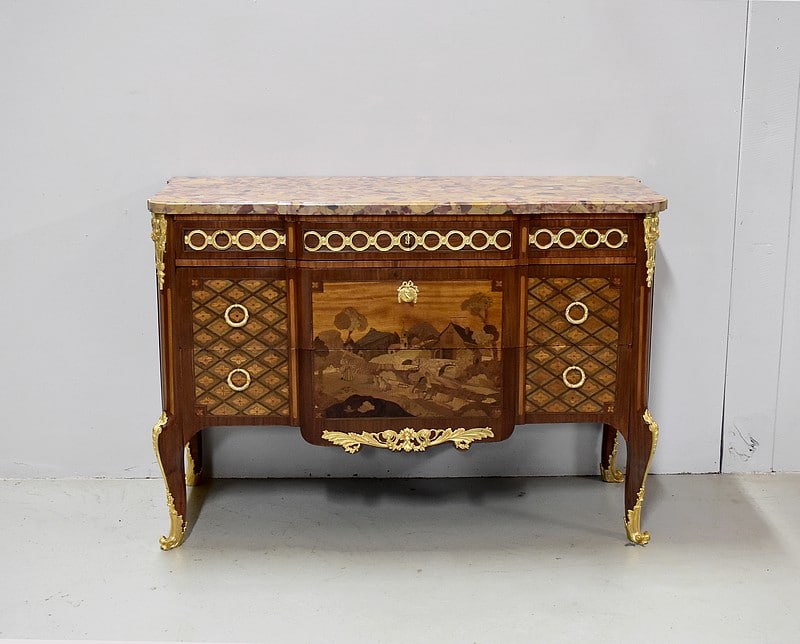 Belle commode sauteuse de style Transition Louis XV – Louis XVI, marquetée sur ses 3 faces visibles. La marquèterie est faite d’Acajou blond, de Bois de rose, de Thuyas, d’Érable et de bois teintés ainsi que de filets de Palissandre et de Citronnier pour les croisillons.