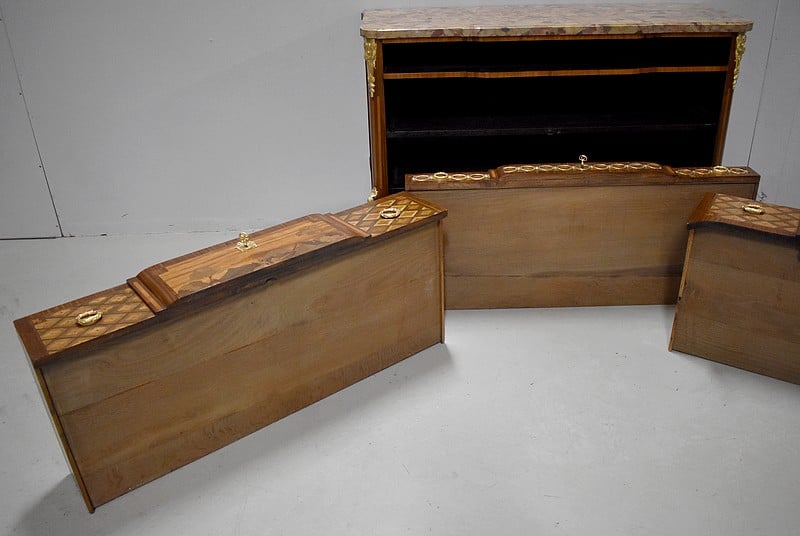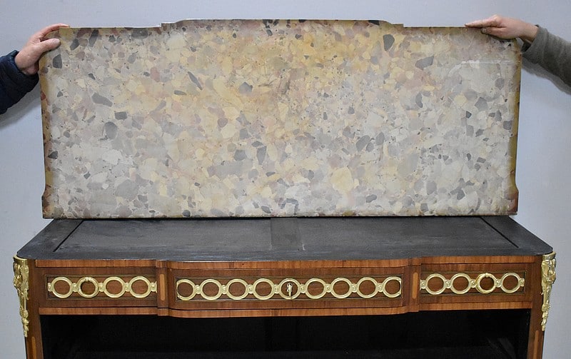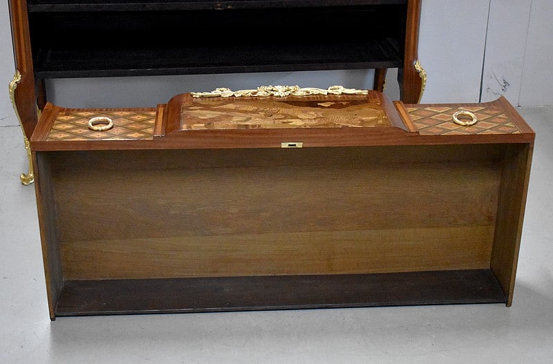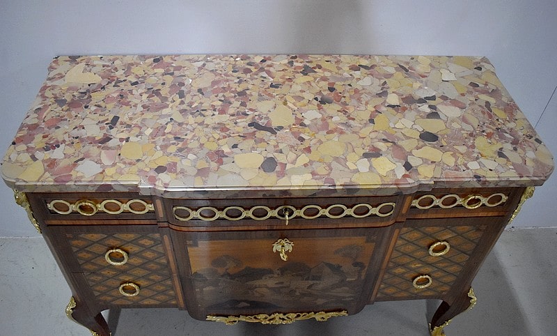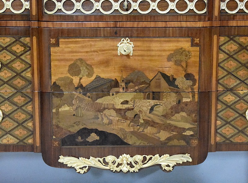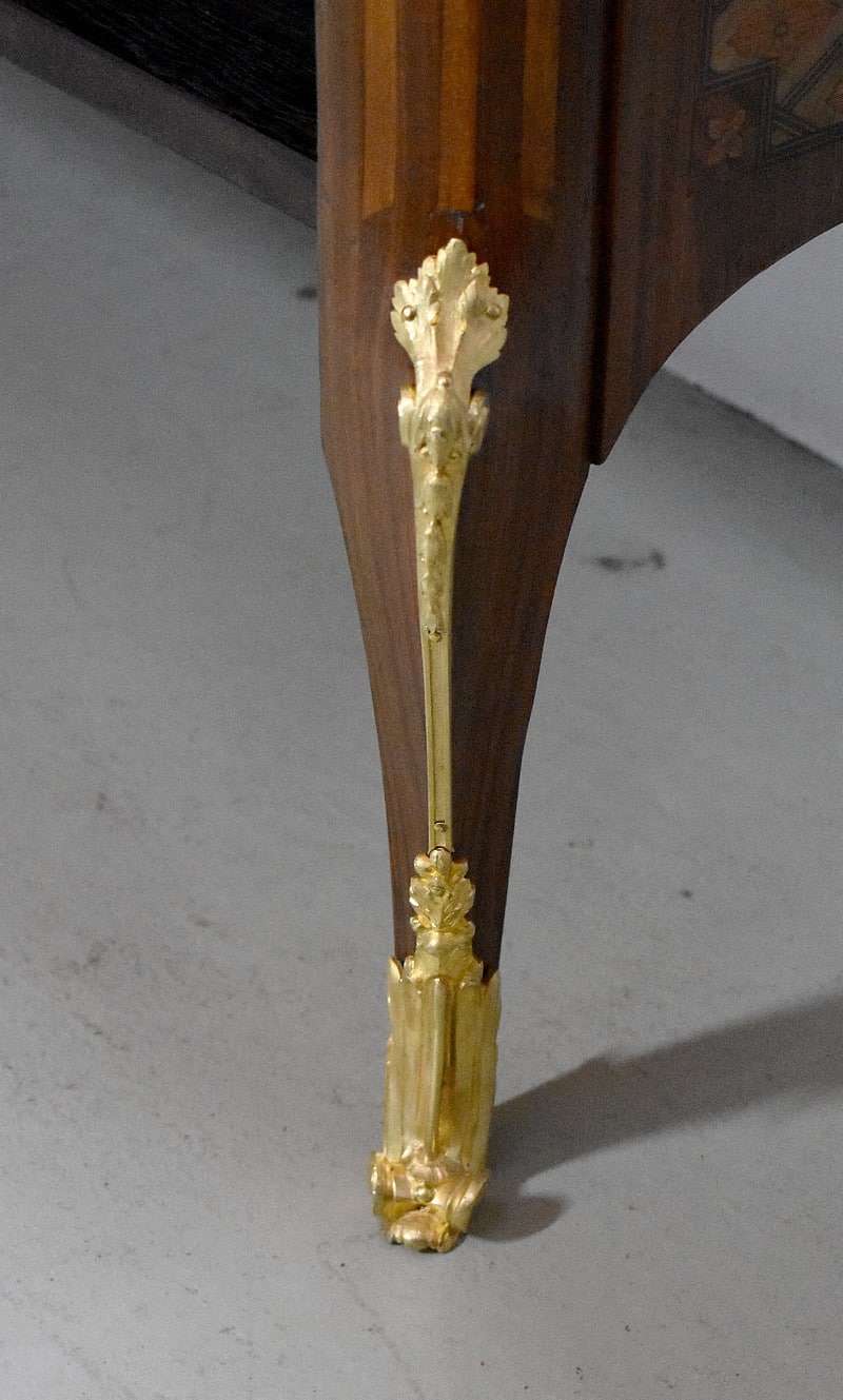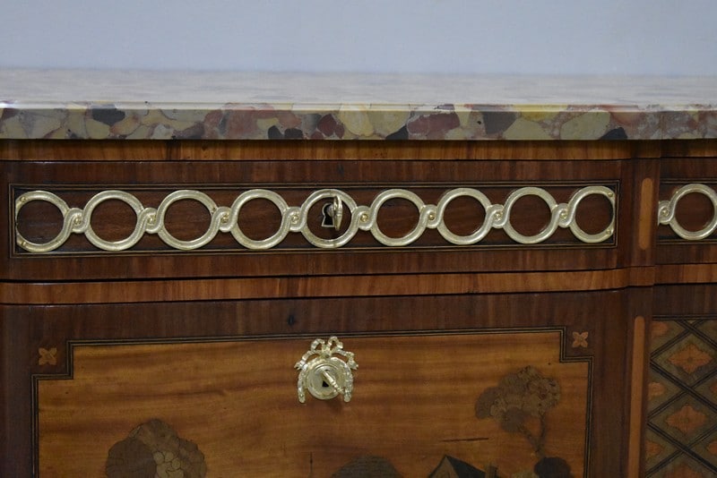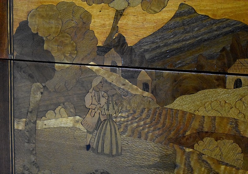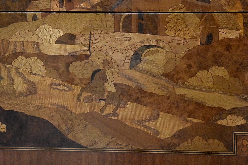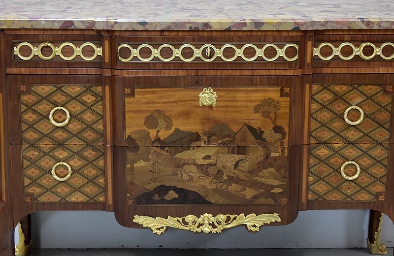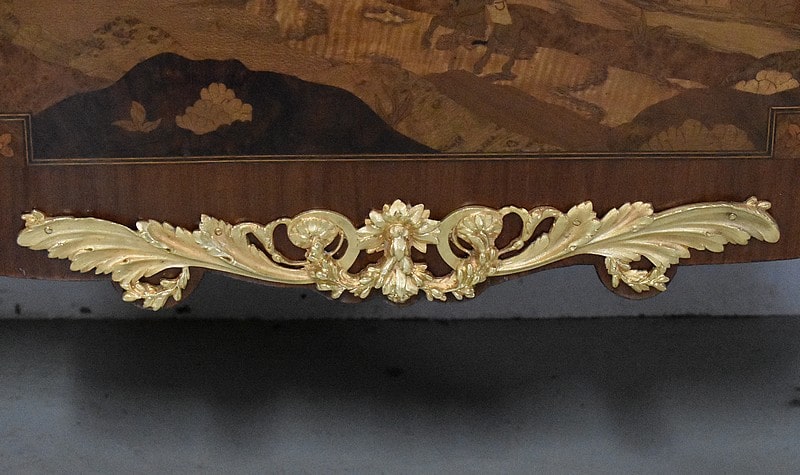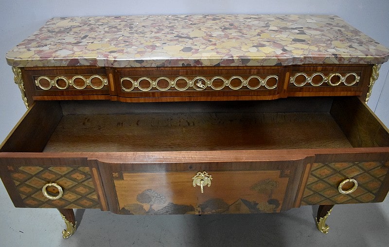 Elle ouvre par 3 tiroirs avec des cache-poussières entre tiroirs, tous fermant à clef. Un petit en partie haute orné de décorations en bronze et agrémenté de deux poignées en couronnes de Lauriers. Les deux autres plus grands tiroirs, sans traverse de séparation, sont entièrement marquetés , A décors de losanges encadrant des fleurs sur les côtés et, au milieu, d’un paysage de village et d’un couple se promenant accompagné d’une jeune fille sur un cheval. Ils sont également agrémentés de deux poignées en bronze en couronnes de Lauriers.