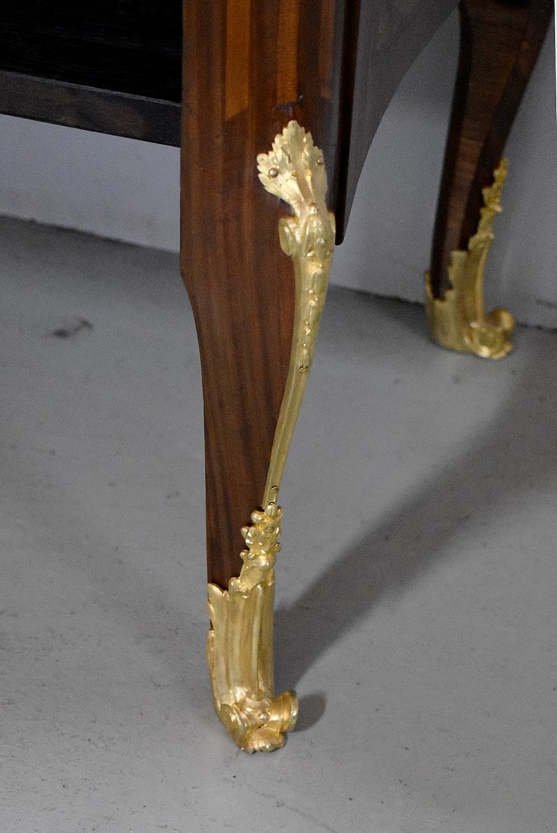 Les quatre pieds cambrés, à fausses cannelures marquetées en érable, sont surmontés en partie haute de décorations en bronze tout comme en partie basse, de sabots à décors de rinceaux.