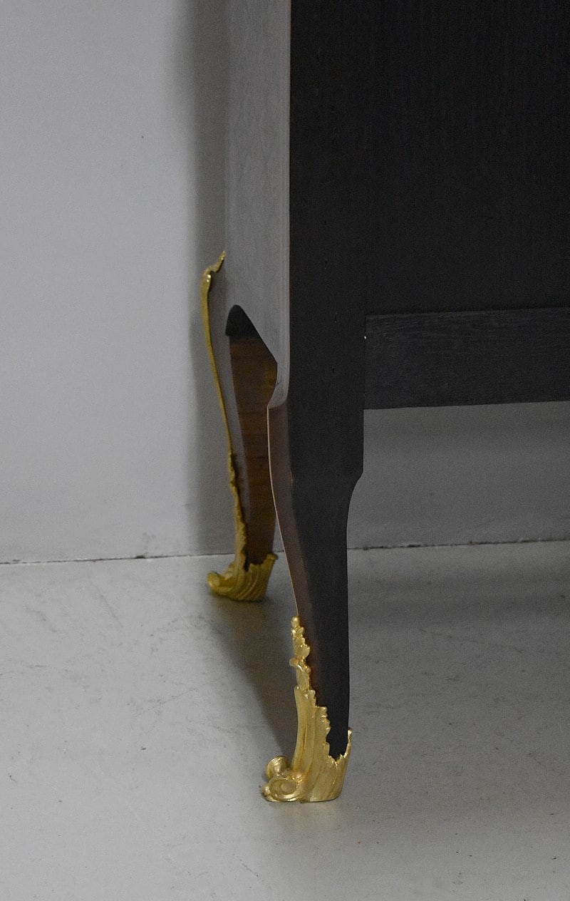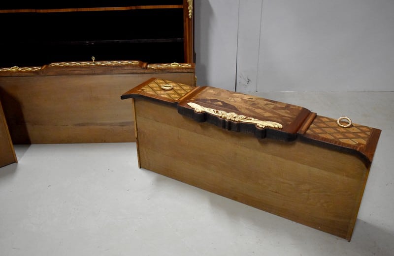 Ces mêmes losanges en croisillons encadrant des fleurs que l’on retrouve sur chaque côté du meuble, agrémentés en partie haute de décorations en bronze.