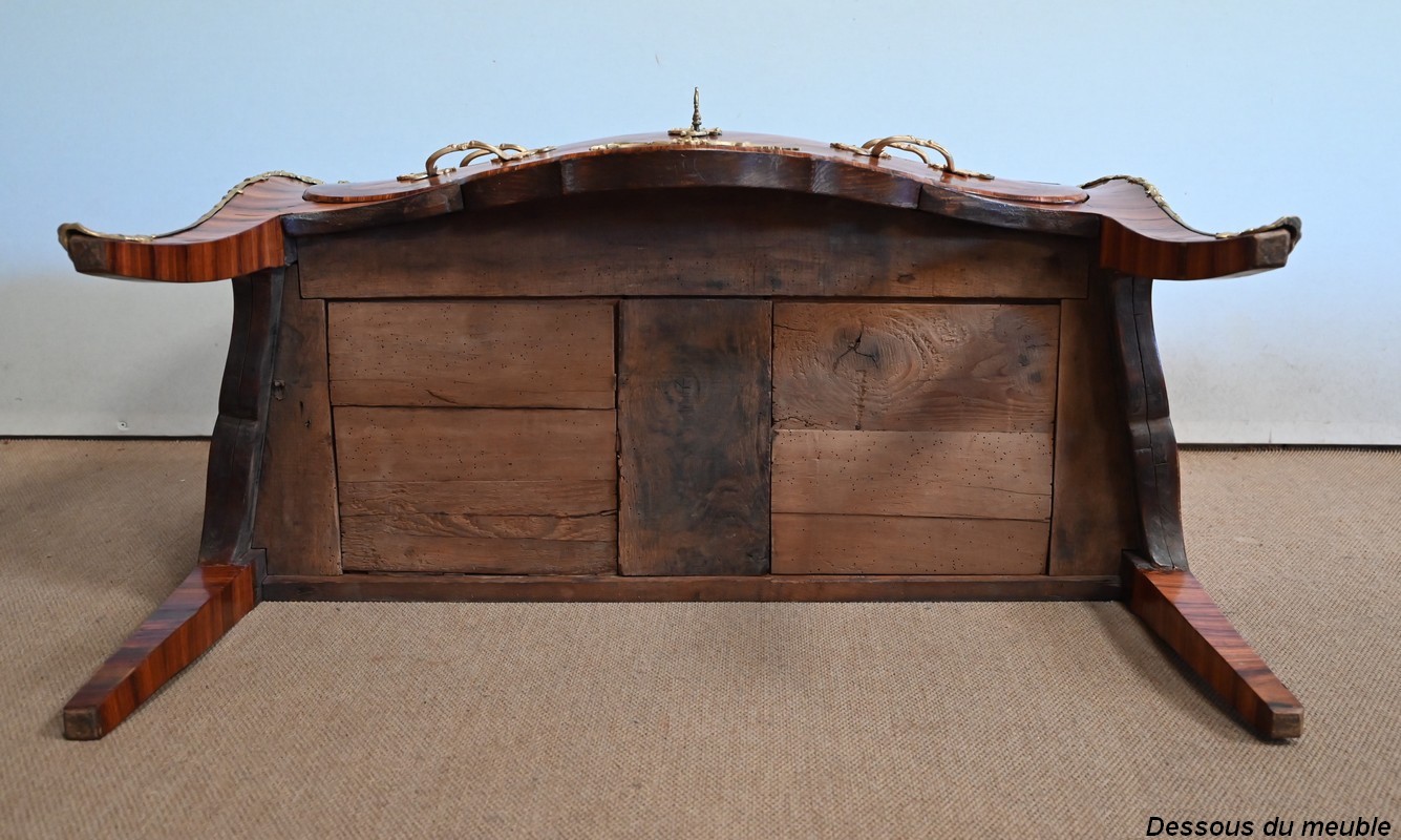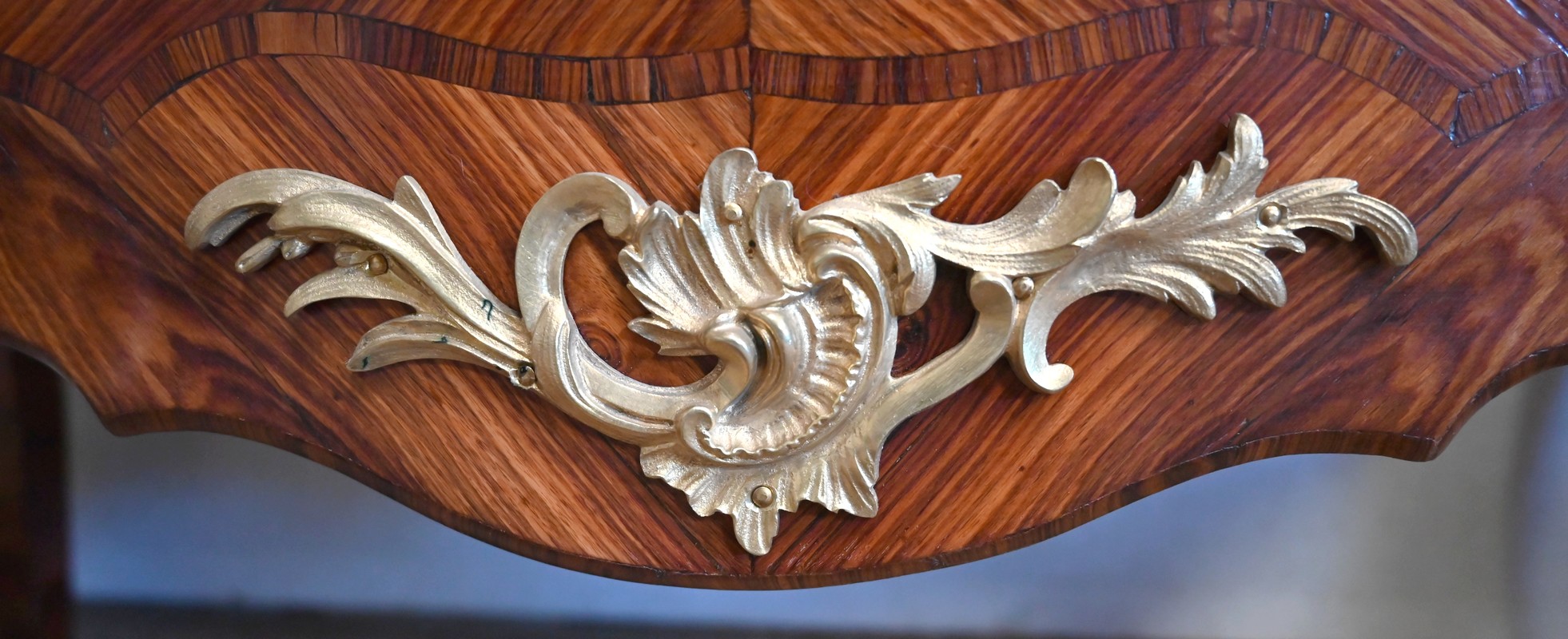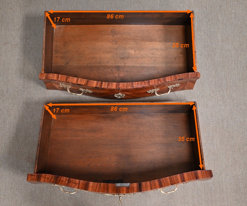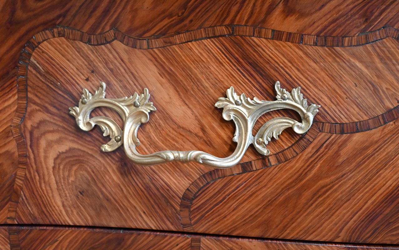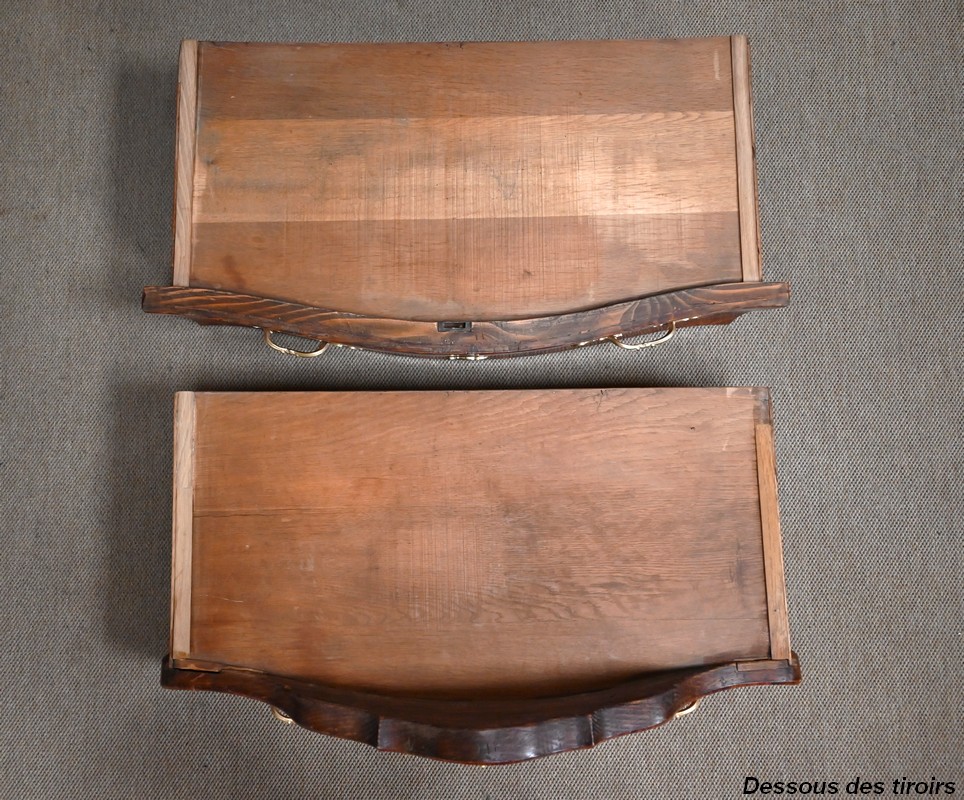 Ce meuble comprend deux tiroirs, galbés et ventrus, à traverses cachées, habillés de poignées de tirage en bronze et d’une entrée. Ils se verrouillent à l’aide d’une serrure d’origine en état de fonctionnement.