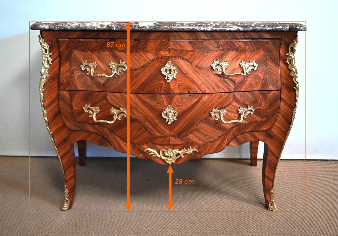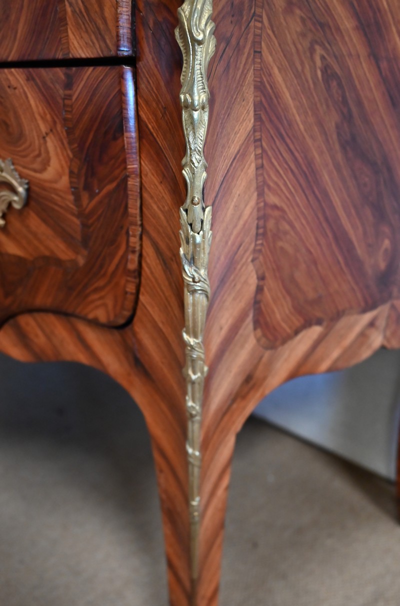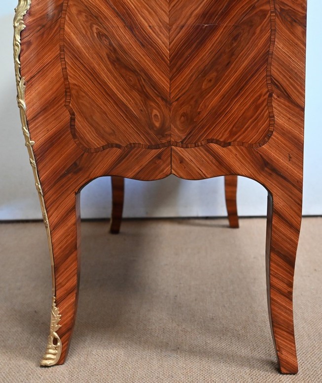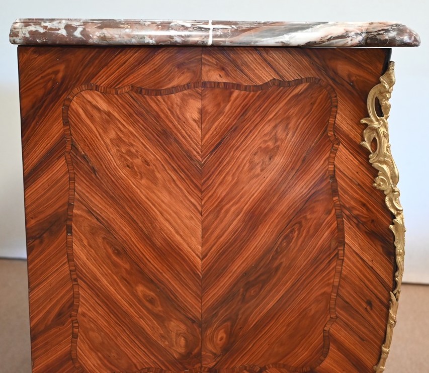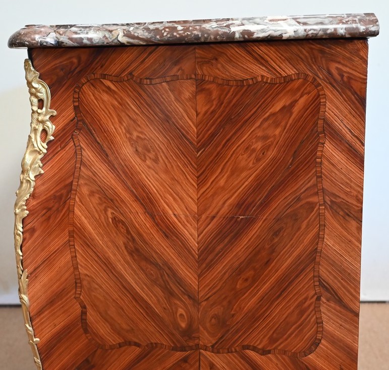 Commode en placage de bois de violette entouré de filet de bois de rose de même ton, disposé « à quatre-feuilles » en façade et « en ailes de papillon » sur les côtés.