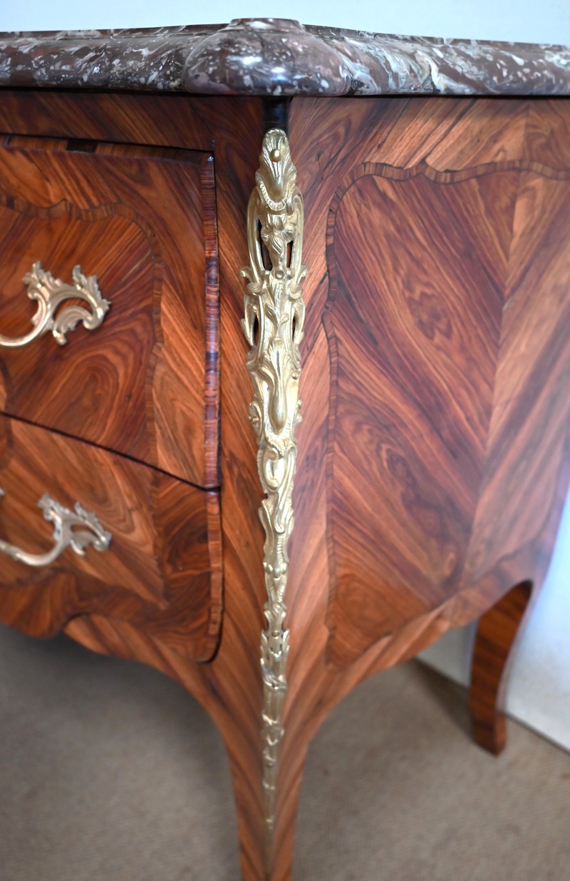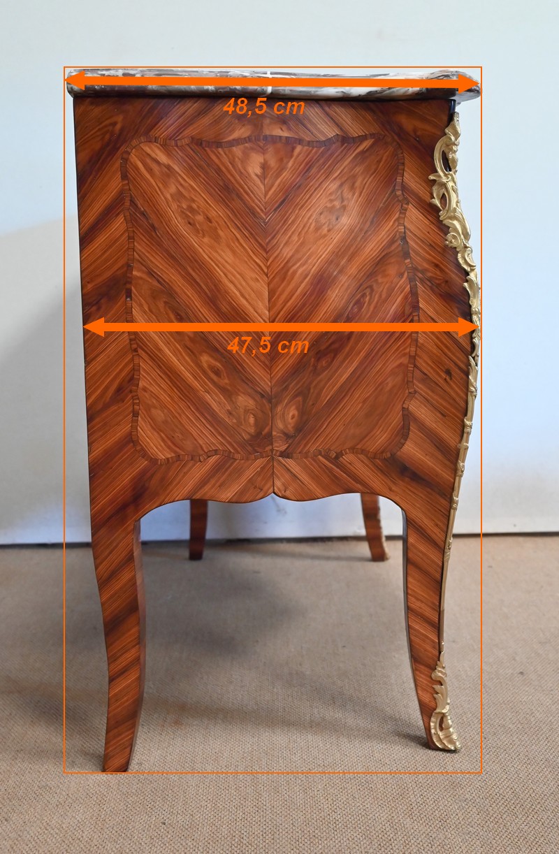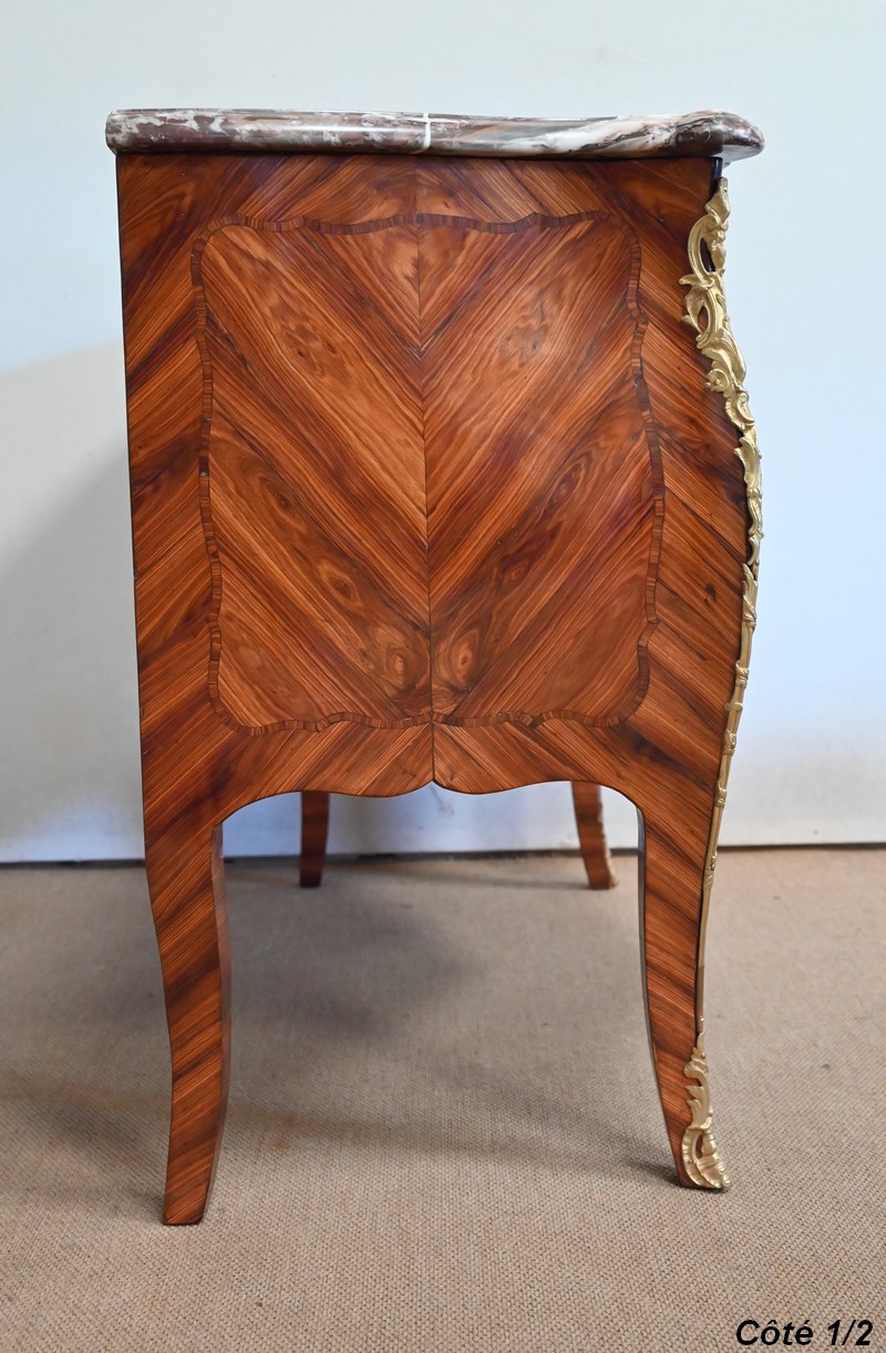 Commode en placage de bois de violette entouré de filet de bois de rose de même ton, disposé « à quatre-feuilles » en façade et « en ailes de papillon » sur les côtés.