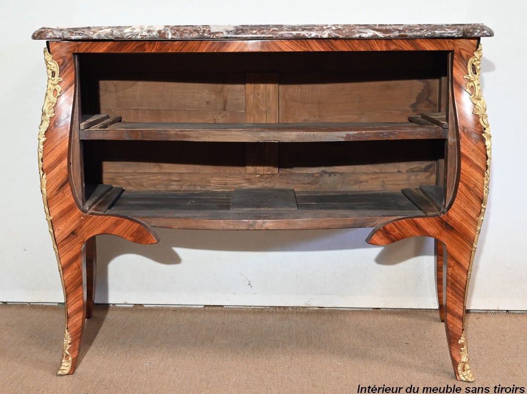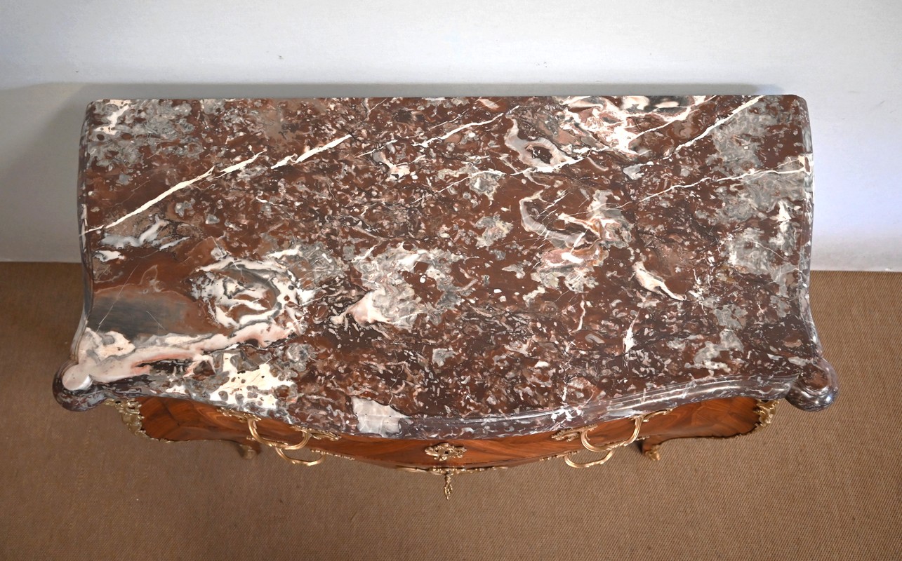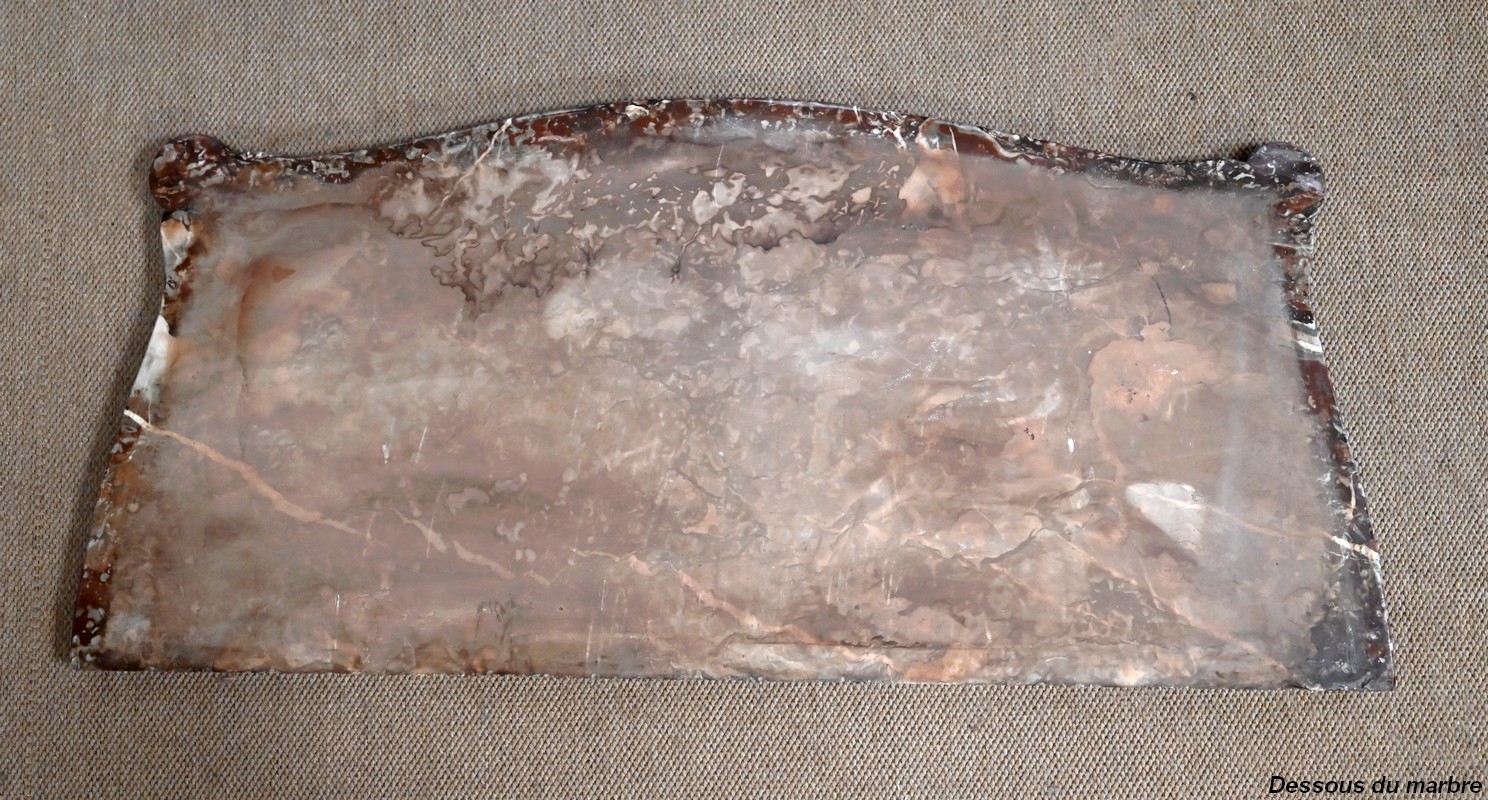 Sur le dessus, on retrouve un marbre épais d’origine, en brocatelle, dans les tons marron et blanc. Celui-ci épouse la forme de ce mobilier, il est mouluré en gorge et en bec-de-corbin avec ressaut aux angles.