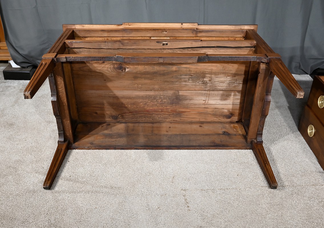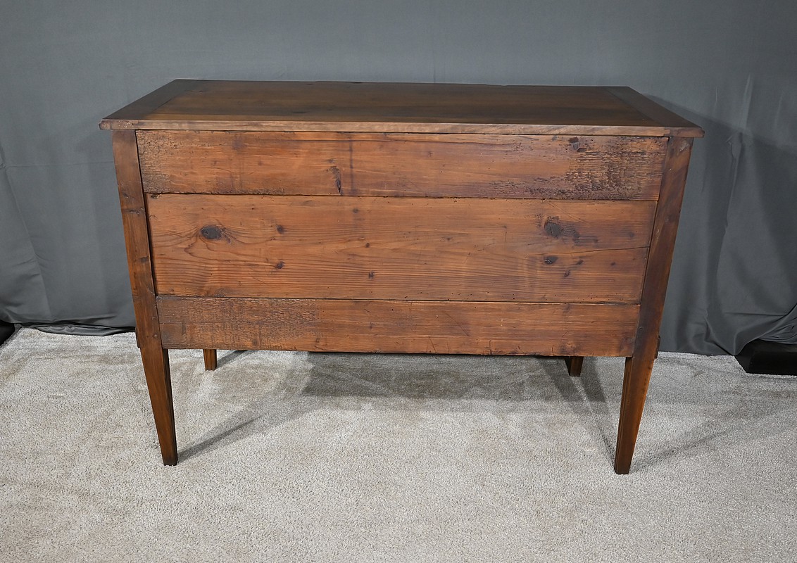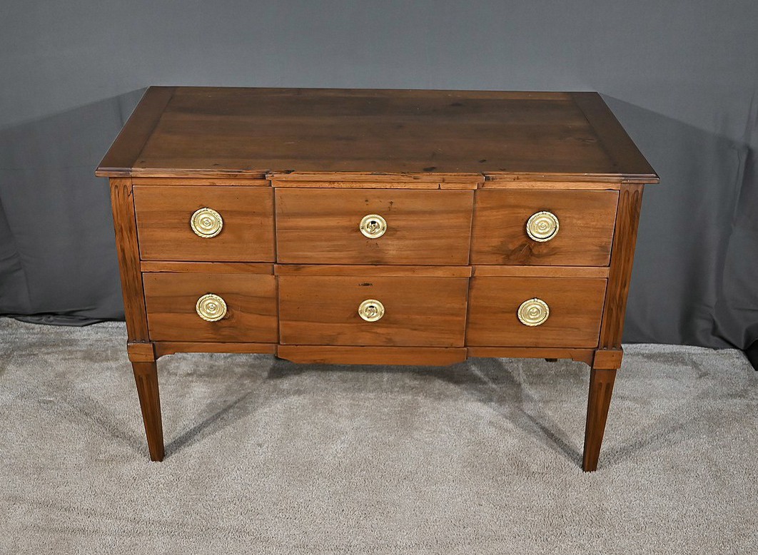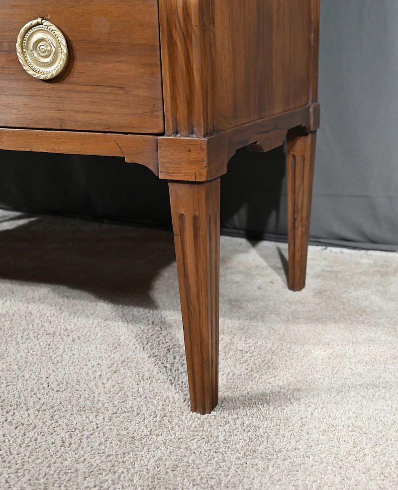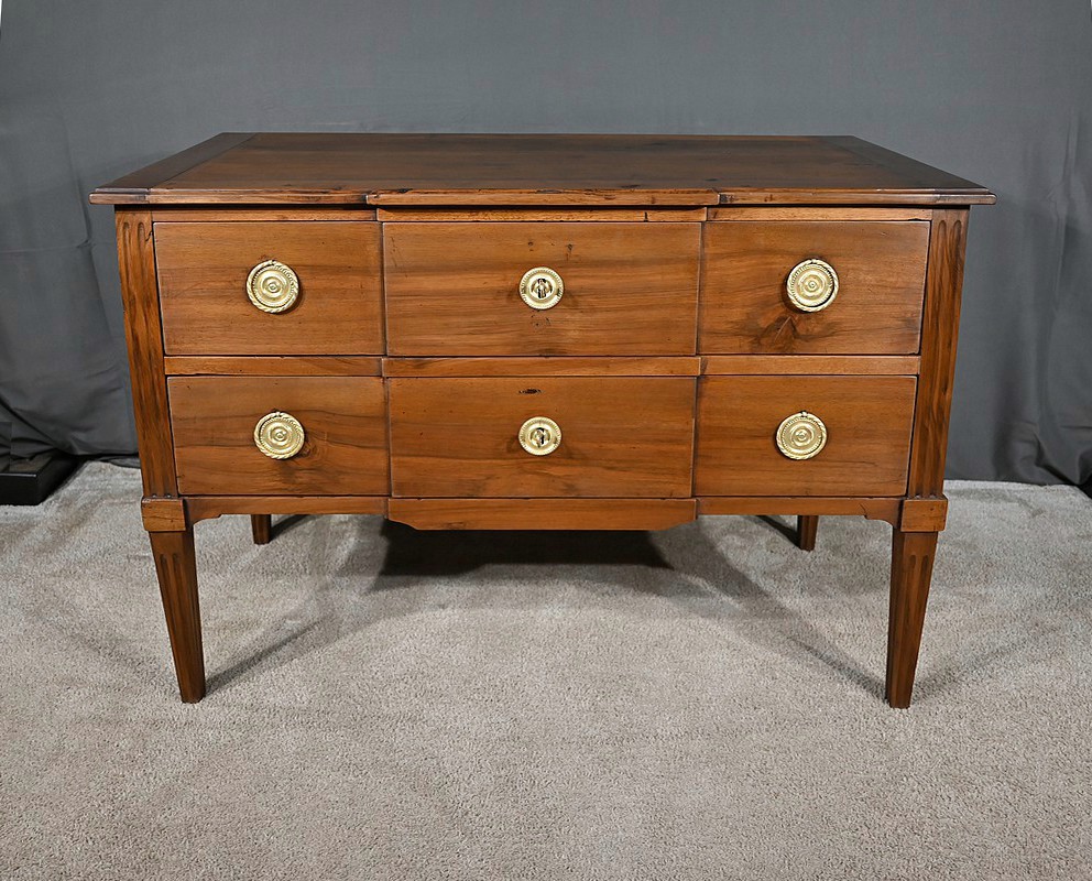 Commode à ressaut central en noyer mouluré, ouvrant par deux tiroirs de même dimension. Ces derniers, dont la façade forme d’élégants reliefs, sont équipés de serrures d’origine fonctionnelles avec clés et entrées ciselées. Ces tiroirs sont dotés chacun de deux poignées de tirage Louis XVI avec anneau. Cette commode repose sur quatre pieds fuselés ornés de cannelures, que l’on retrouve également sur les montants.