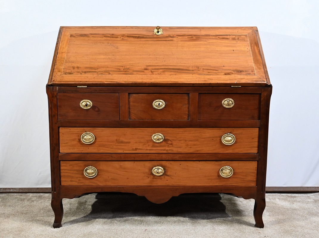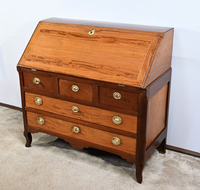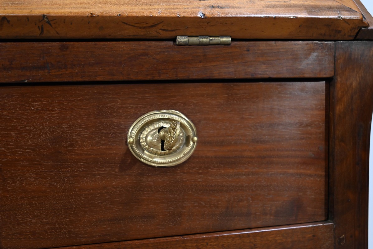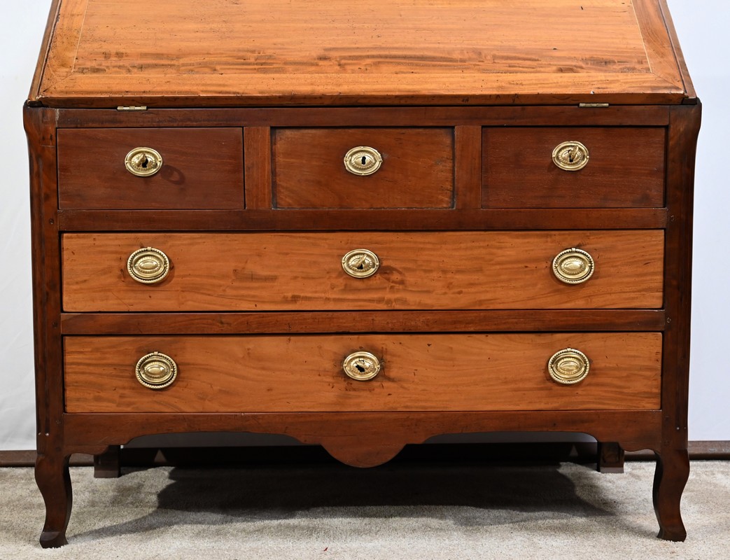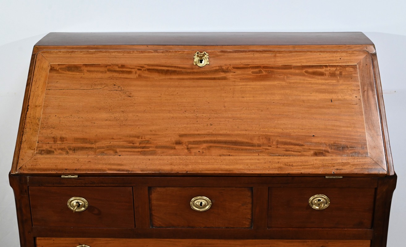 Acajou de Saint-Martin : deux tiroirs bas, abatant, panneaux bas et hauts des côtés.