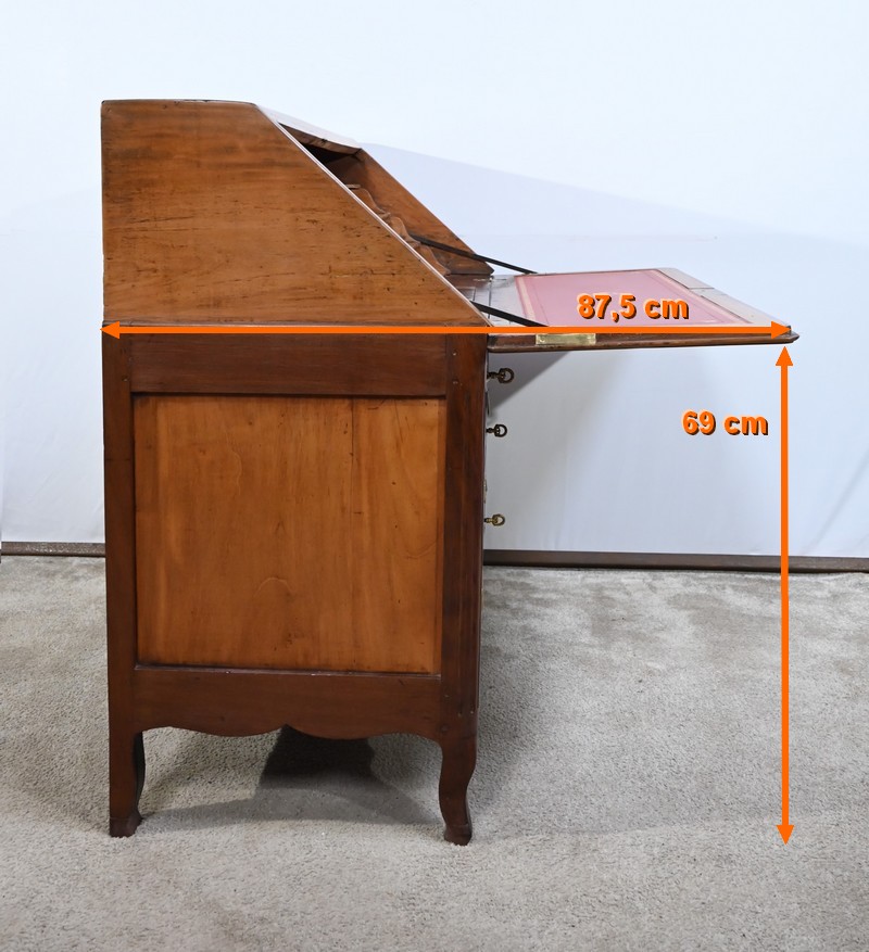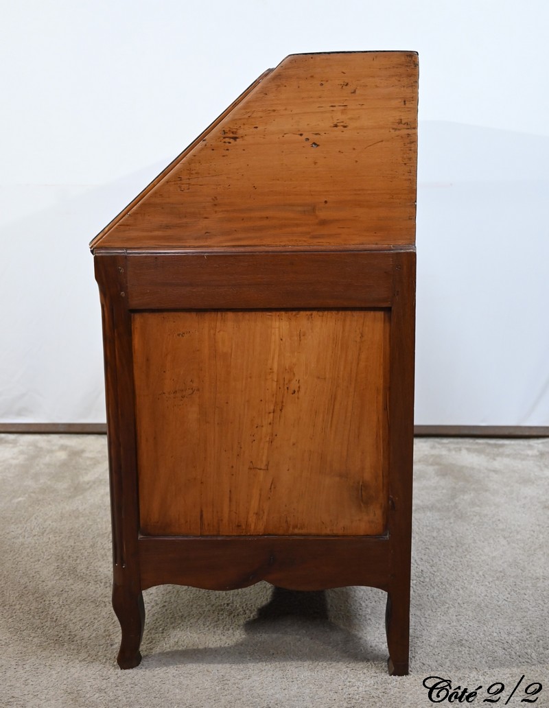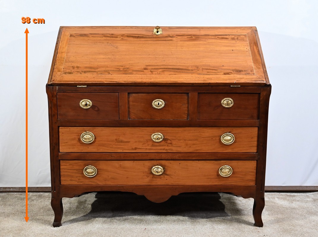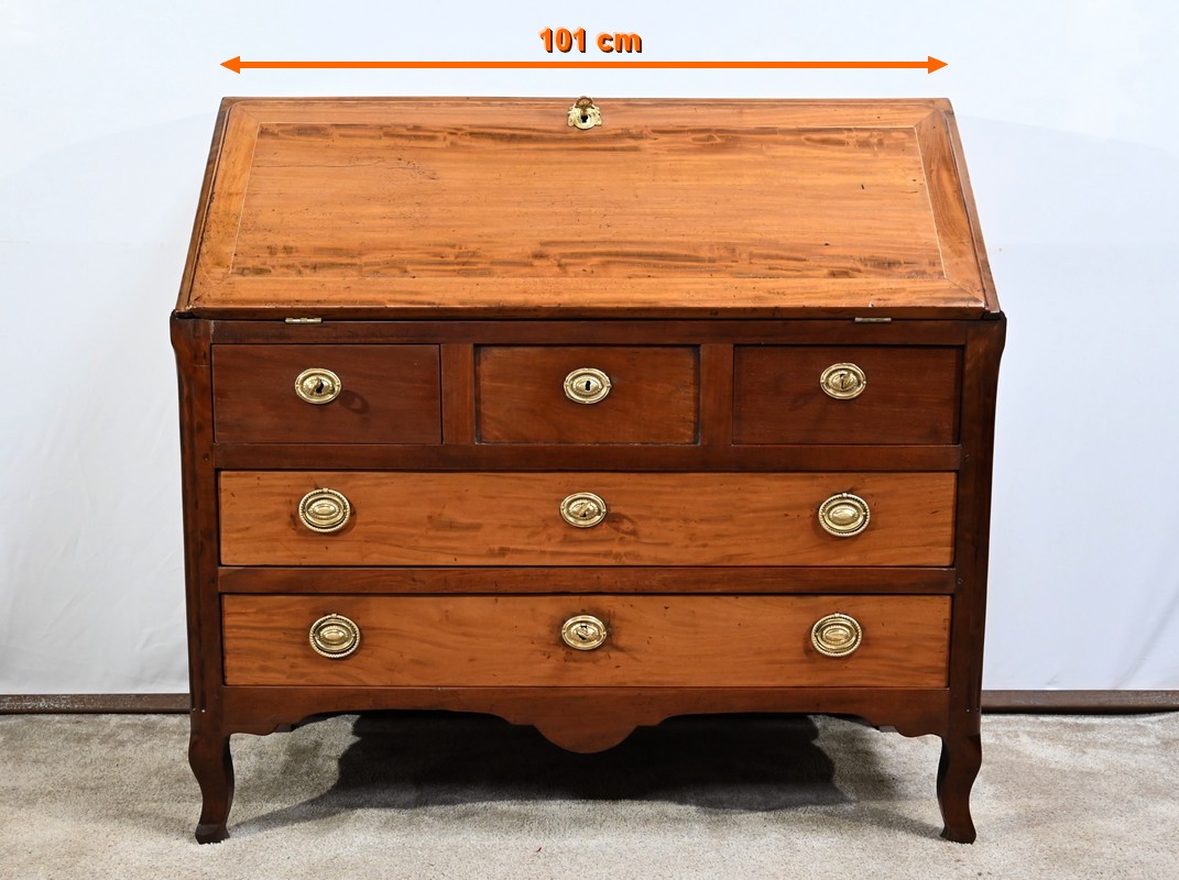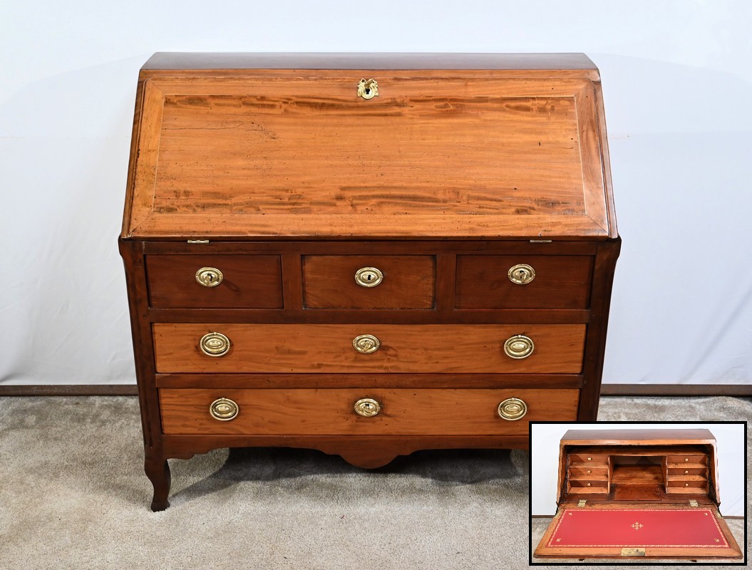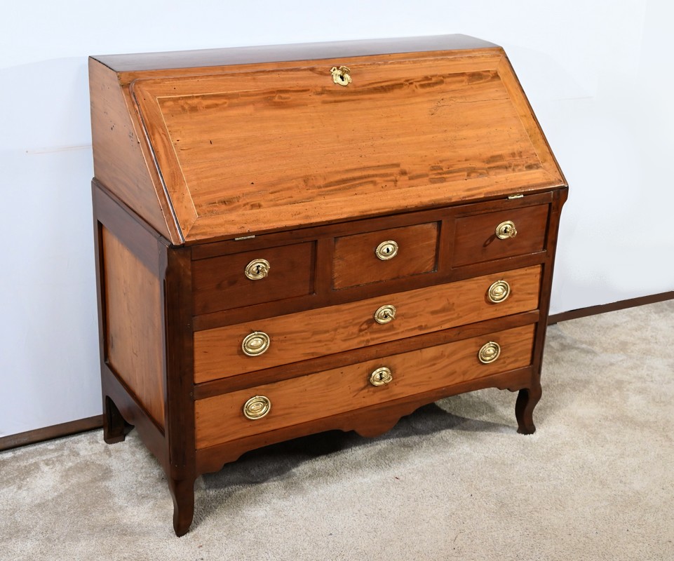 Acajou de Saint-Martin : deux tiroirs bas, abatant, panneaux bas et hauts des côtés.