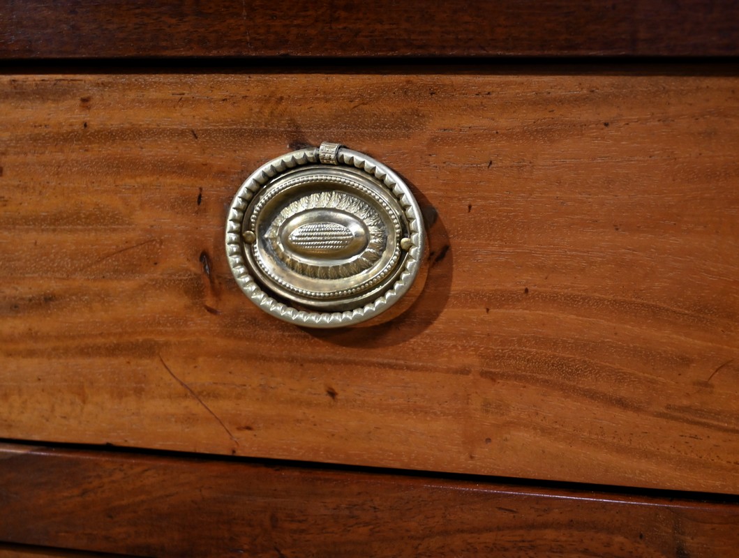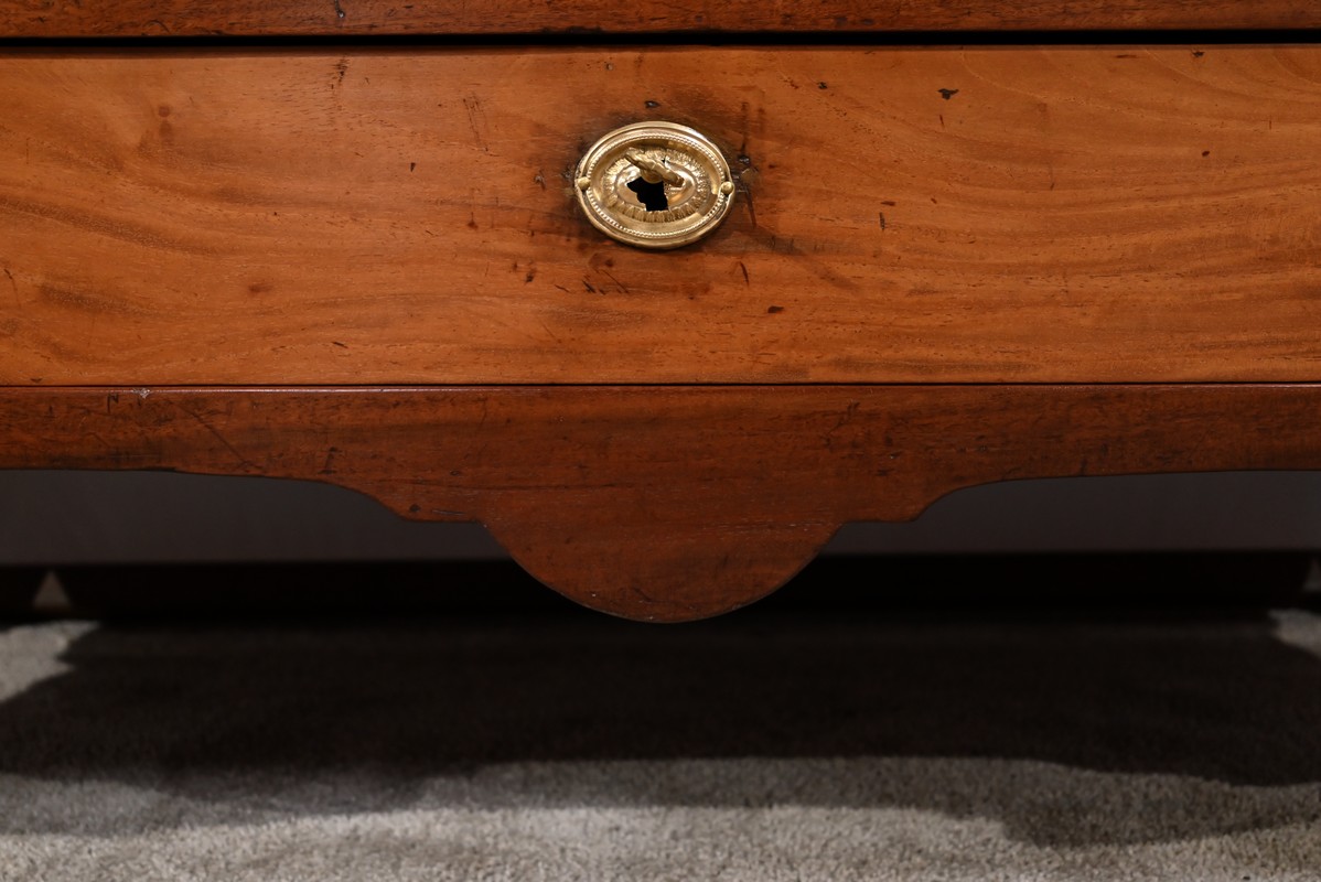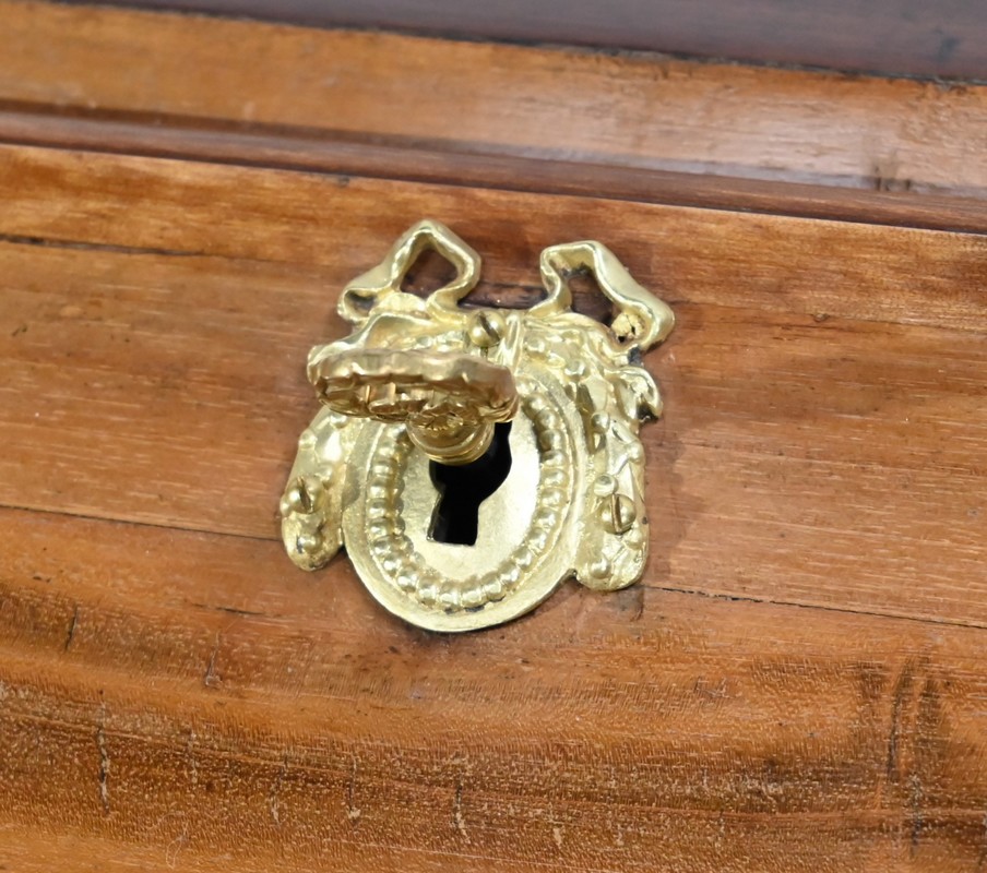 Ce meuble portuaire de la Rochelle ouvre par deux tiroirs identiques. Ils sont chacun munis de poignées ovales tombantes perlées avec mascarons et d’une entrée en laiton repoussé avec serrure d’origine avec clé postérieure ajustée.