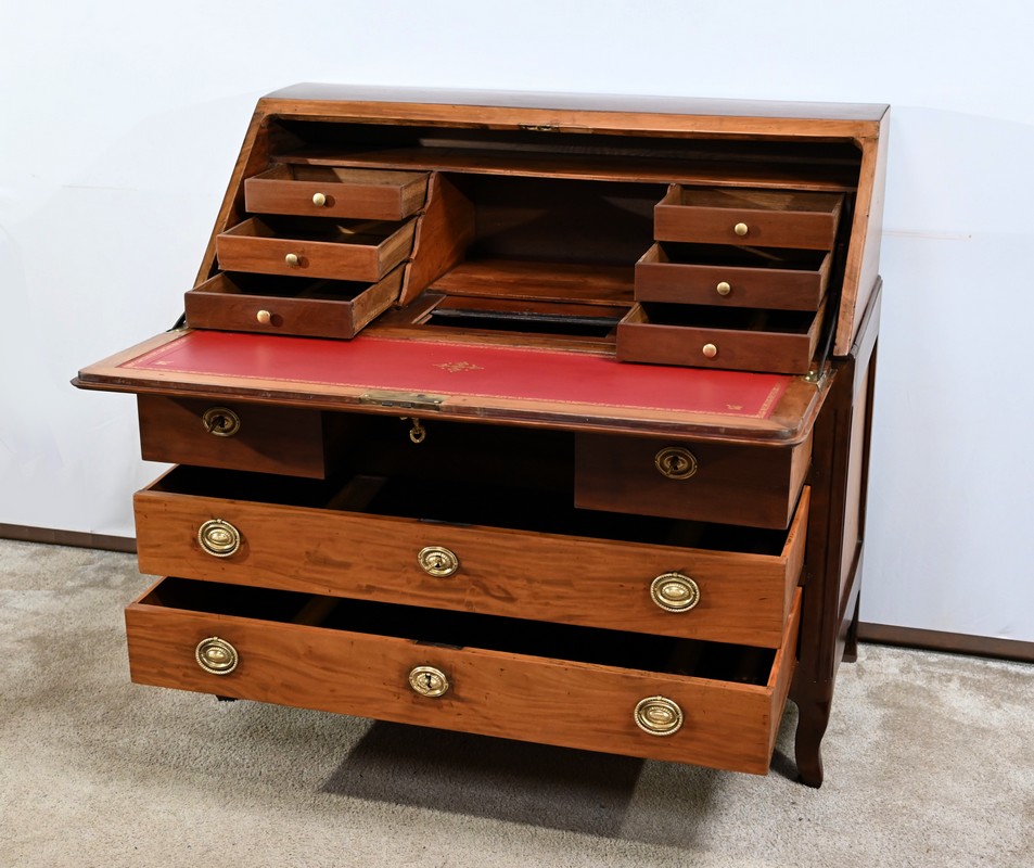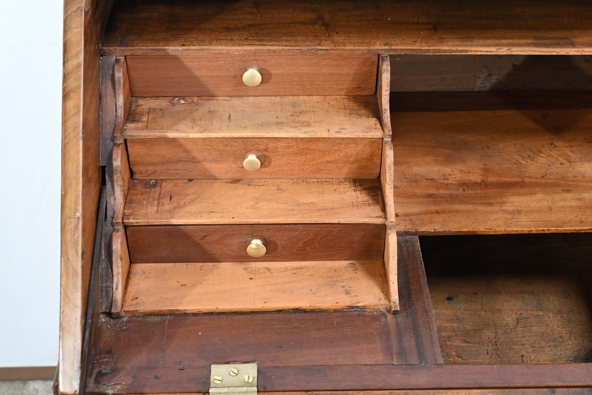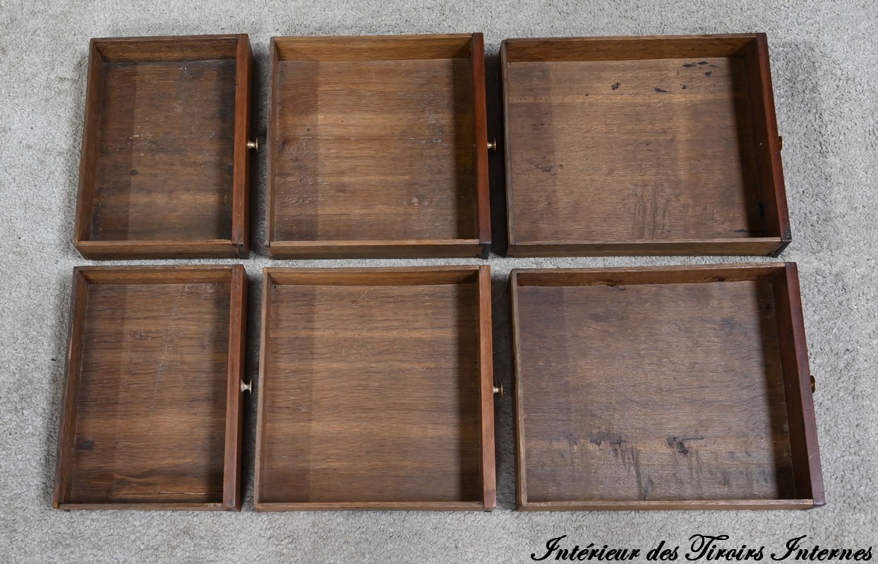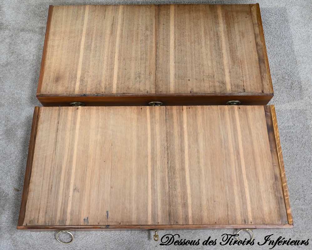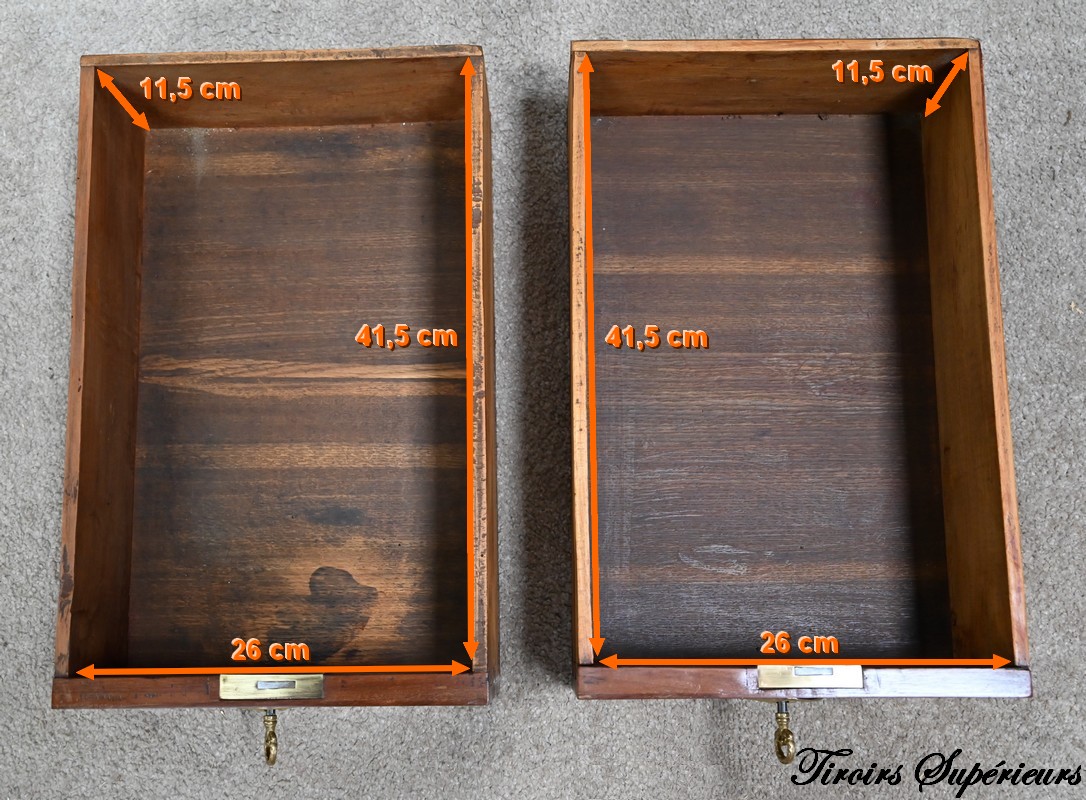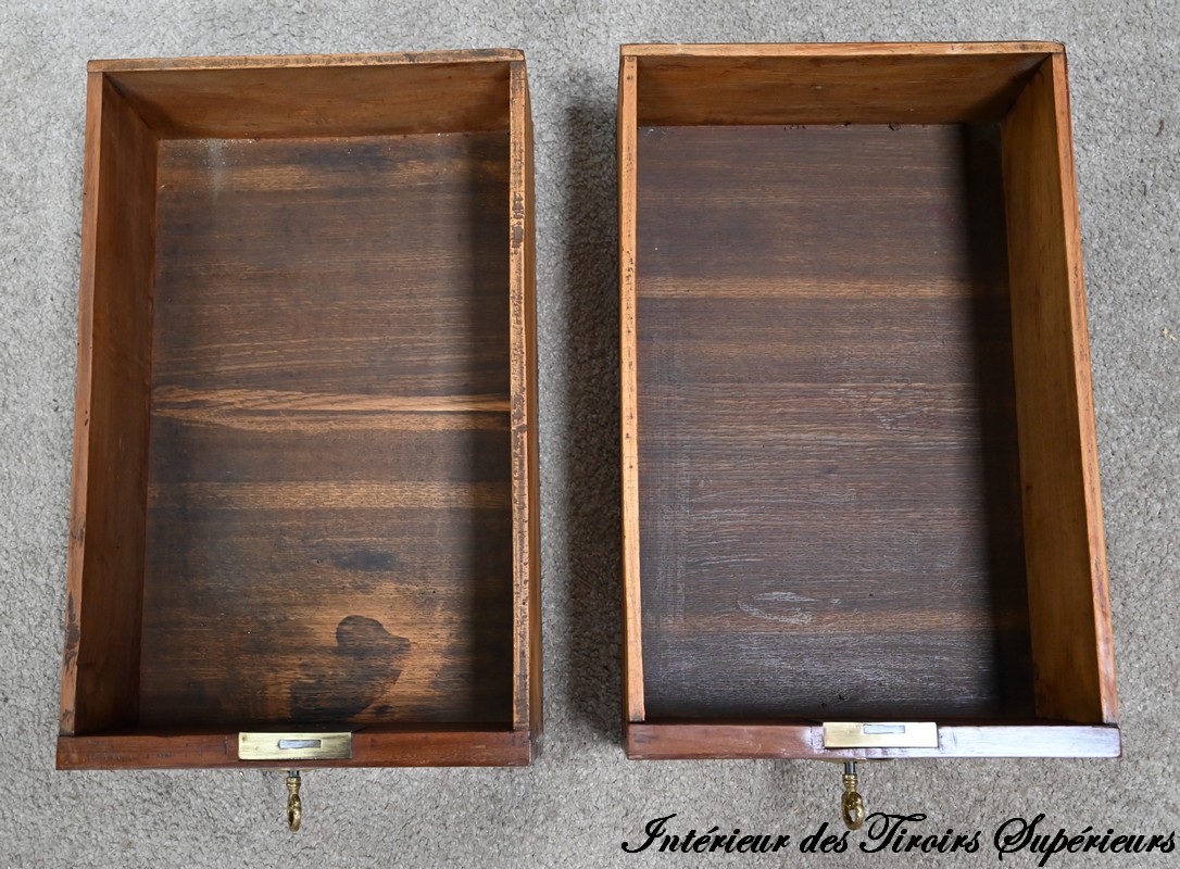 L’intérieur comporte deux parties de trois tiroirs à gradin, à façade en acajou massif, agrémenté de bouton laiton.