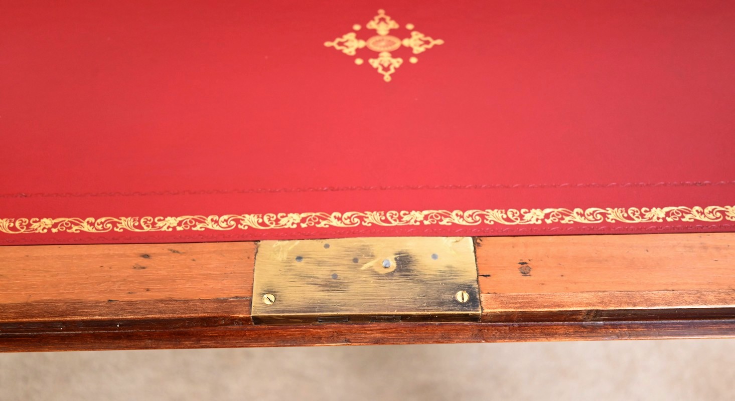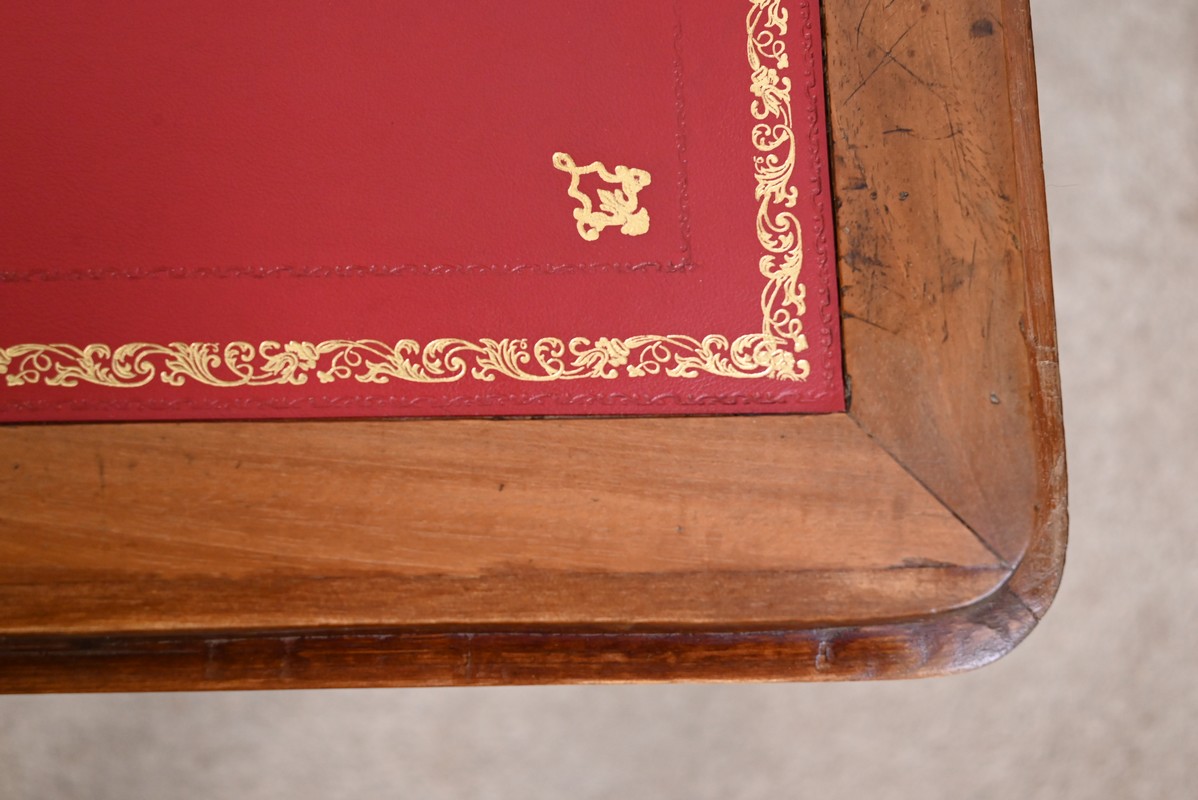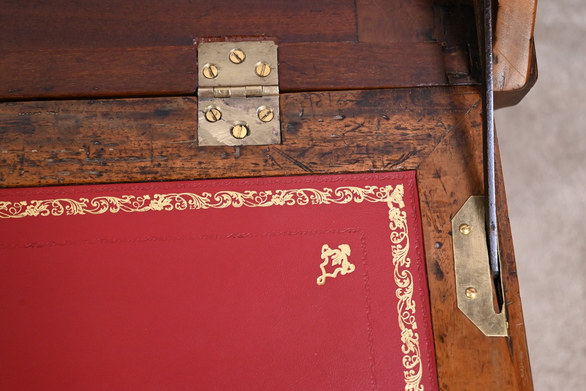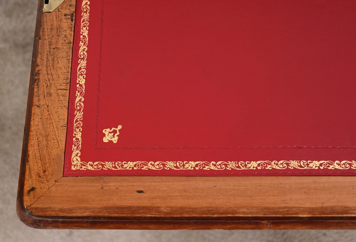 La partie écritoire est habillée d’un cuir refait, couleur sang de bœuf, avec vignette dorée, vignette à froid, motifs d’angle et central.