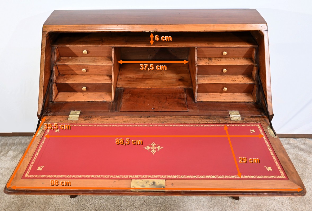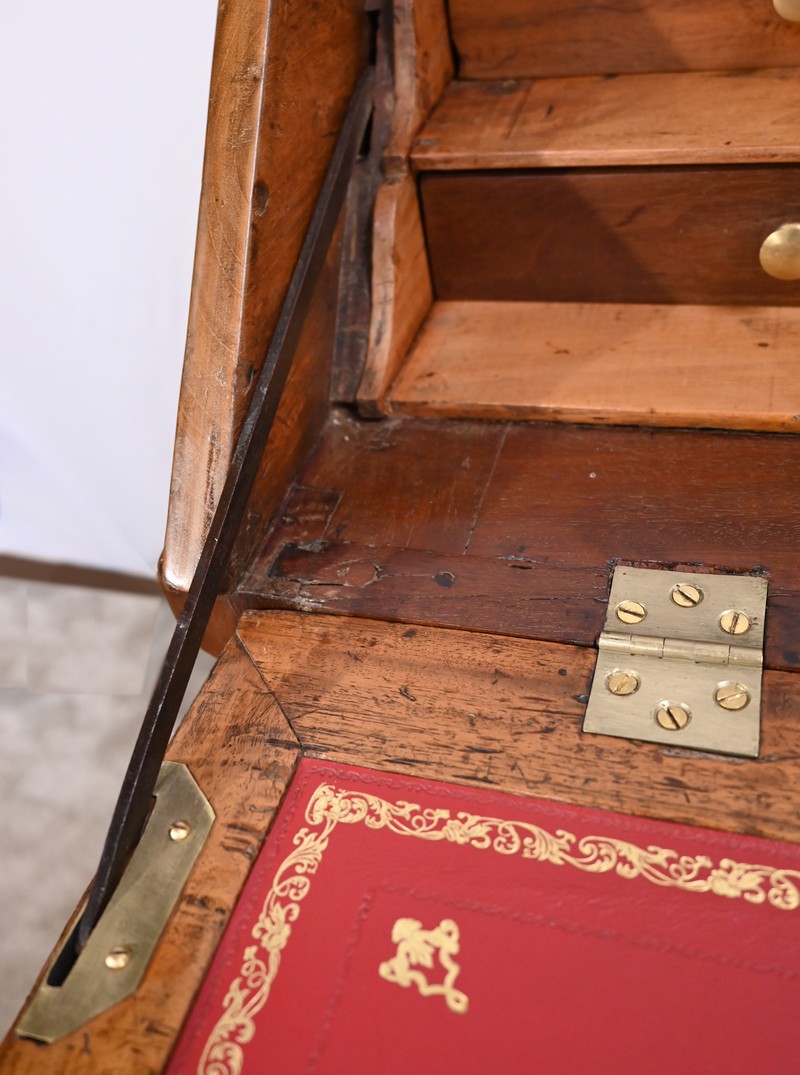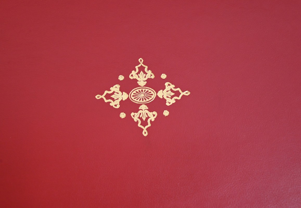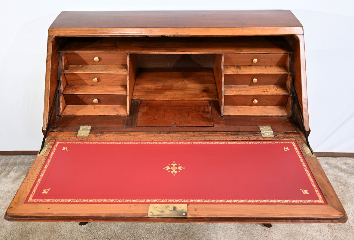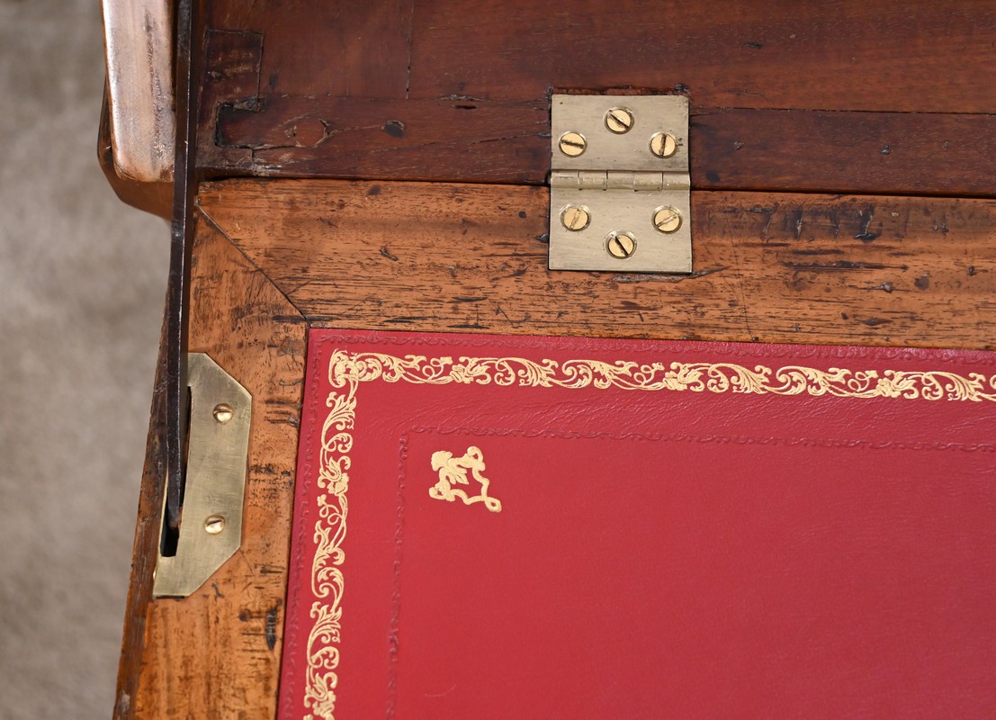 La partie écritoire est habillée d’un cuir refait, couleur sang de bœuf, avec vignette dorée, vignette à froid, motifs d’angle et central.