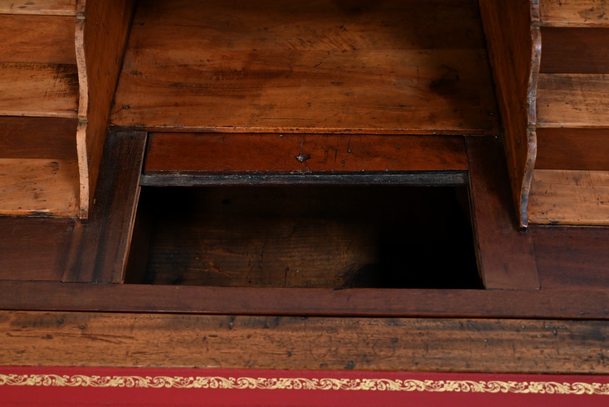 L’abattant en applique, avec cadre à coupe d’onglet et foncé d’un seul panneau, est munis d’une entrée bronze et d’une serrure à deux peignes avec clé bronze ajustée.