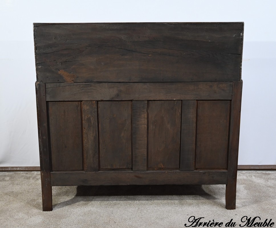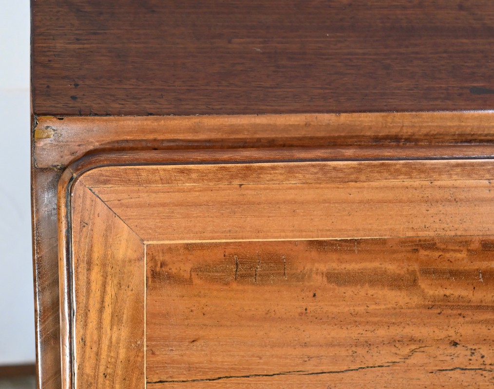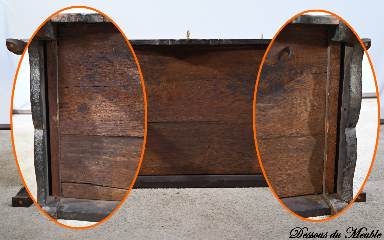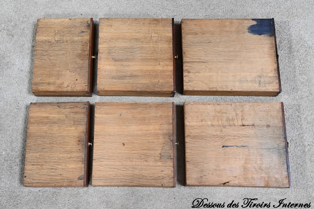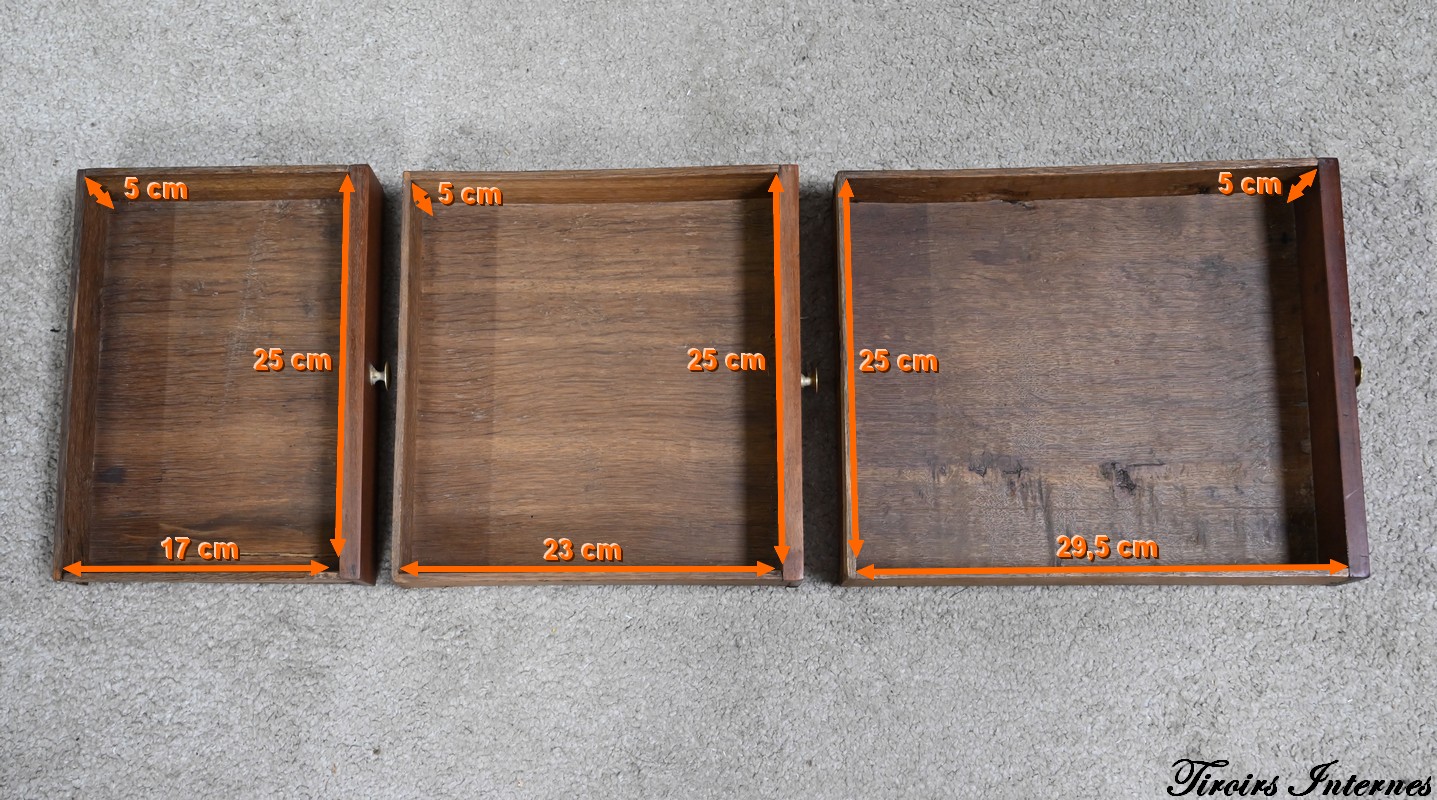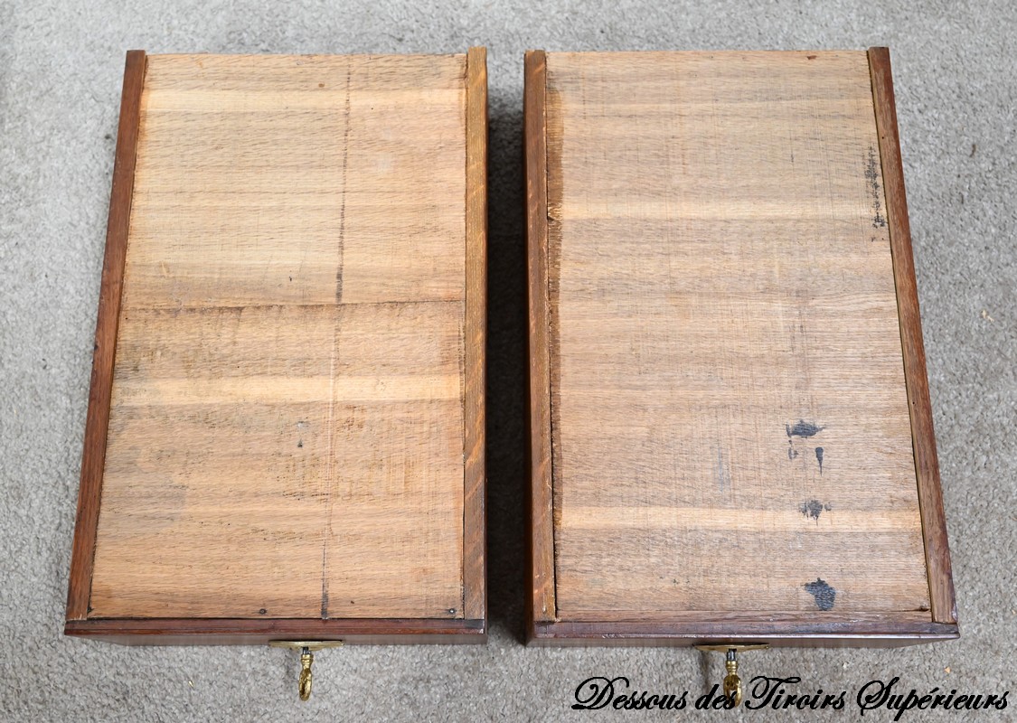Tiroirs : présence de cache-poussière, montage à queue d’aronde, côtés en hêtre et fond en chêne