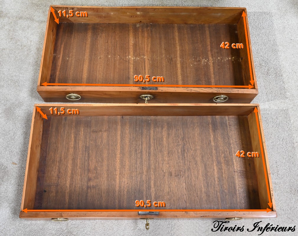 Ce meuble offre également deux tiroirs supérieurs, plus petits, également équipés d’entrées, de serrures avec clés et séparés par un faux tiroir.