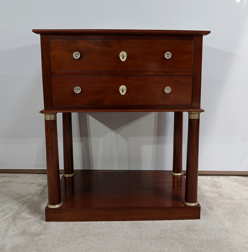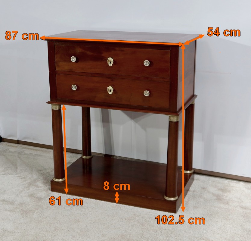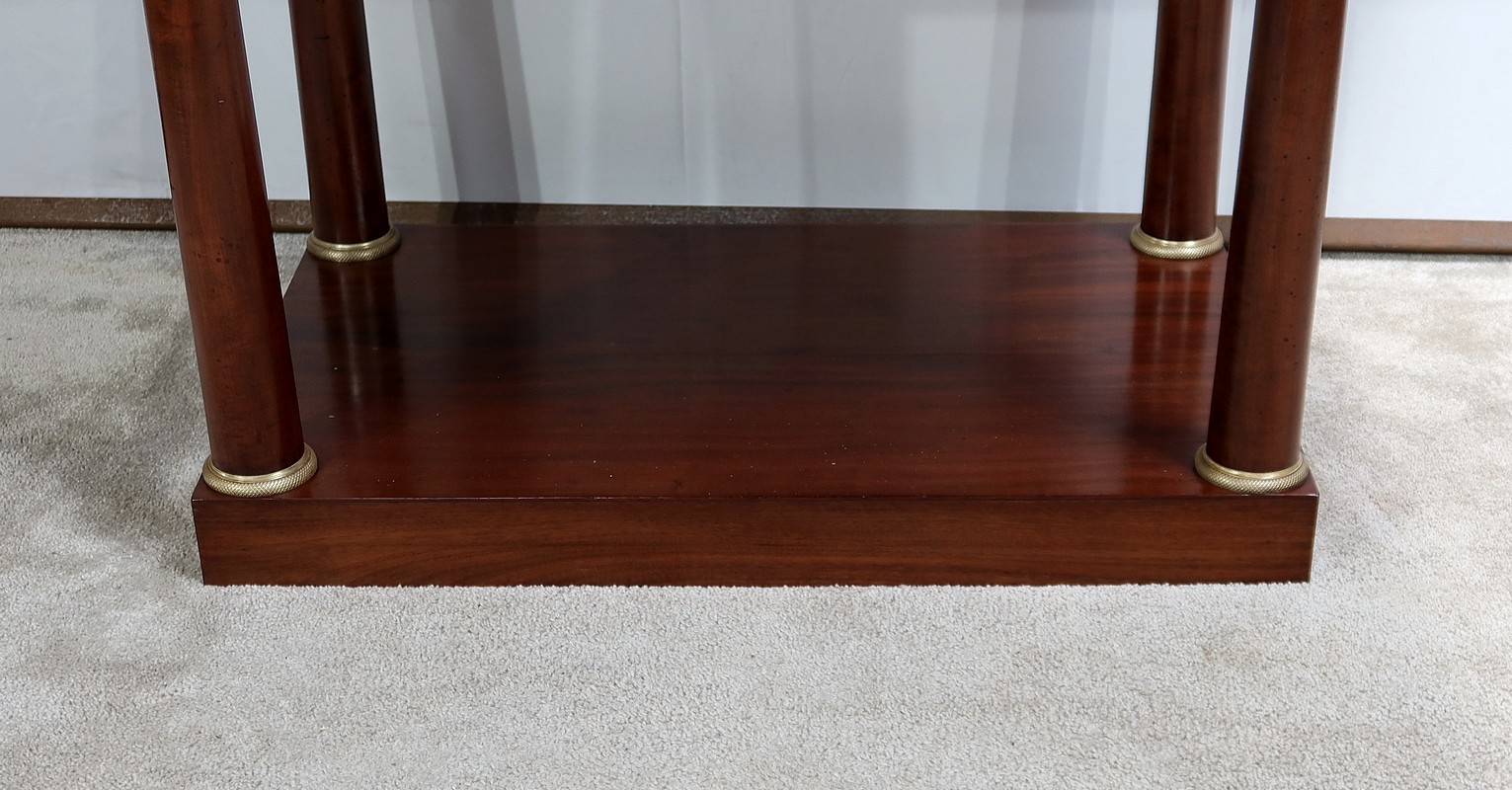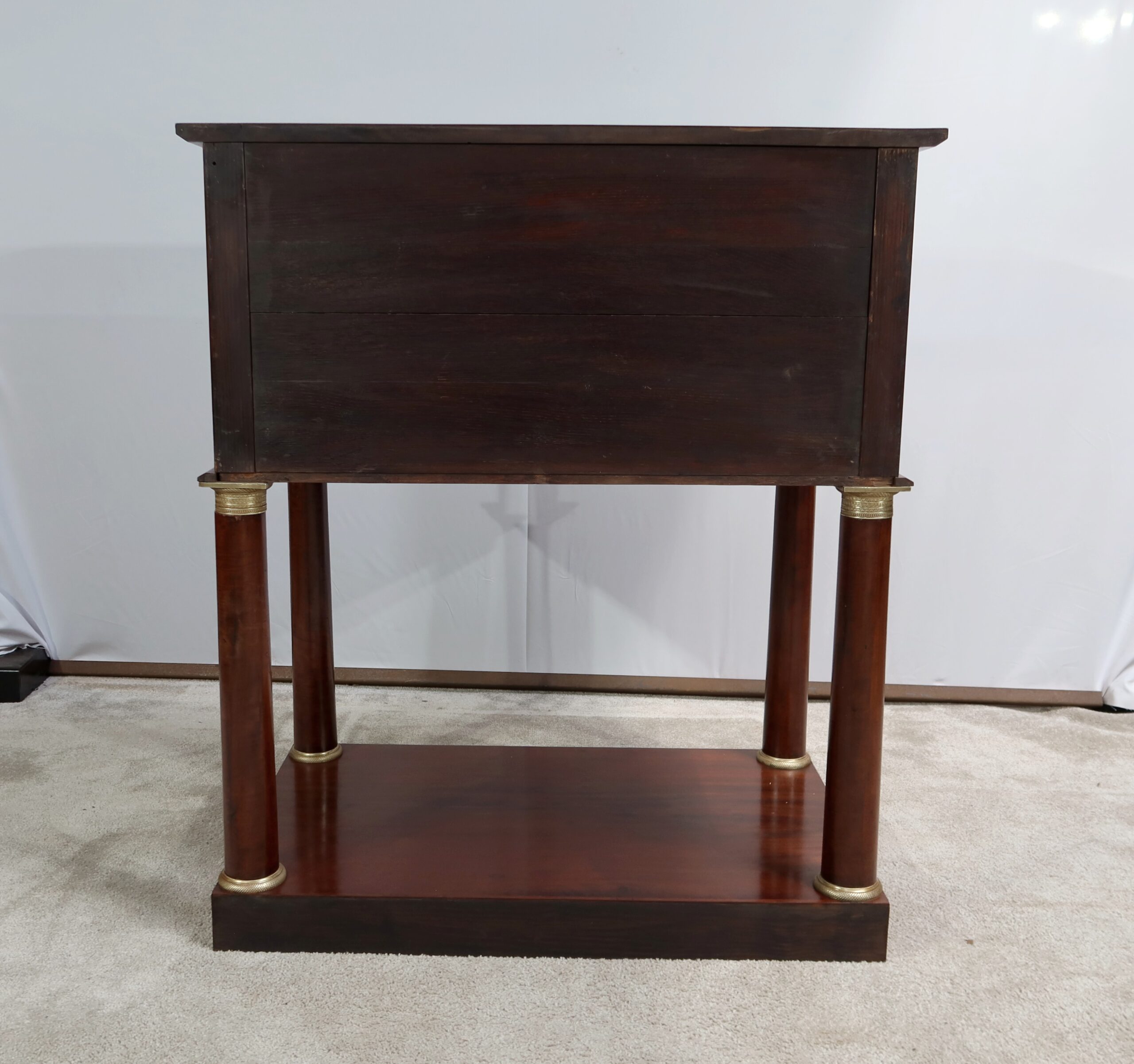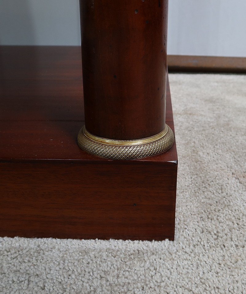 Rare console de prestance en acajou et en placage d’acajou ouvrant en partie haute par deux grands tiroirs identiques se tirant avec des boutons « cuvette » authentiques ciselés en bronze. La fermeture de chaque tiroir se fait avec une serrure d’origine accompagnée d’une clé postérieure en état de fonctionnement.