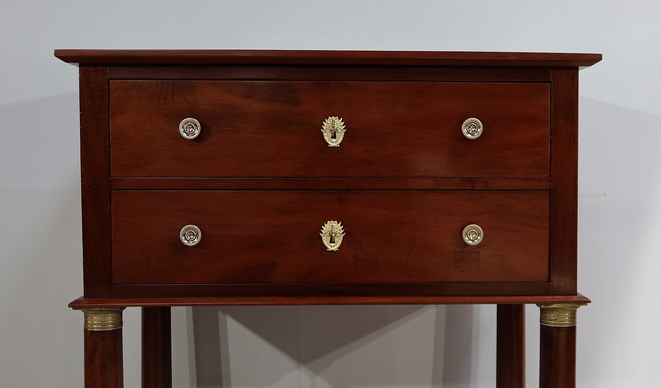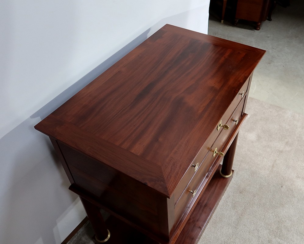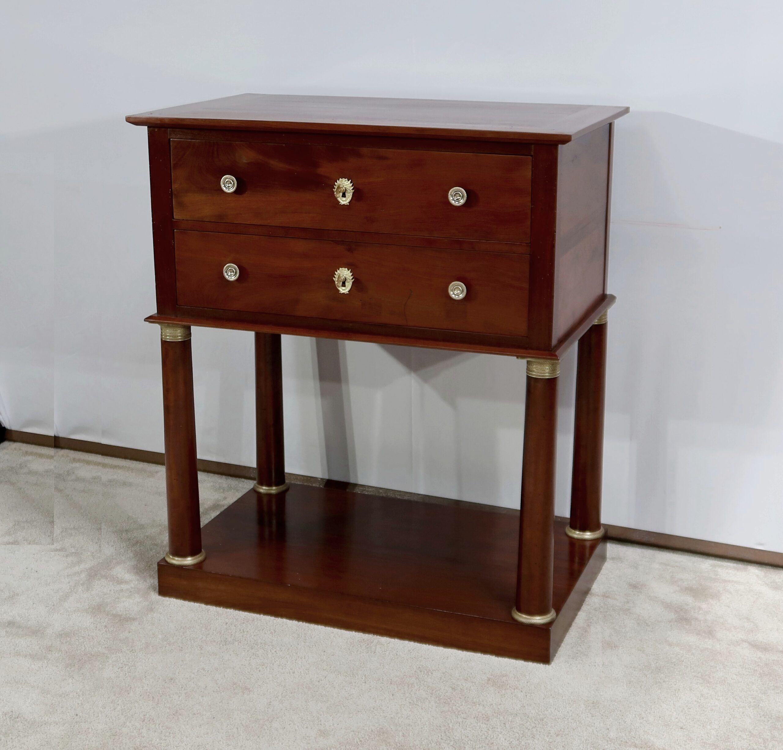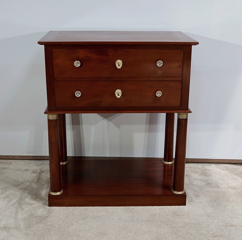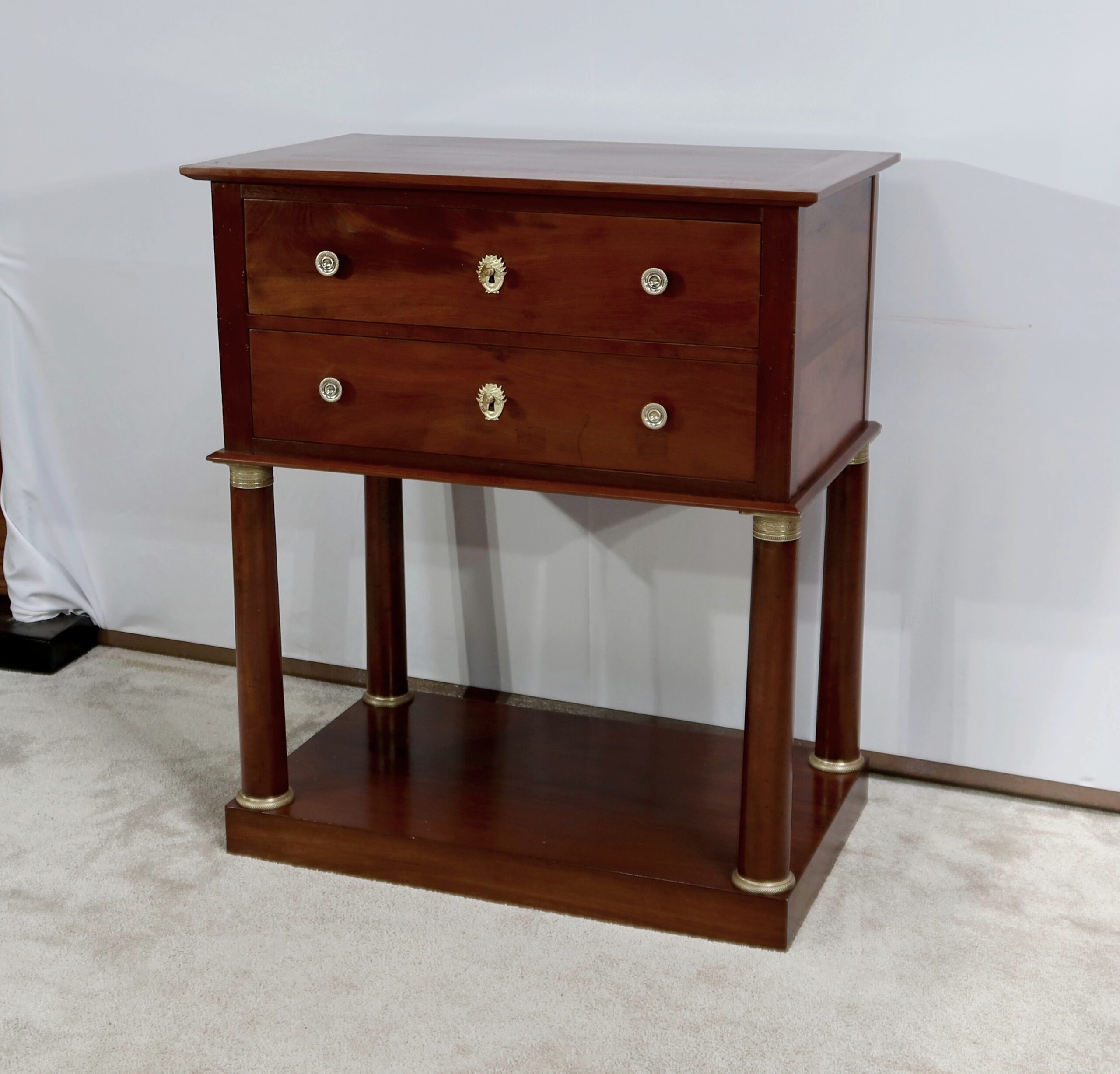 Rare console de prestance en acajou et en placage d’acajou ouvrant en partie haute par deux grands tiroirs identiques se tirant avec des boutons « cuvette » authentiques ciselés en bronze. La fermeture de chaque tiroir se fait avec une serrure d’origine accompagnée d’une clé postérieure en état de fonctionnement.