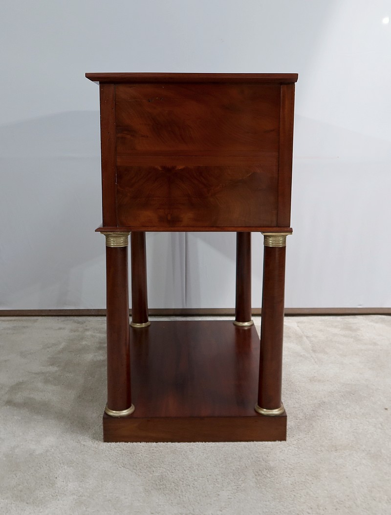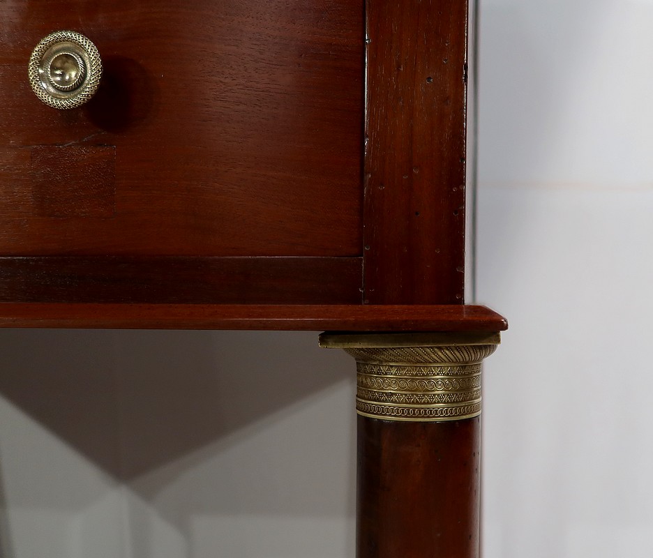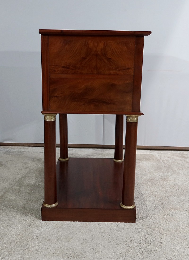 Ce bloc est soutenu sur quatre colonnes cylindriques en placage de ronce d’acajou s’élargissant vers le bas. Ces colonnes sont agrémentées d’une bague en bronze aux ornementations minutieuses en partie haute et d’une collerette ciselée en partie basse. L’ensemble repose sur une base avec une socle plein.