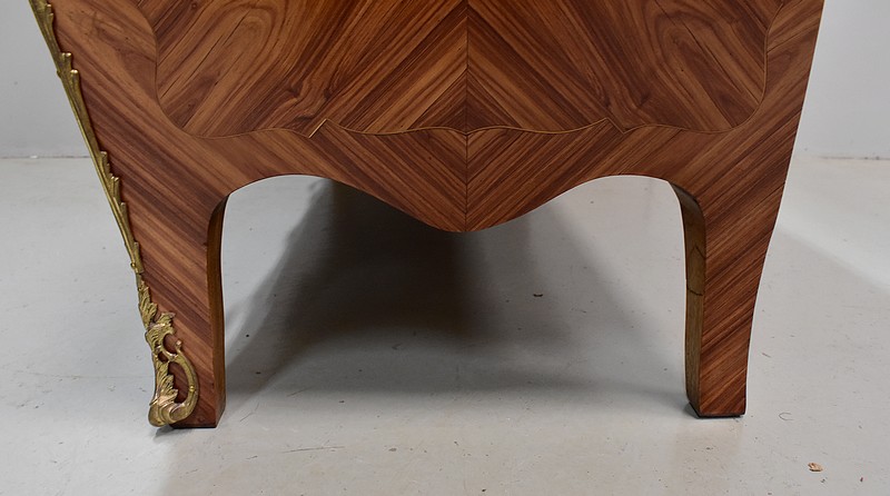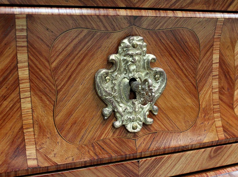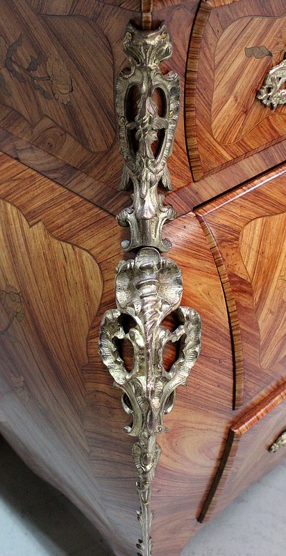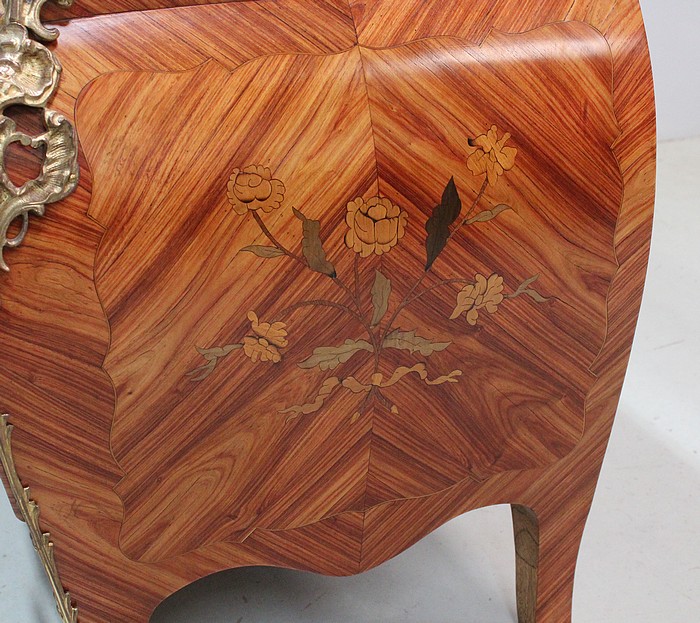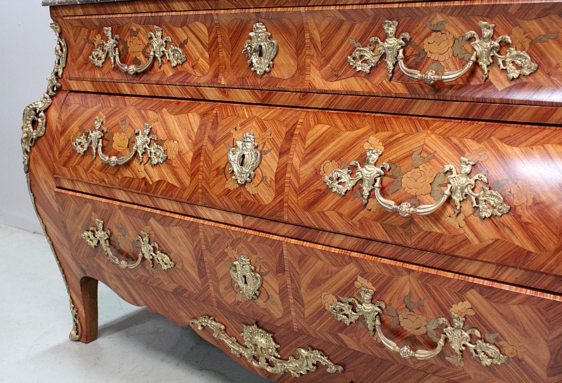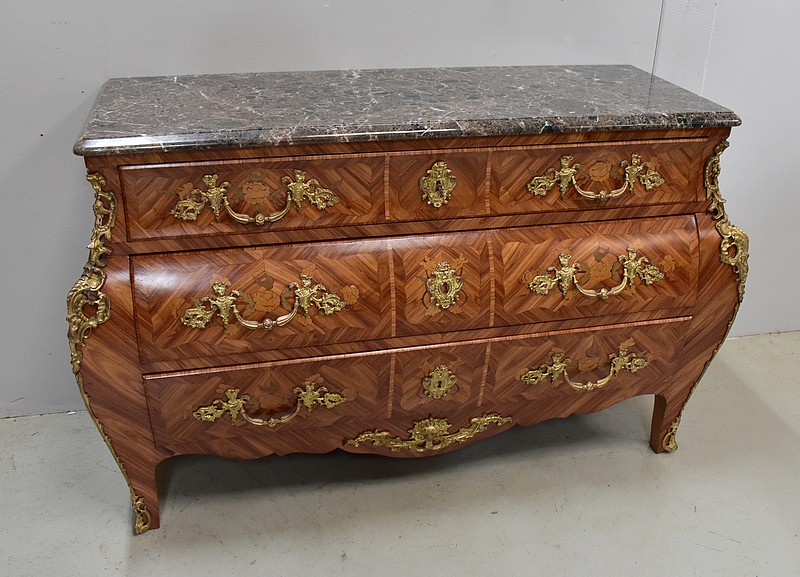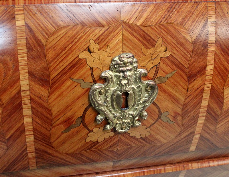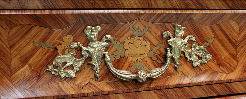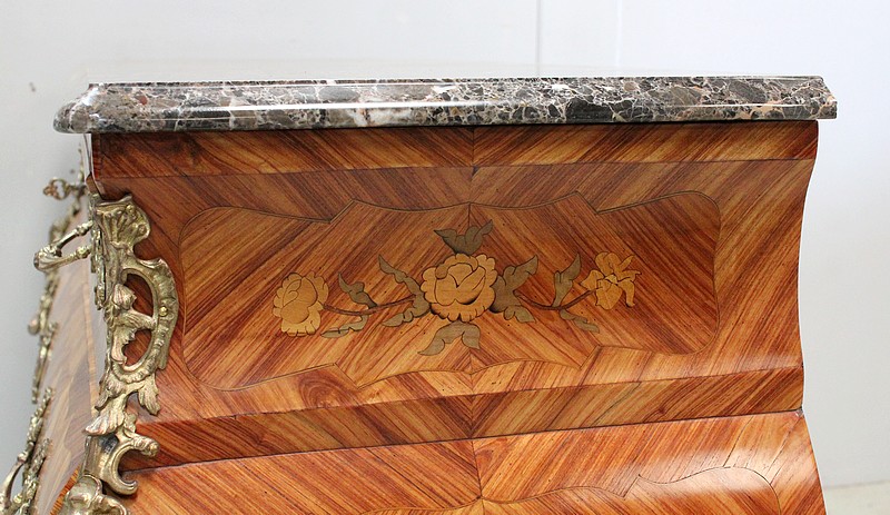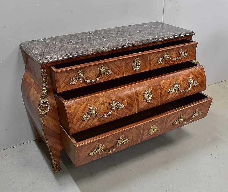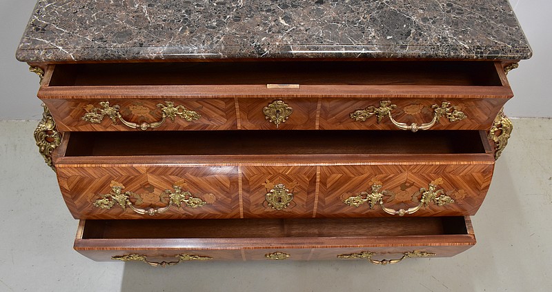 Commode de style Louis XIV, dite « Tombeau », offrant par définition des lignes généreusement courbes, une façade Bombée et des côtés ventrus.