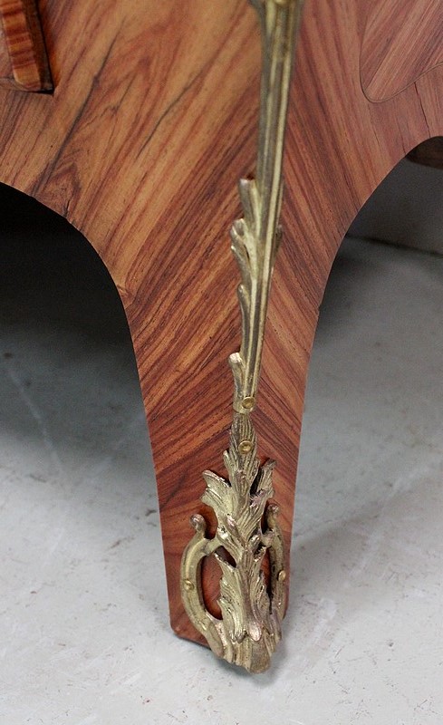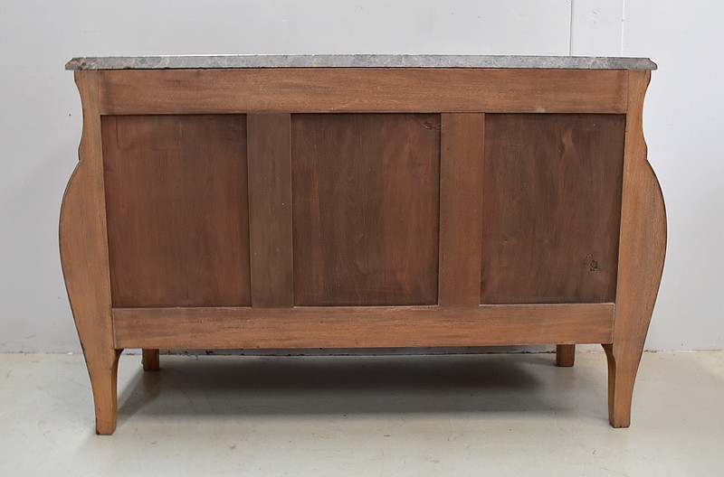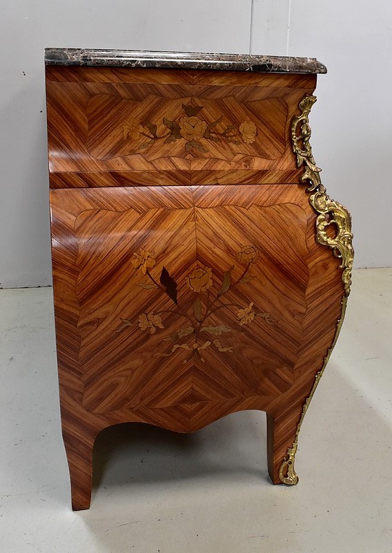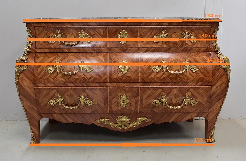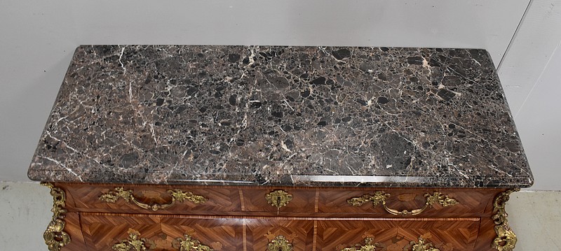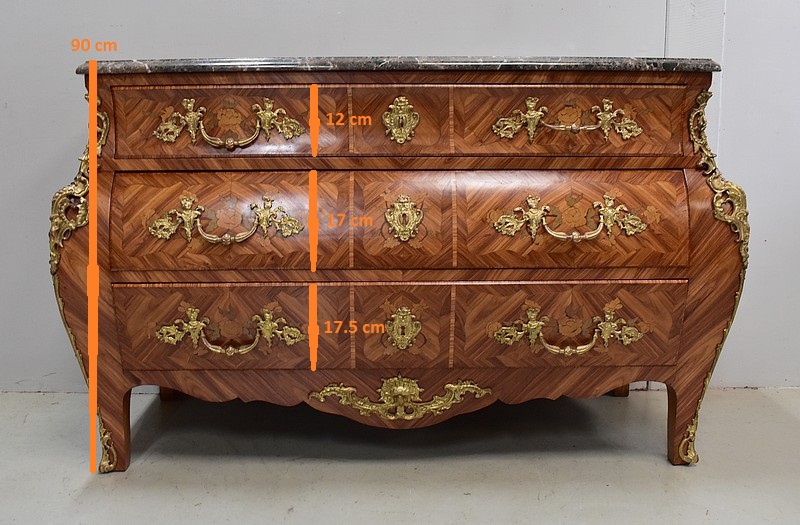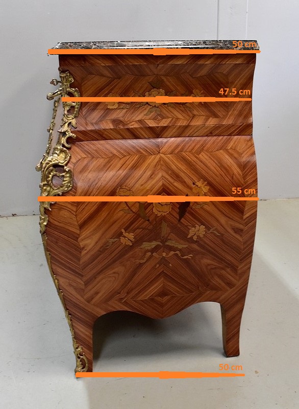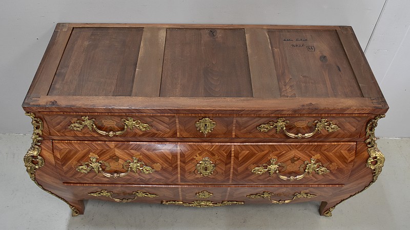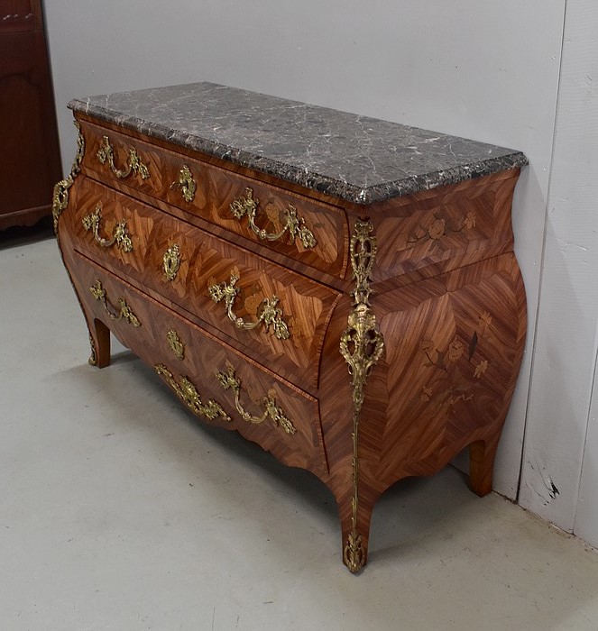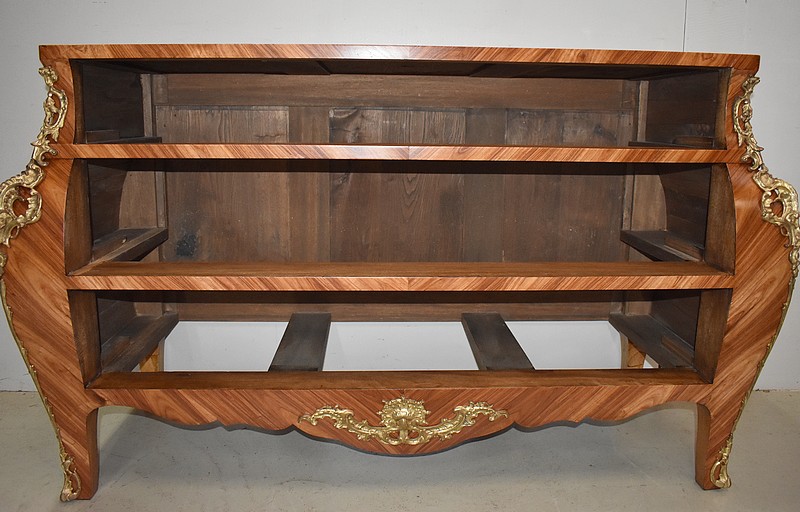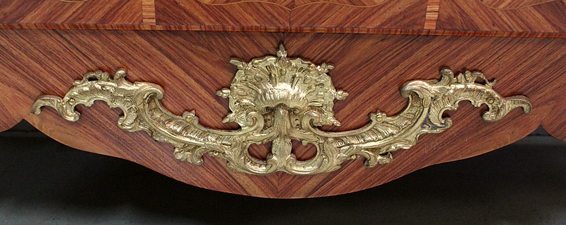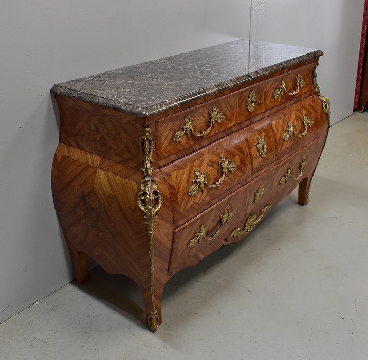 Commode de style Louis XIV, dite « Tombeau », offrant par définition des lignes généreusement courbes, une façade Bombée et des côtés ventrus.