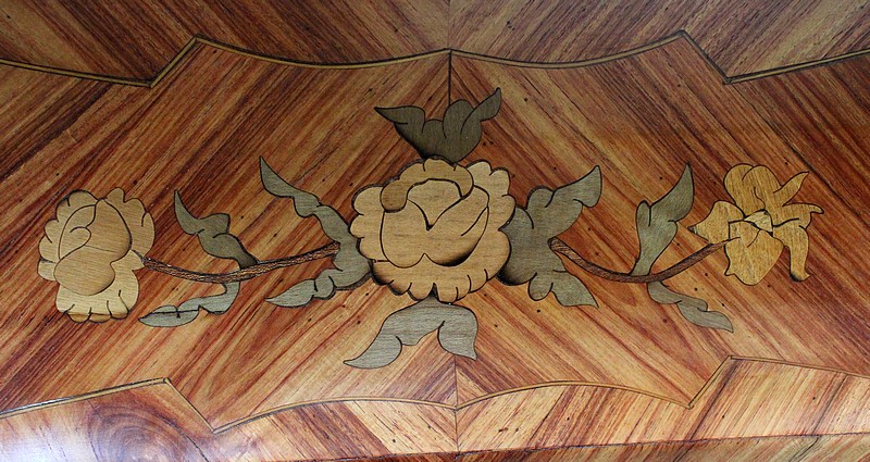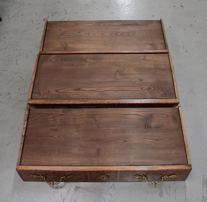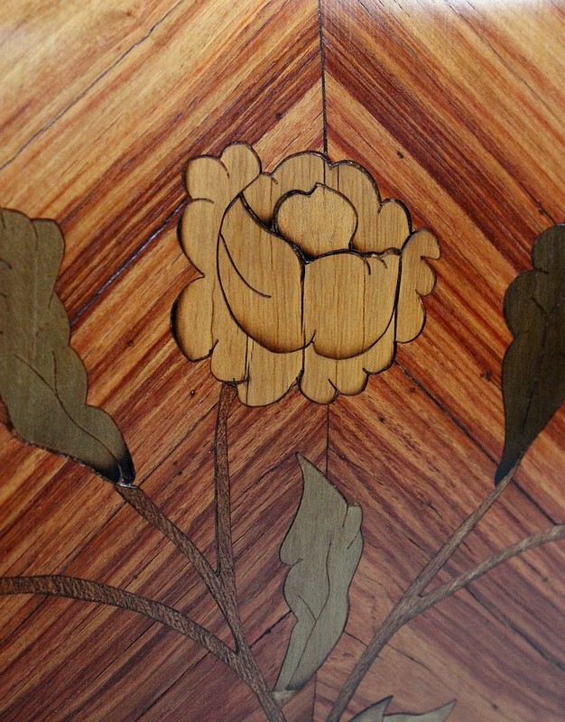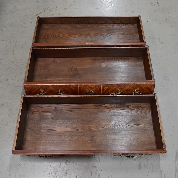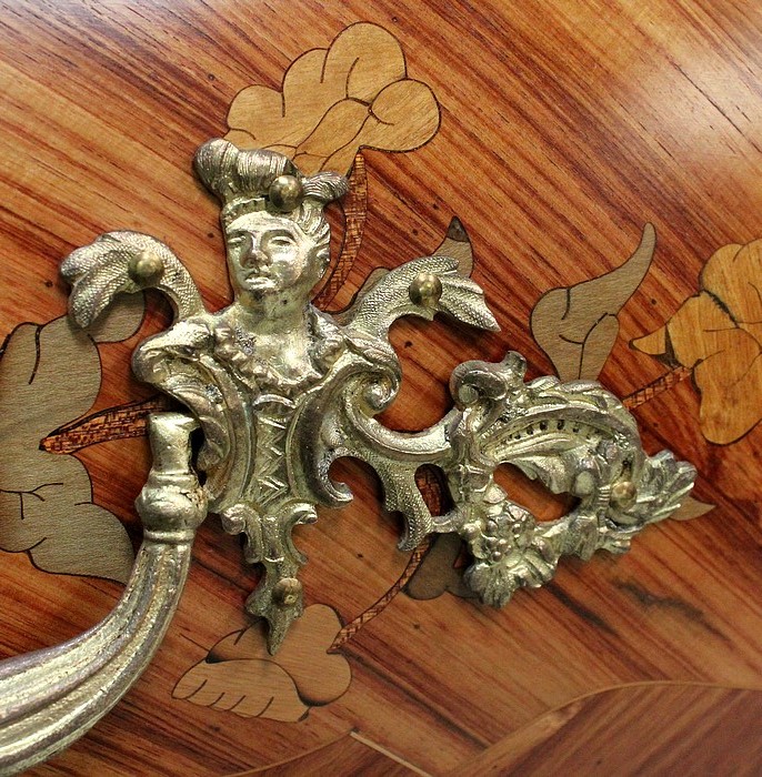 Ce meuble d’Apparat ouvre par trois grands tiroirs aux profondeurs variées, organisés sur trois rangs et assemblés en « Queues d’Arondes ». Leurs façades, tout comme les côtés de cette Commode, bénéficient d’un épais Placage de Bois de Rose harmonieusement disposé en frises et chevrons, et arborent des Marqueteries fleuries en Bois clairs et teinté Vert. Chacun des ces tiroirs est pourvu au centre d’une entrée de serrure – réelle pour la première, fictives pour les deux suivantes – et de deux poignées tombantes « aux Valets » en Bronze. Le meuble est fourni avec sa clé.